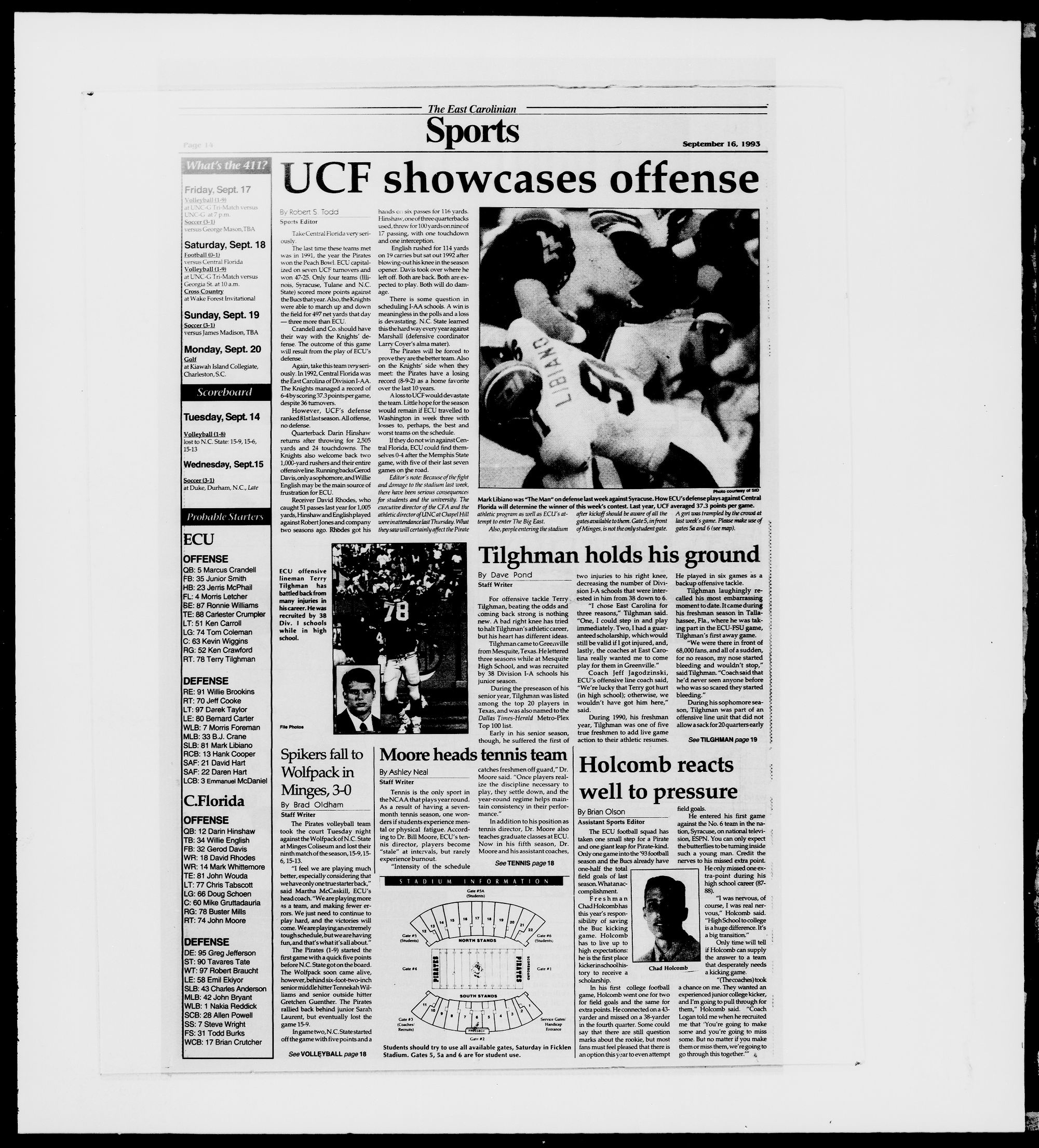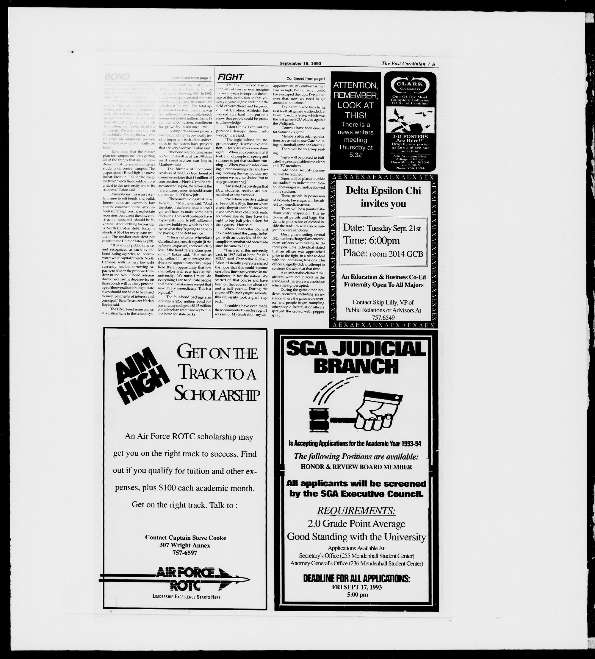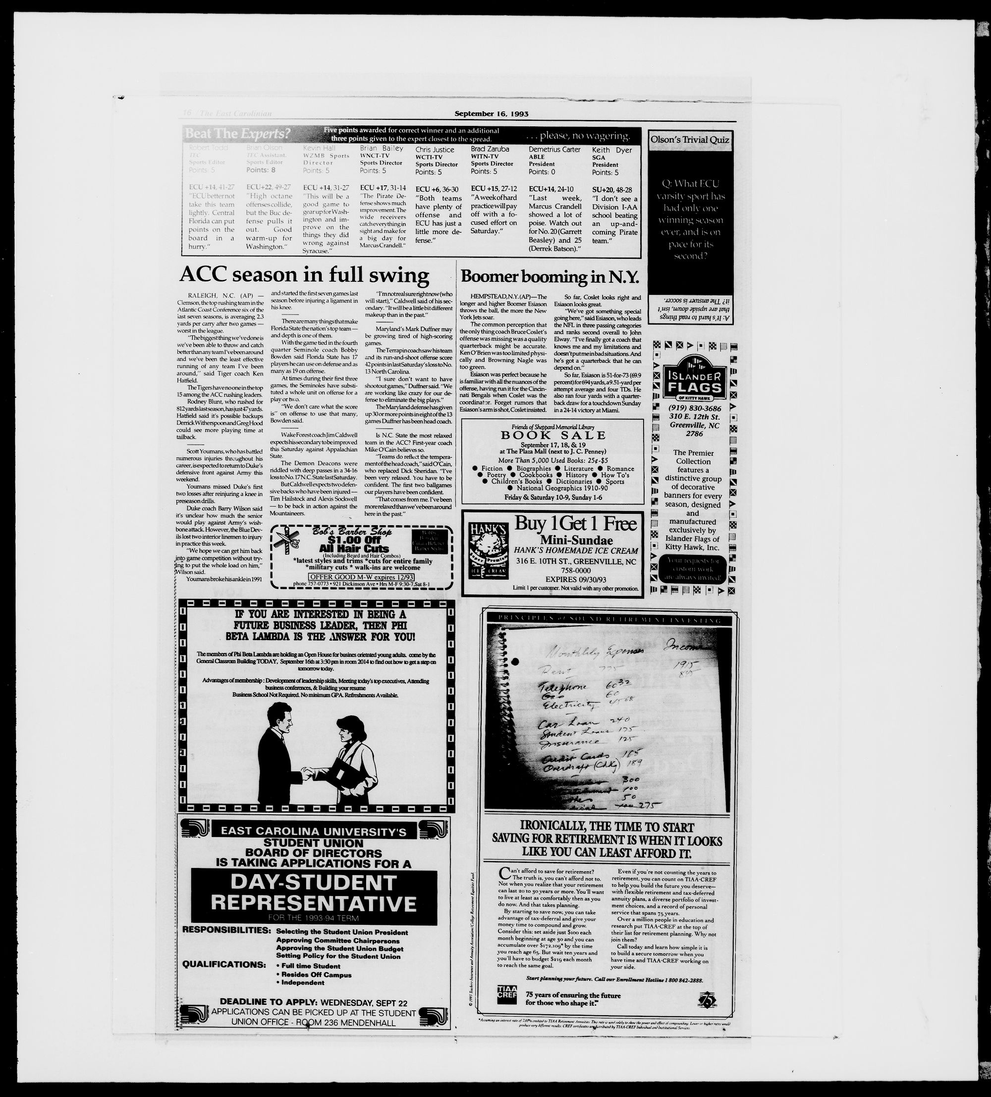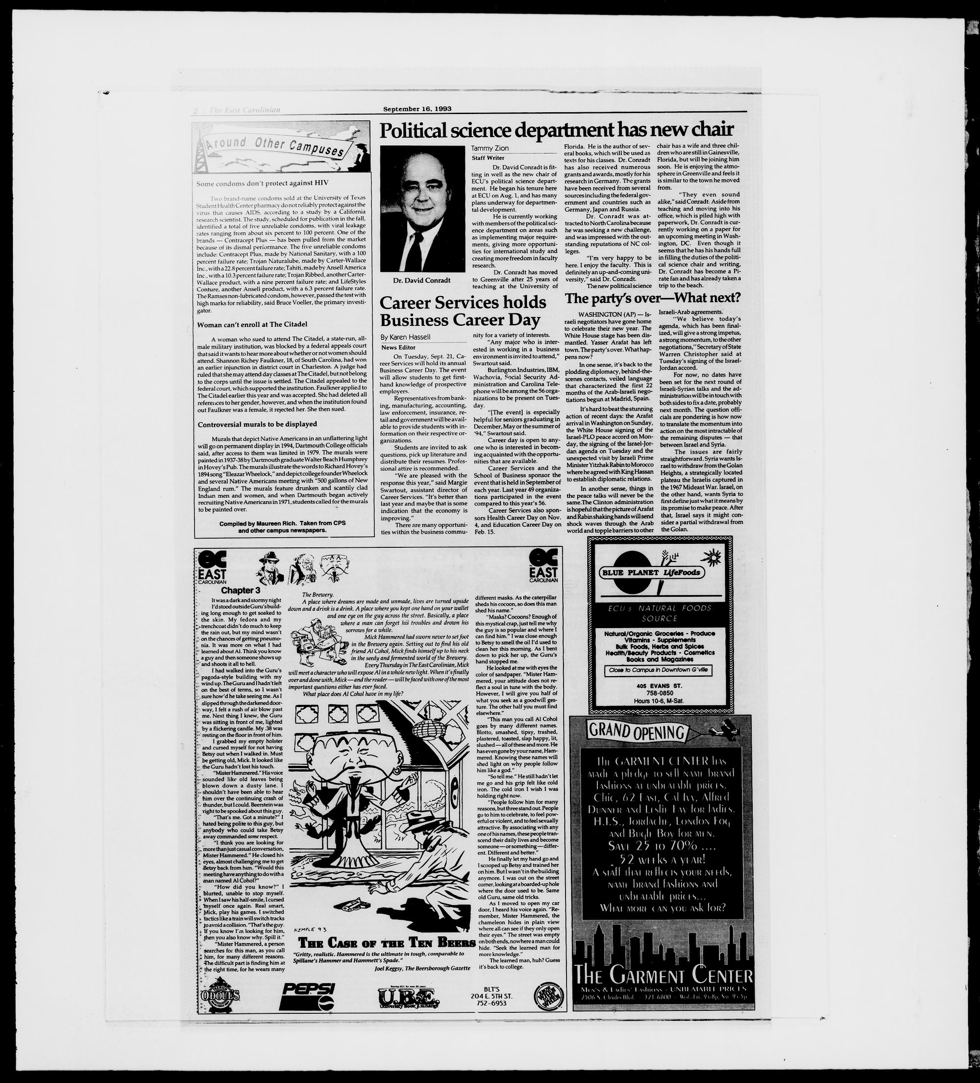 East Carolina's student-run campus newspaper was first published in 1923 as the East Carolina Teachers College News (1923-1925). It has been re-named as The Teco Echo (1925, 1926-1952), East Carolinian (1952-1969), Fountainhead (1969-1979), and The East Carolinian (1969, 1979-present). It includes local, state, national, and international stories with a focus on campus events.
