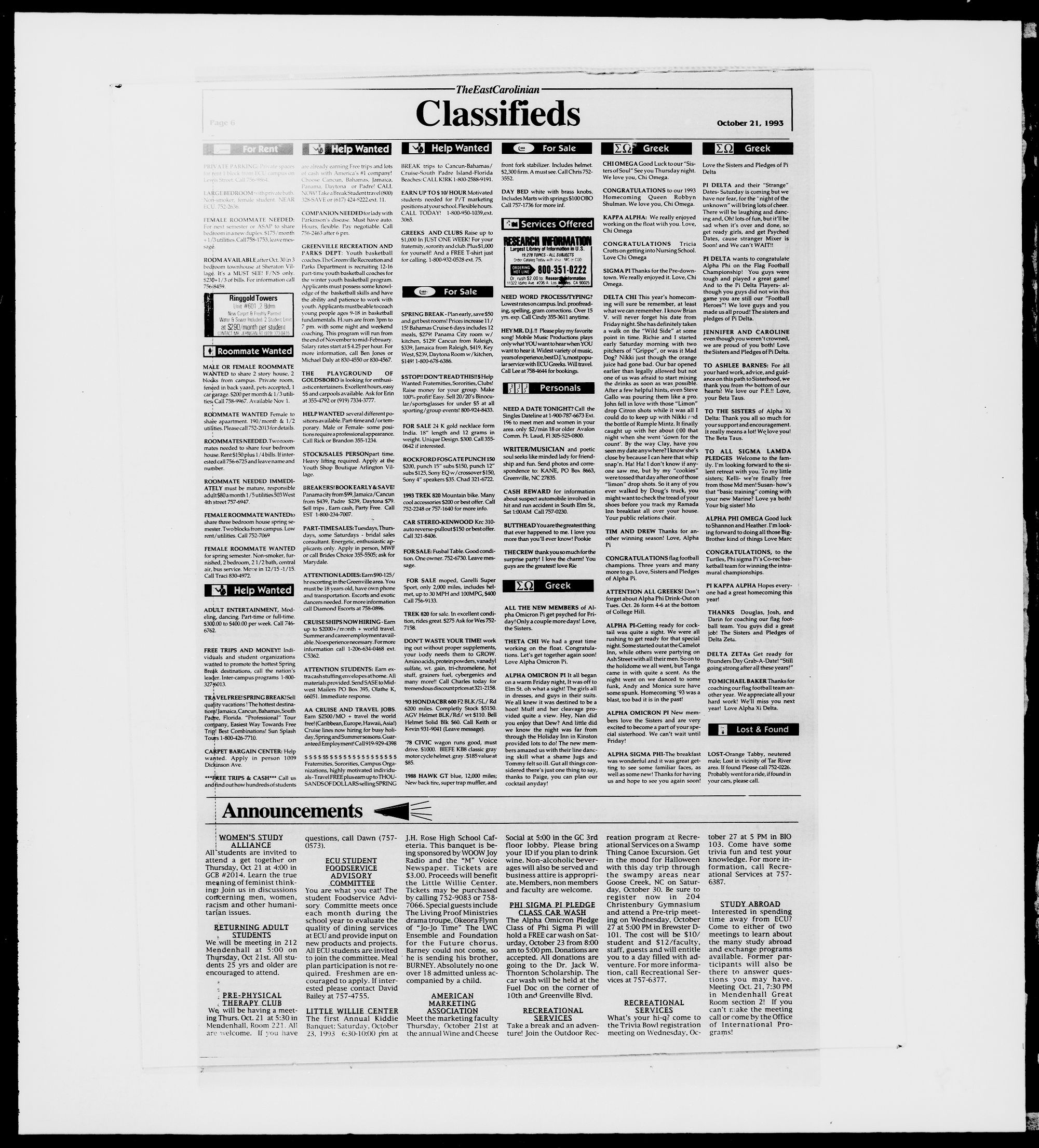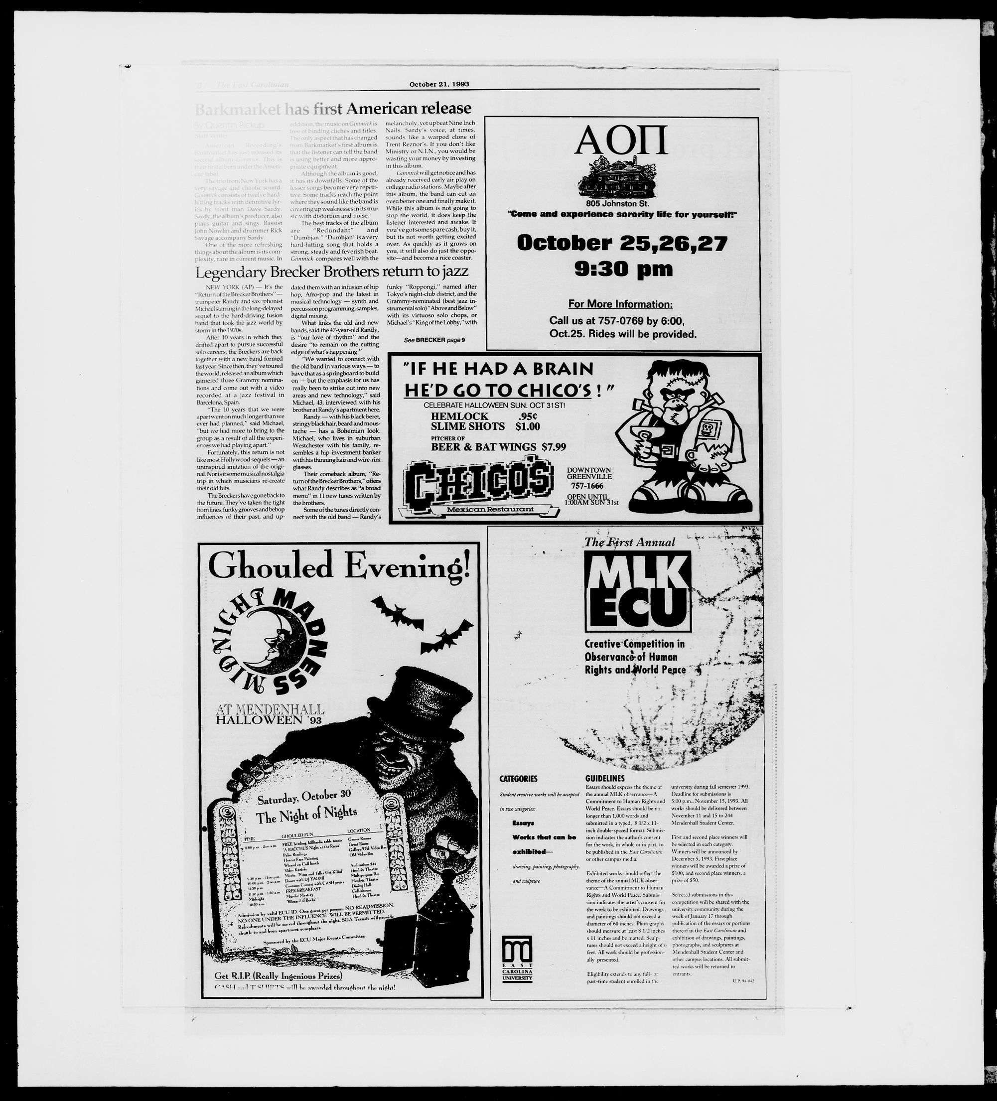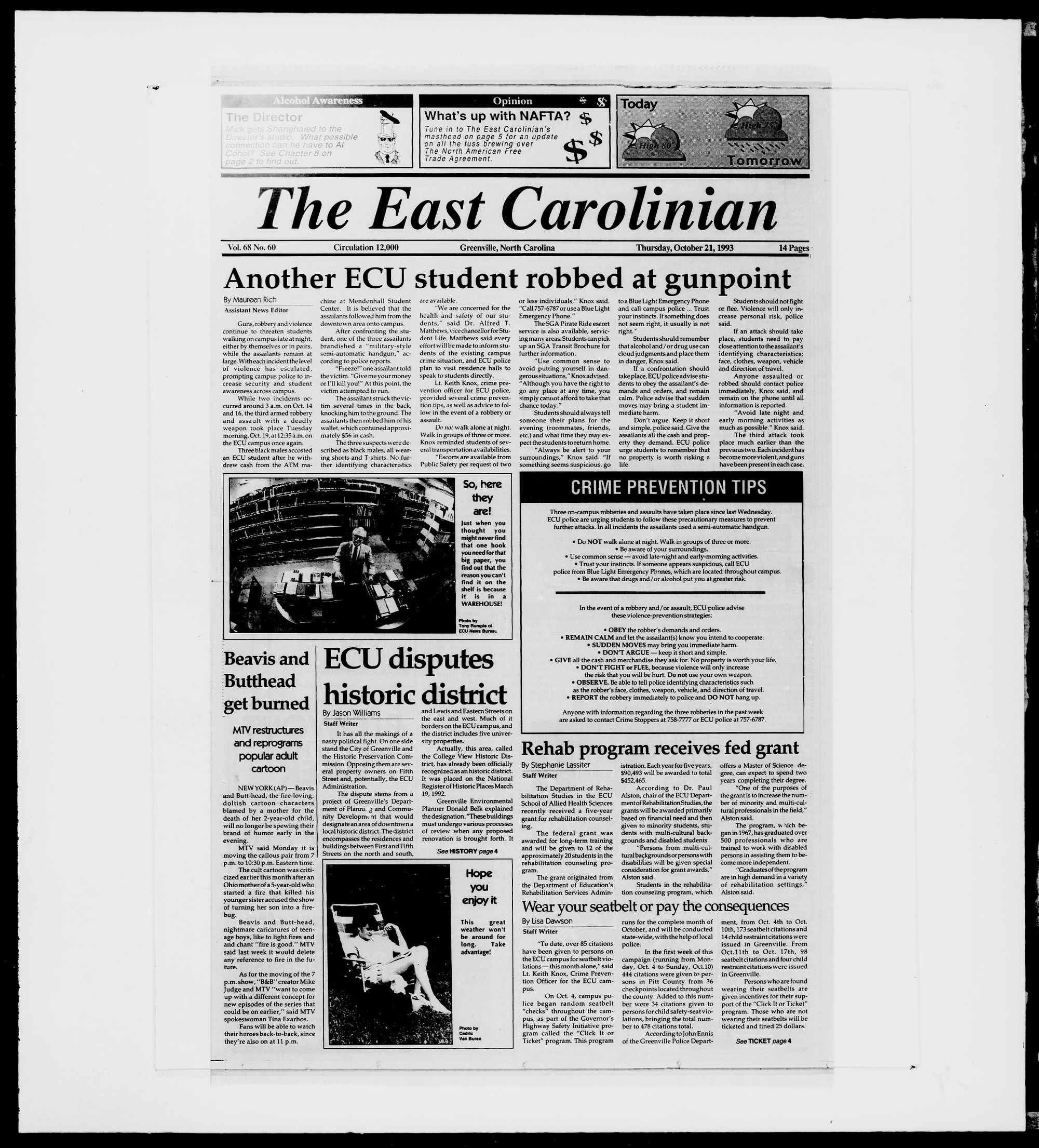 East Carolina's student-run campus newspaper was first published in 1923 as the East Carolina Teachers College News (1923-1925). It has been re-named as The Teco Echo (1925, 1926-1952), East Carolinian (1952-1969), Fountainhead (1969-1979), and The East Carolinian (1969, 1979-present). It includes local, state, national, and international stories with a focus on campus events.