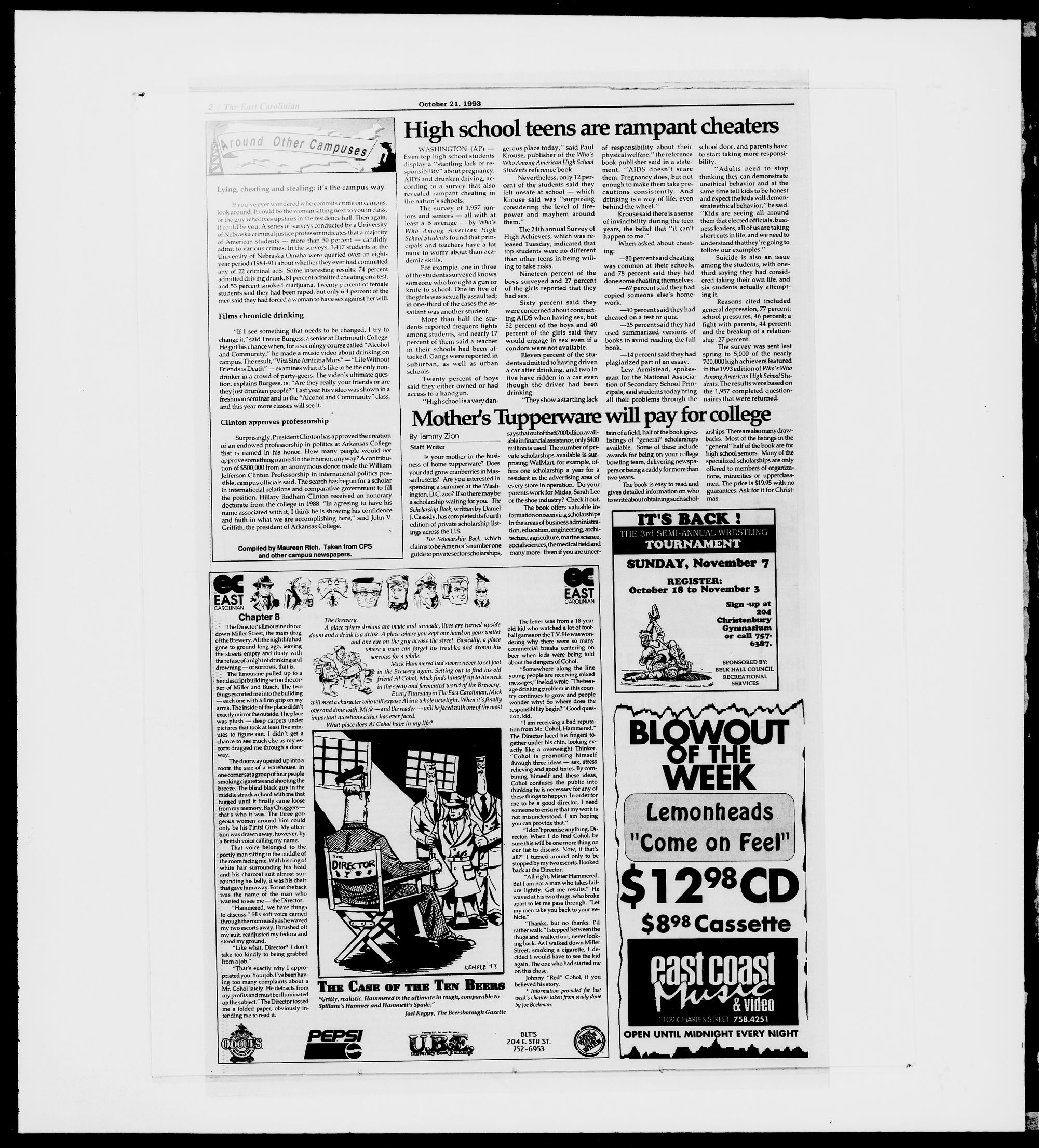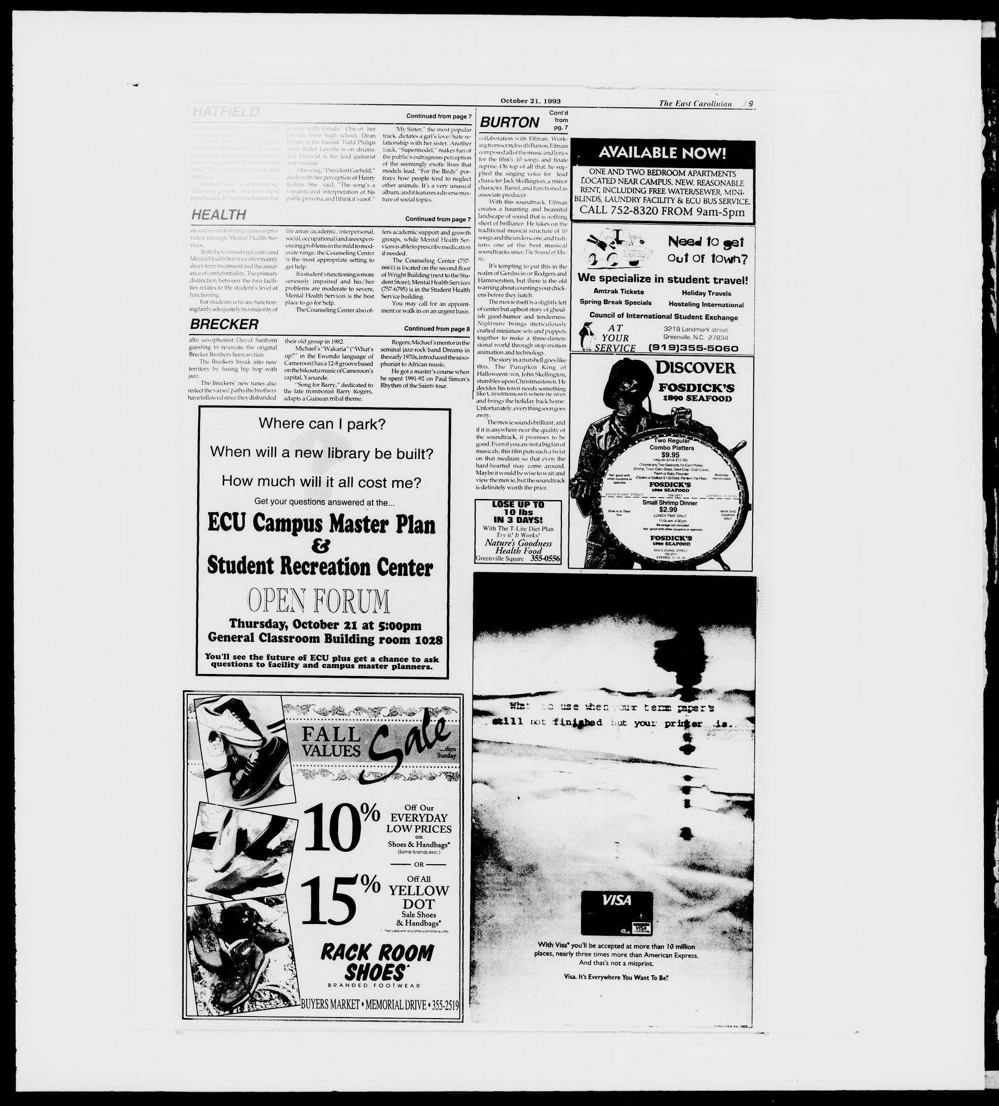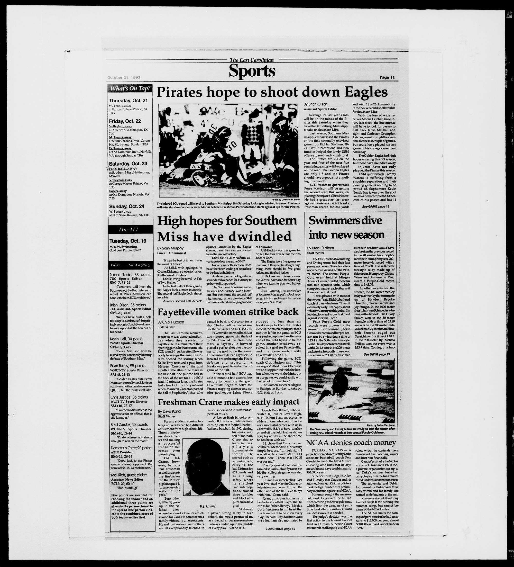 East Carolina's student-run campus newspaper was first published in 1923 as the East Carolina Teachers College News (1923-1925). It has been re-named as The Teco Echo (1925, 1926-1952), East Carolinian (1952-1969), Fountainhead (1969-1979), and The East Carolinian (1969, 1979-present). It includes local, state, national, and international stories with a focus on campus events.