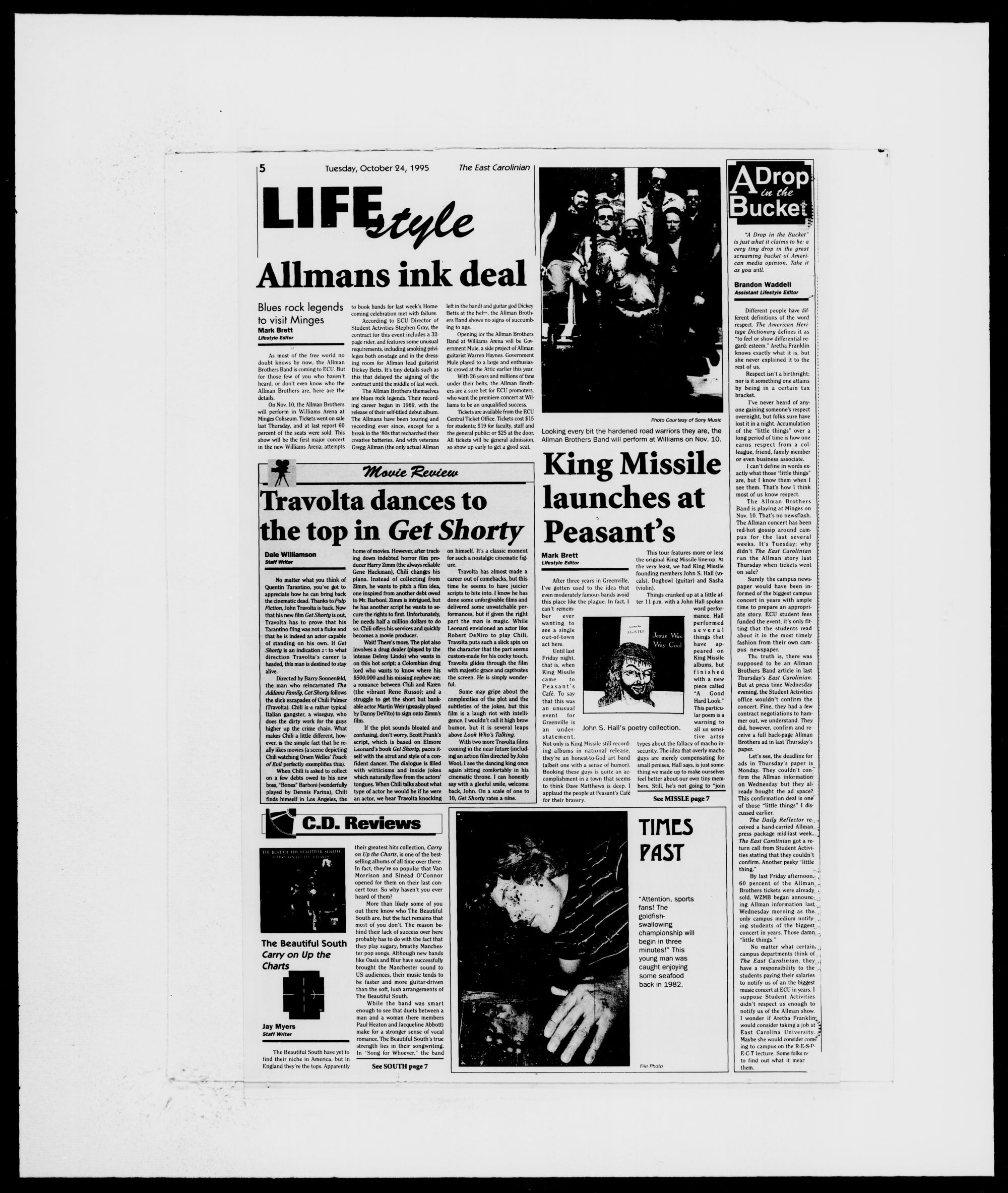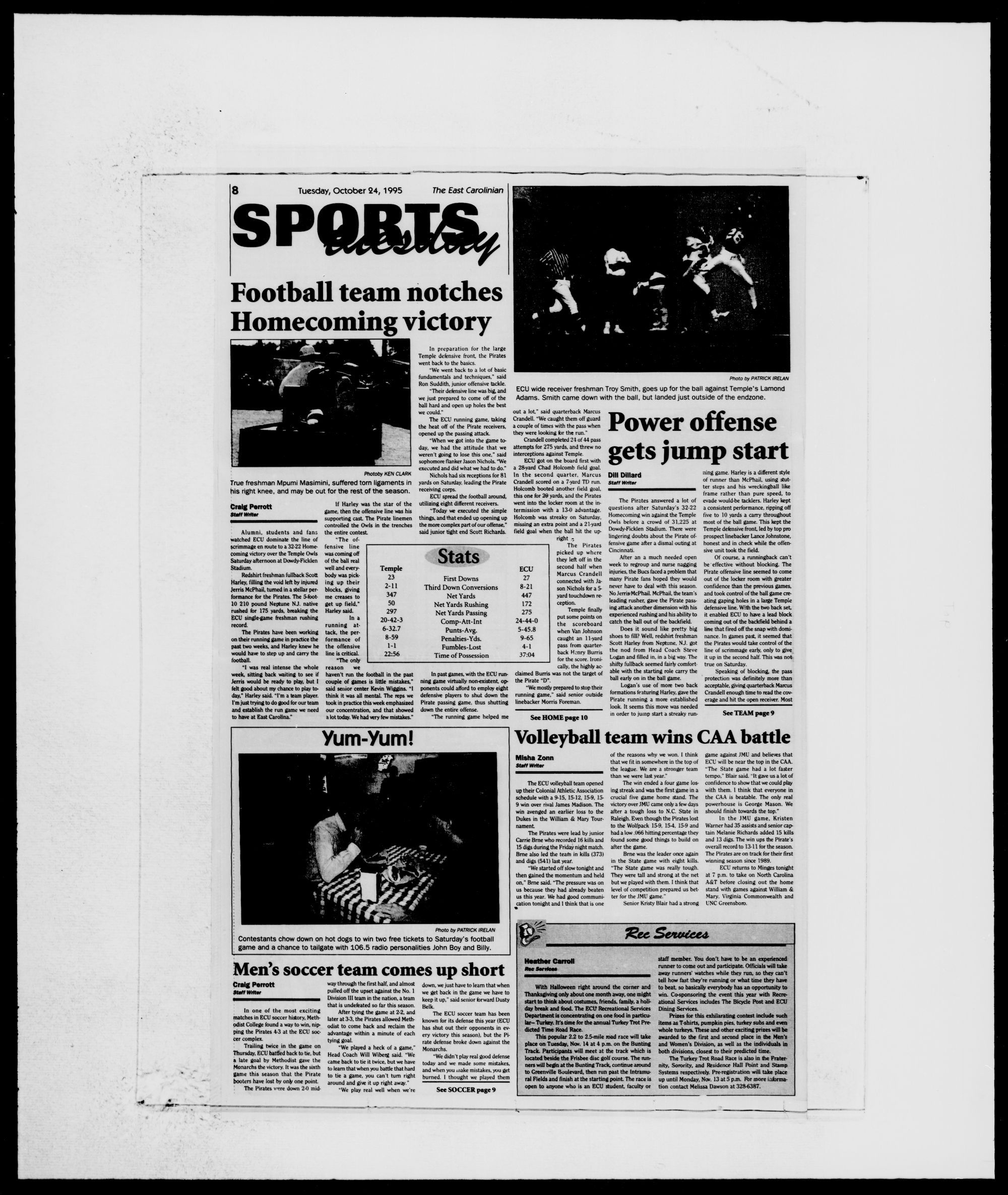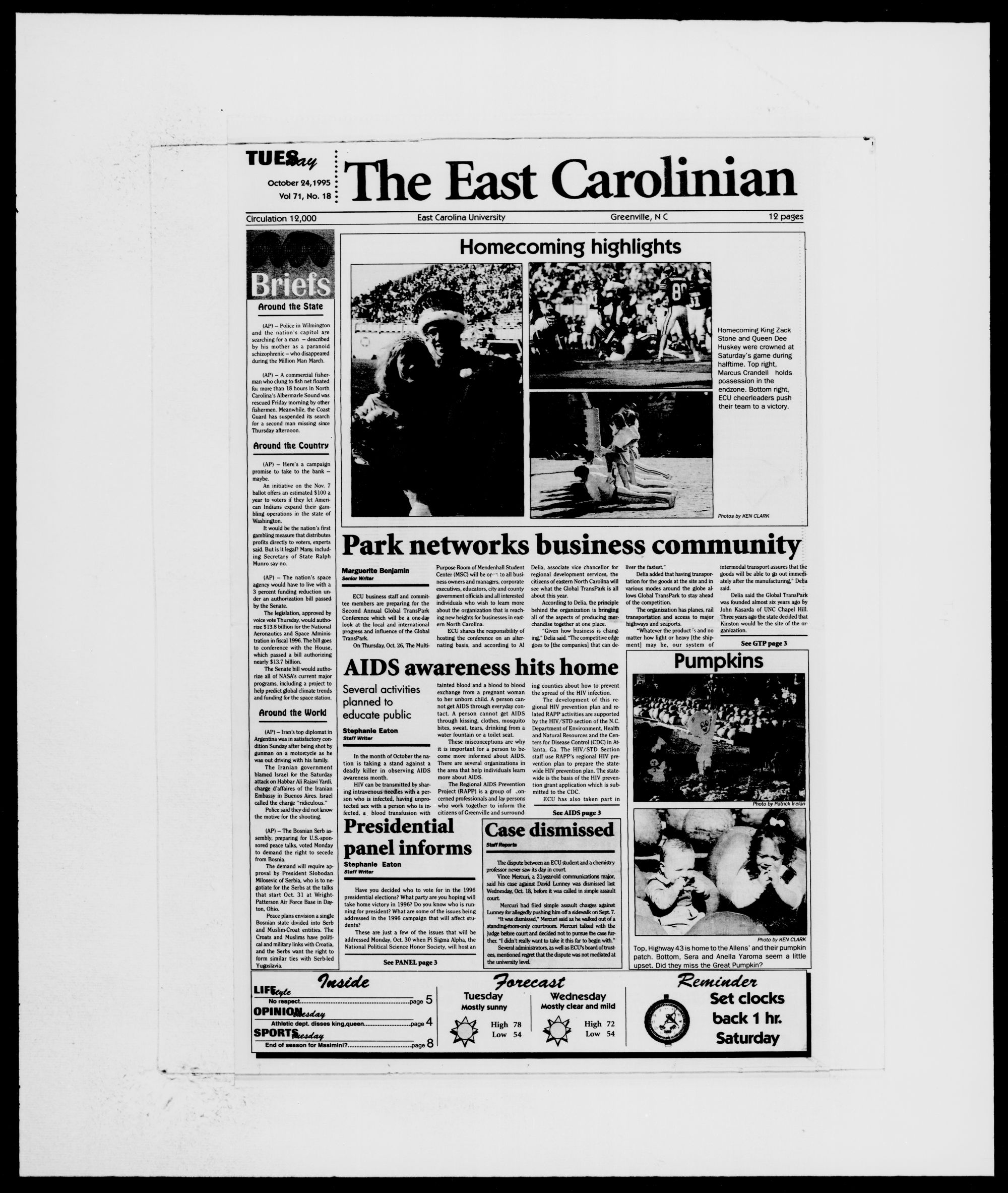 East Carolina's student-run campus newspaper was first published in 1923 as the East Carolina Teachers College News (1923-1925). It has been re-named as The Teco Echo (1925, 1926-1952), East Carolinian (1952-1969), Fountainhead (1969-1979), and The East Carolinian (1969, 1979-present). It includes local, state, national, and international stories with a focus on campus events.