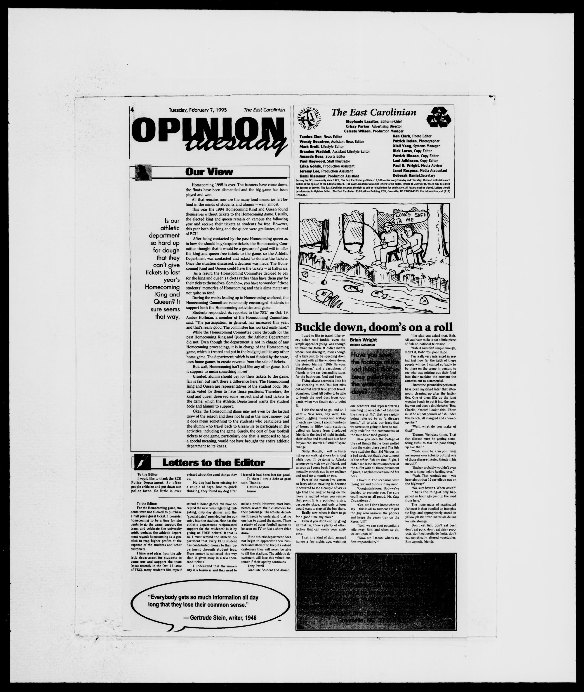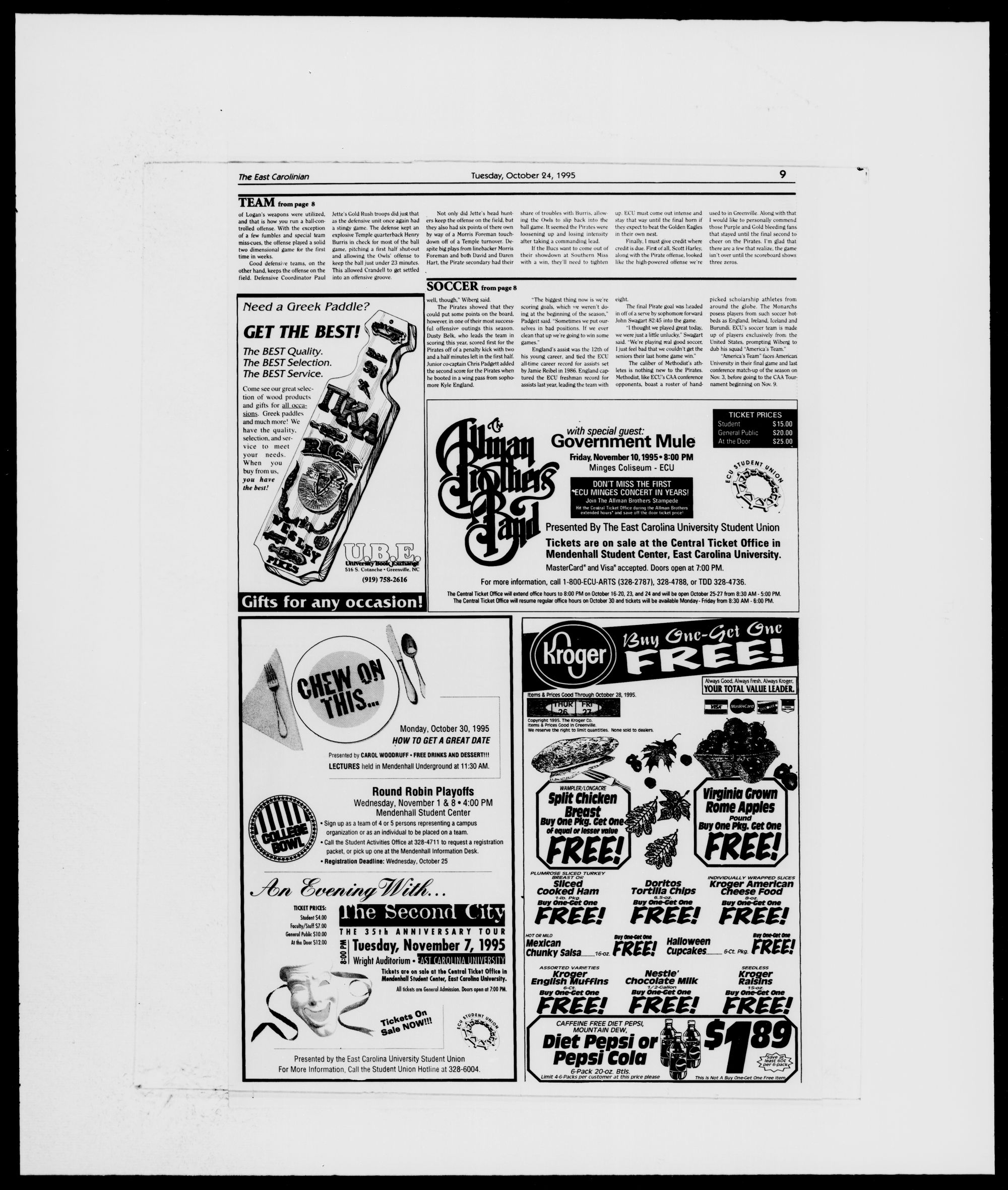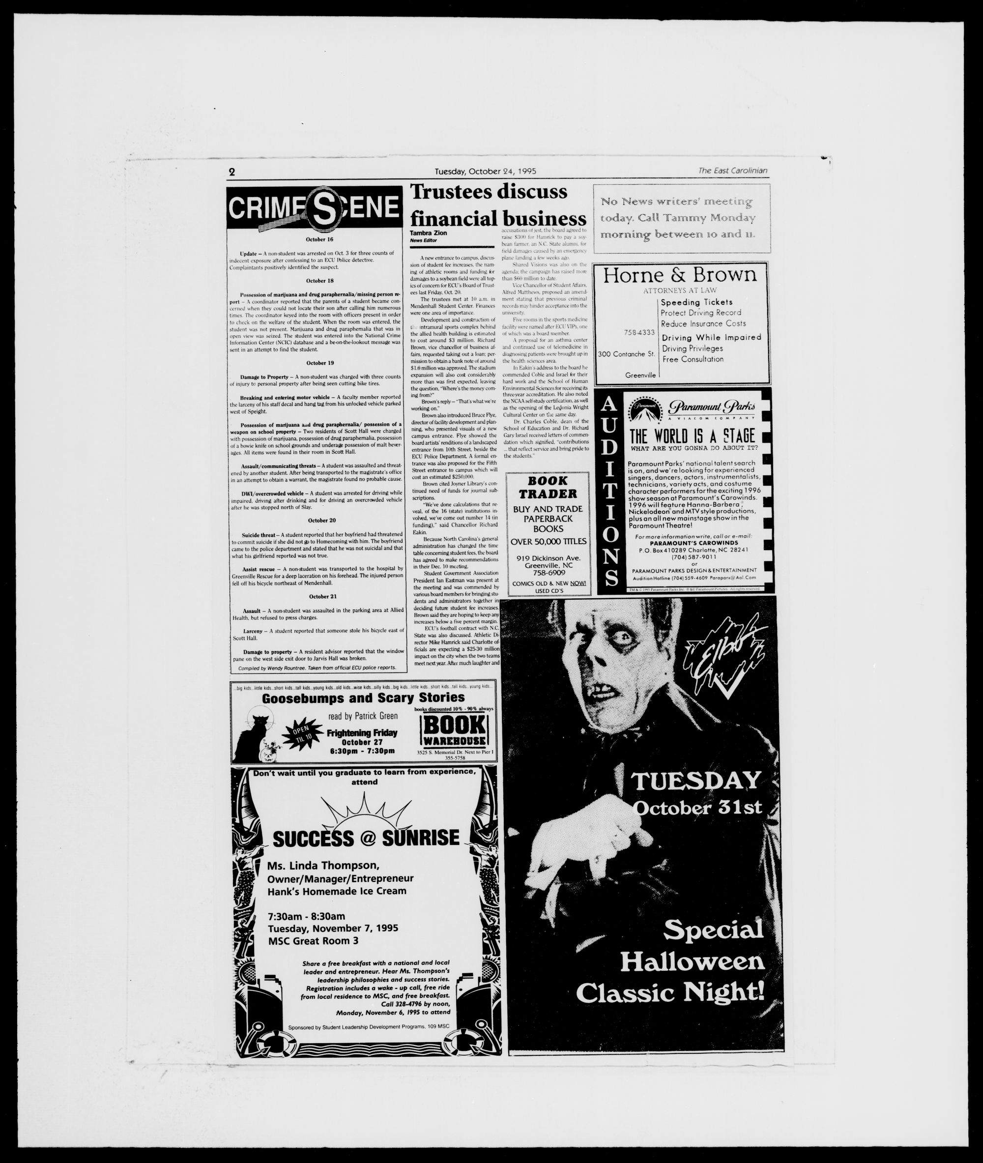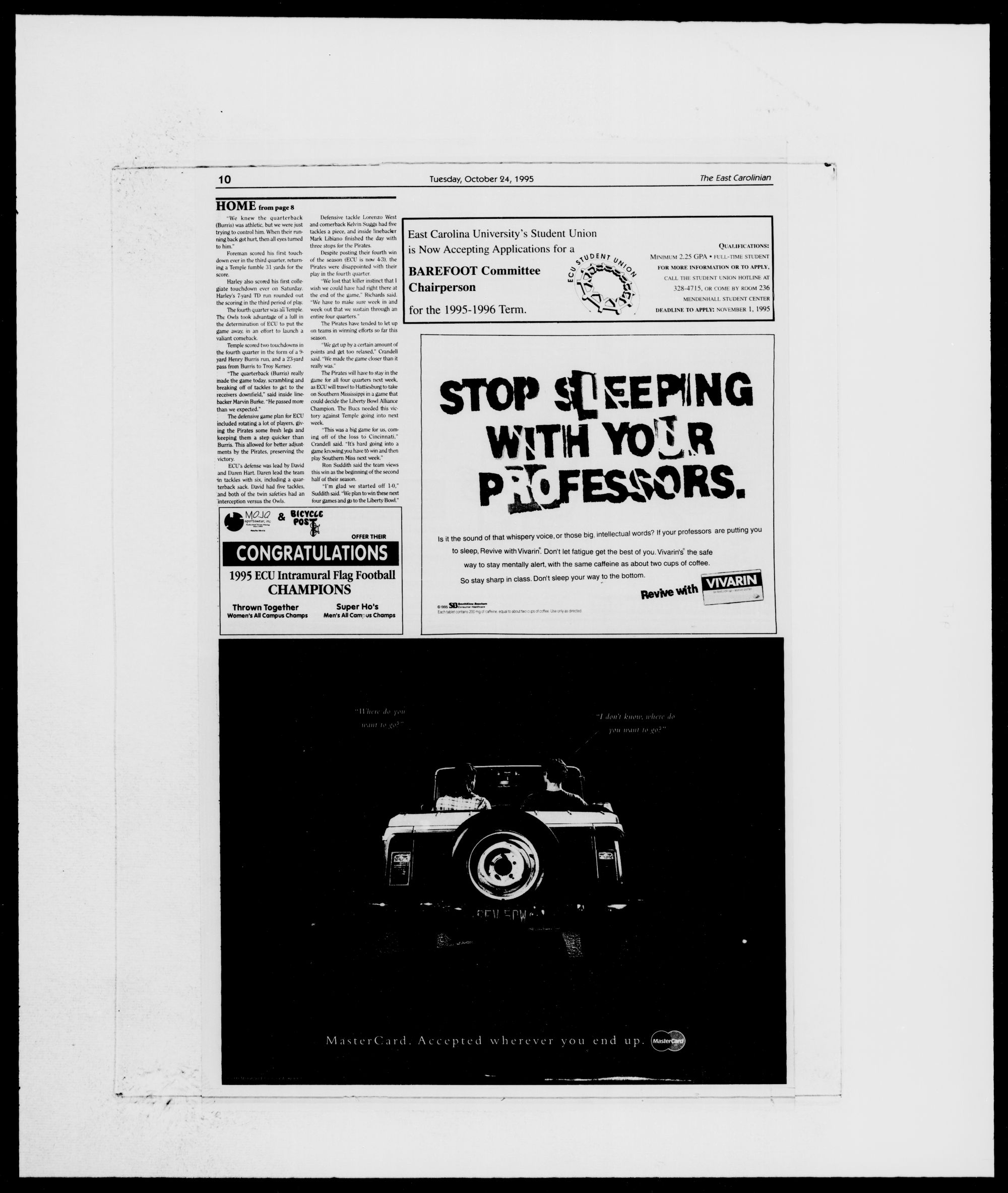 East Carolina's student-run campus newspaper was first published in 1923 as the East Carolina Teachers College News (1923-1925). It has been re-named as The Teco Echo (1925, 1926-1952), East Carolinian (1952-1969), Fountainhead (1969-1979), and The East Carolinian (1969, 1979-present). It includes local, state, national, and international stories with a focus on campus events.