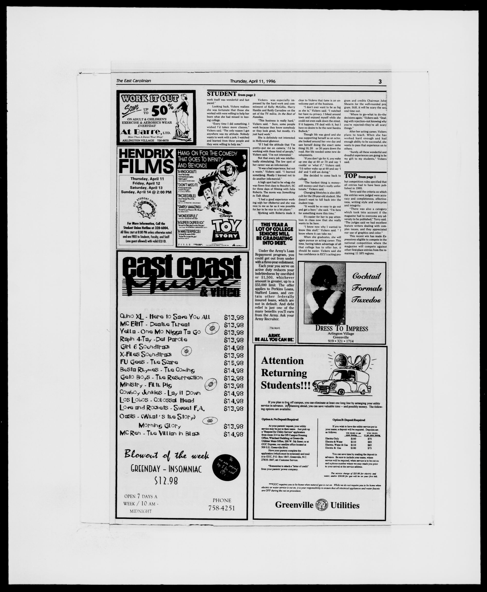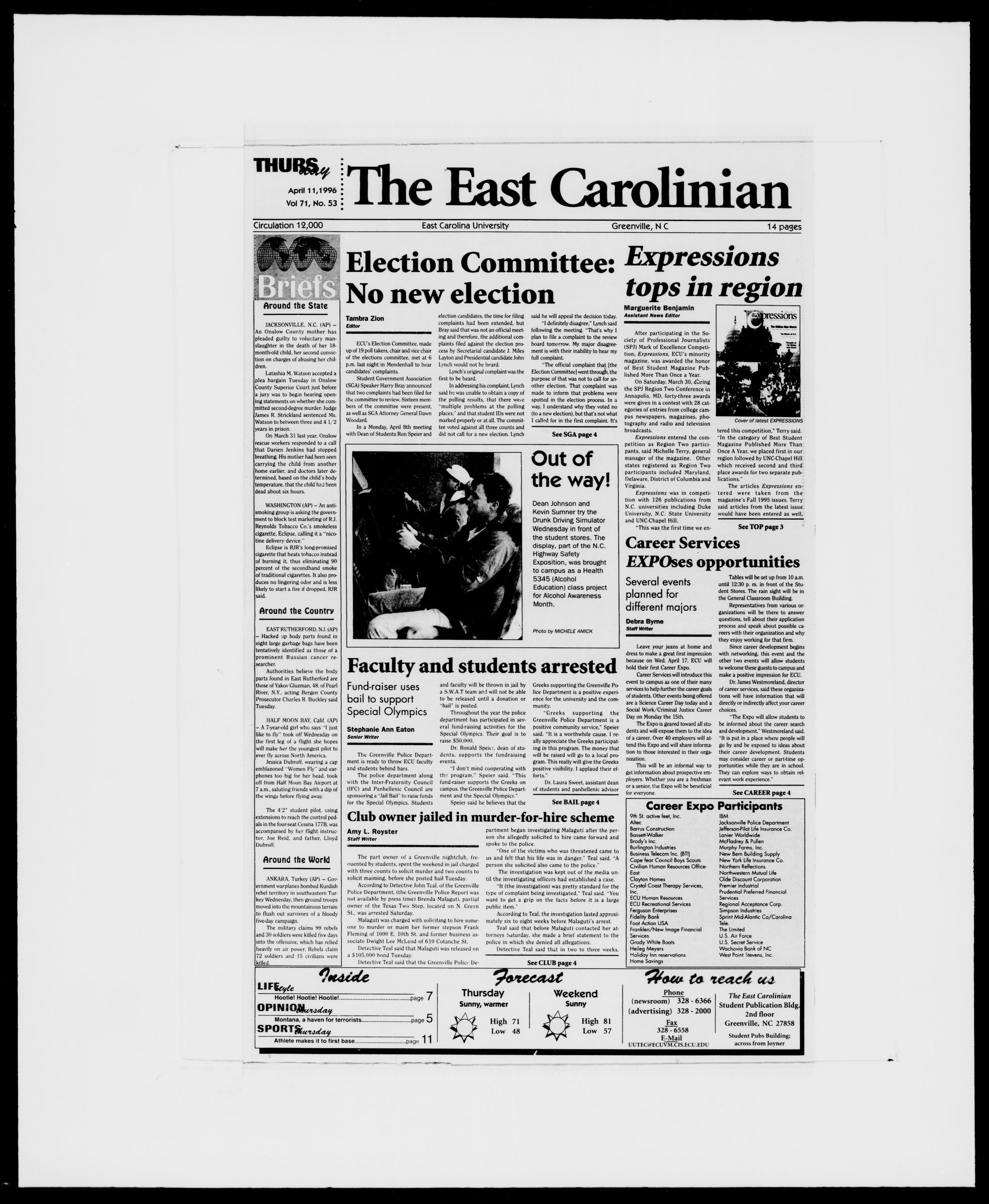 East Carolina's student-run campus newspaper was first published in 1923 as the East Carolina Teachers College News (1923-1925). It has been re-named as The Teco Echo (1925, 1926-1952), East Carolinian (1952-1969), Fountainhead (1969-1979), and The East Carolinian (1969, 1979-present). It includes local, state, national, and international stories with a focus on campus events.