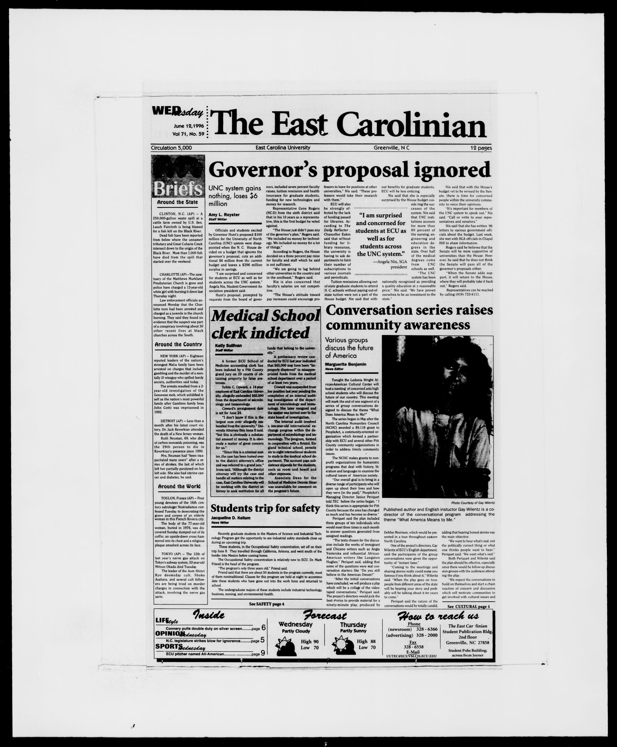 East Carolina's student-run campus newspaper was first published in 1923 as the East Carolina Teachers College News (1923-1925). It has been re-named as The Teco Echo (1925, 1926-1952), East Carolinian (1952-1969), Fountainhead (1969-1979), and The East Carolinian (1969, 1979-present). It includes local, state, national, and international stories with a focus on campus events.