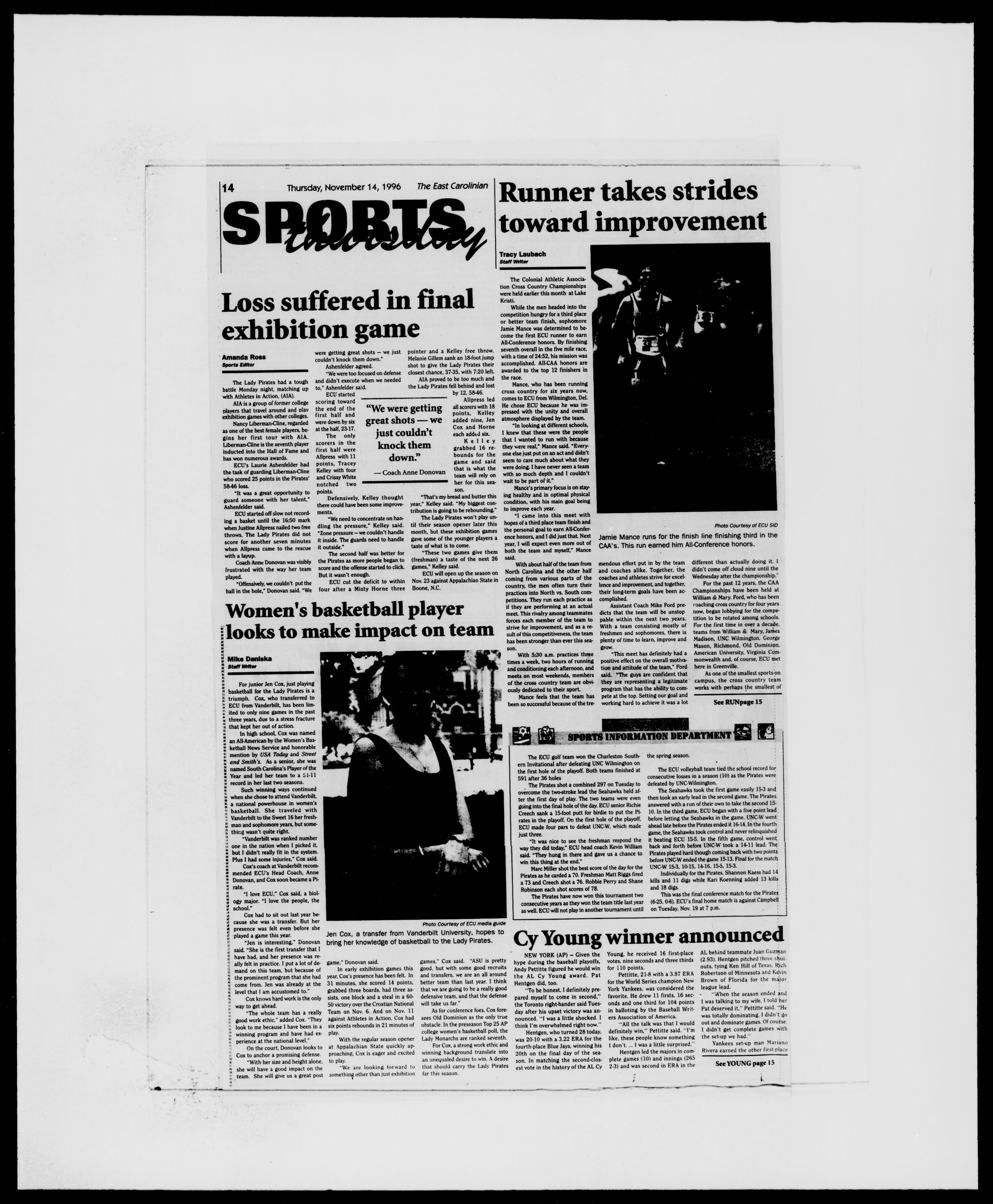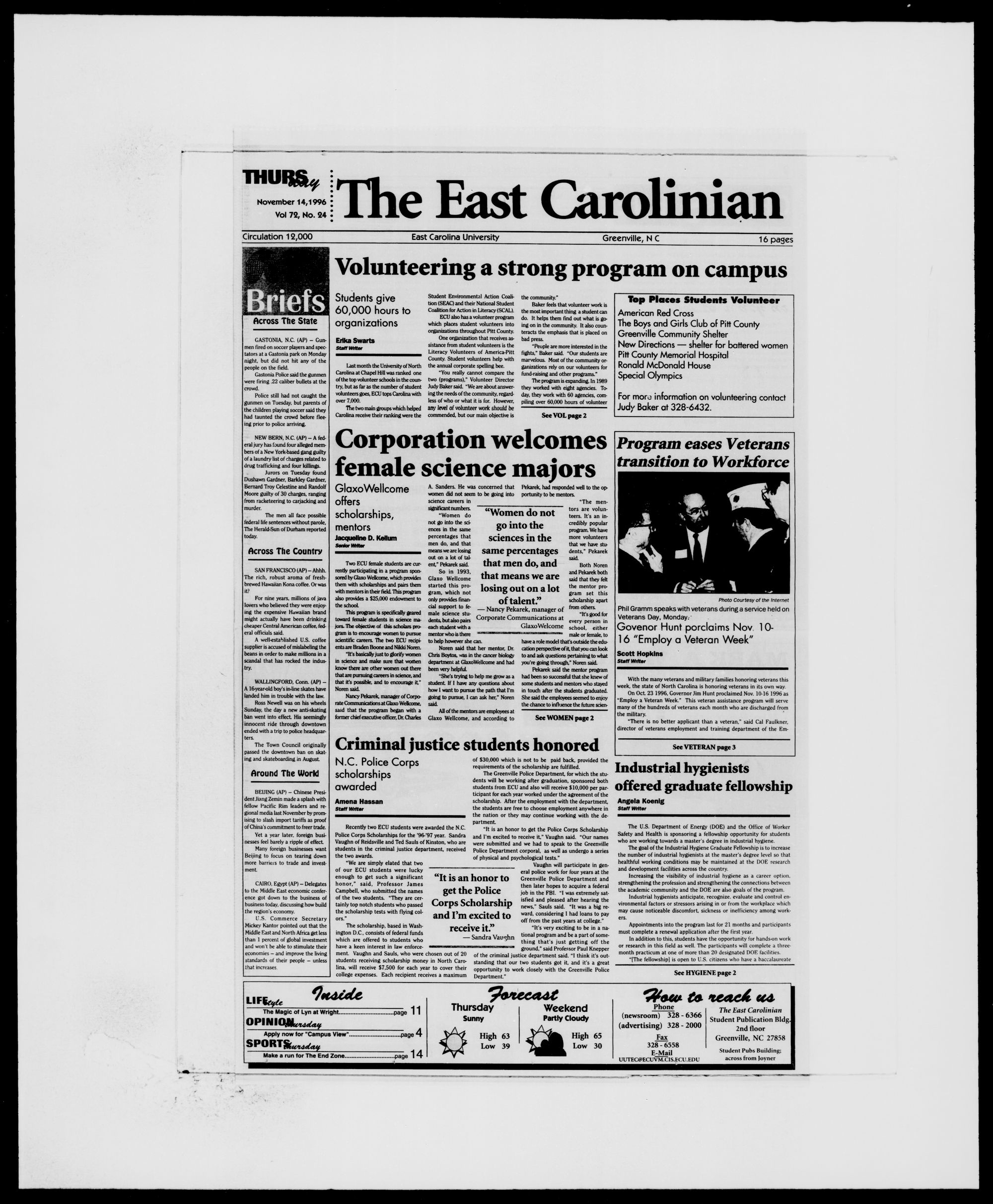 East Carolina's student-run campus newspaper was first published in 1923 as the East Carolina Teachers College News (1923-1925). It has been re-named as The Teco Echo (1925, 1926-1952), East Carolinian (1952-1969), Fountainhead (1969-1979), and The East Carolinian (1969, 1979-present). It includes local, state, national, and international stories with a focus on campus events.