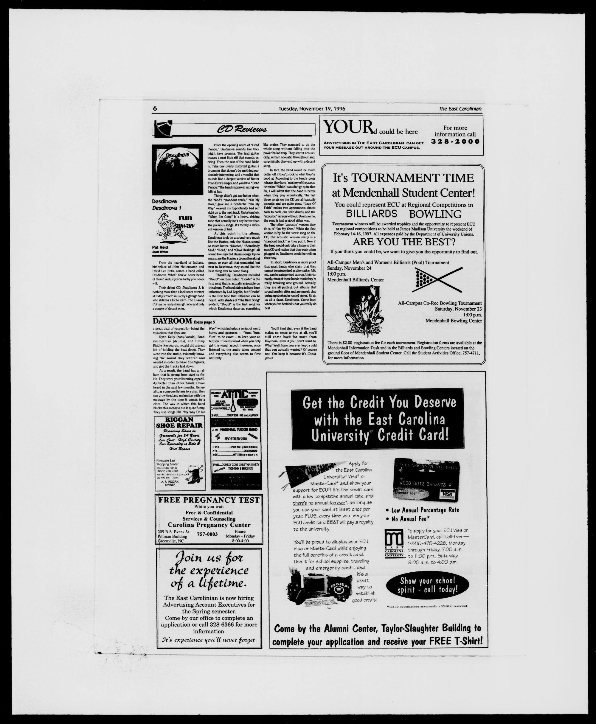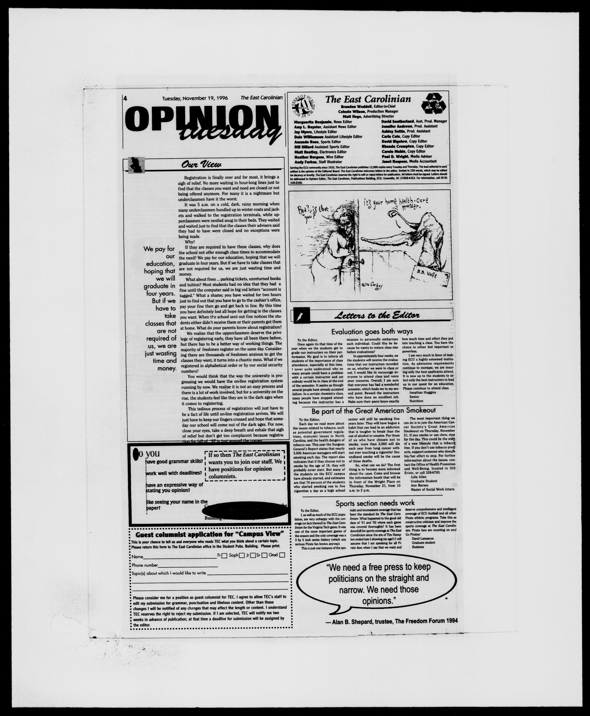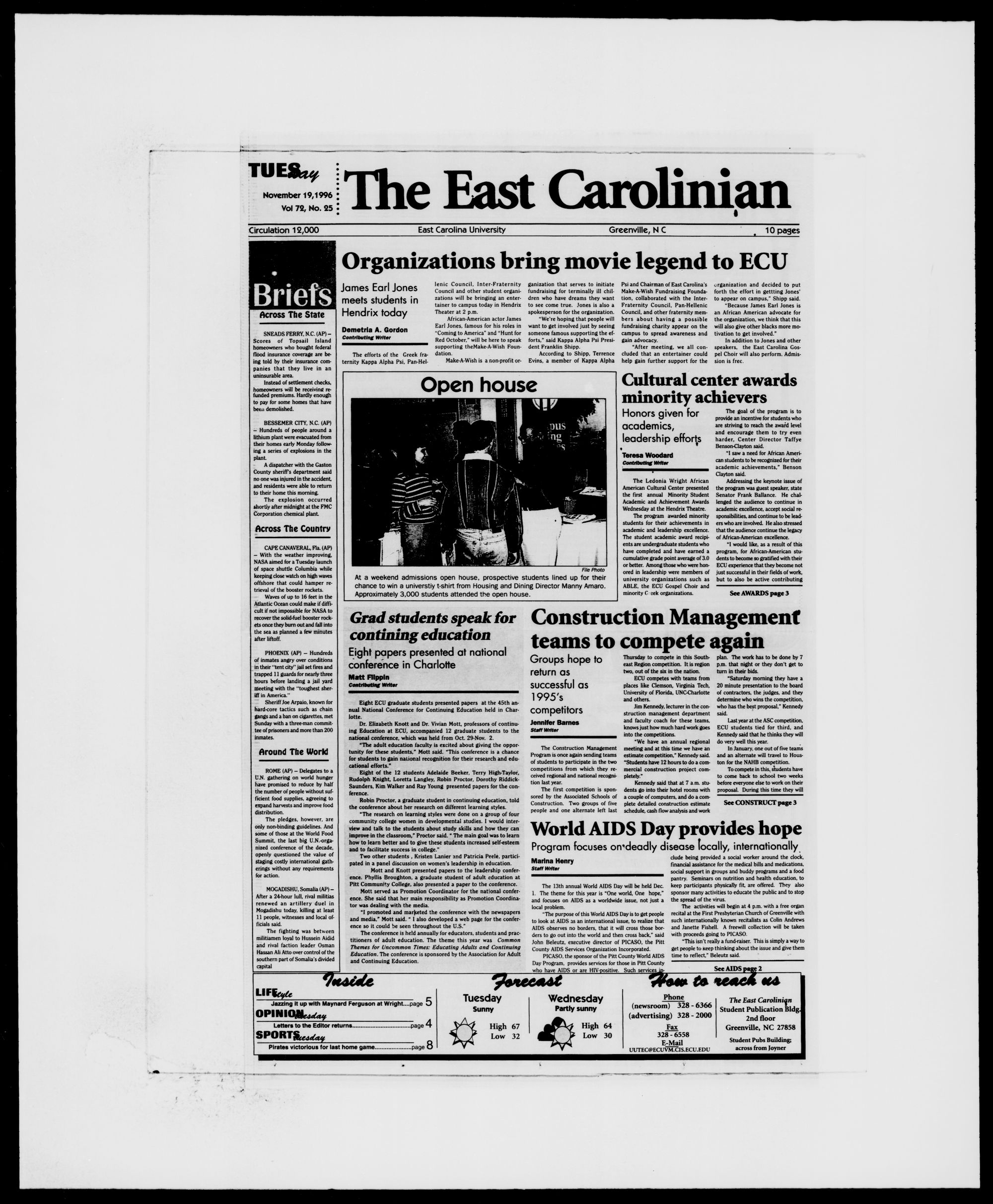 East Carolina's student-run campus newspaper was first published in 1923 as the East Carolina Teachers College News (1923-1925). It has been re-named as The Teco Echo (1925, 1926-1952), East Carolinian (1952-1969), Fountainhead (1969-1979), and The East Carolinian (1969, 1979-present). It includes local, state, national, and international stories with a focus on campus events.