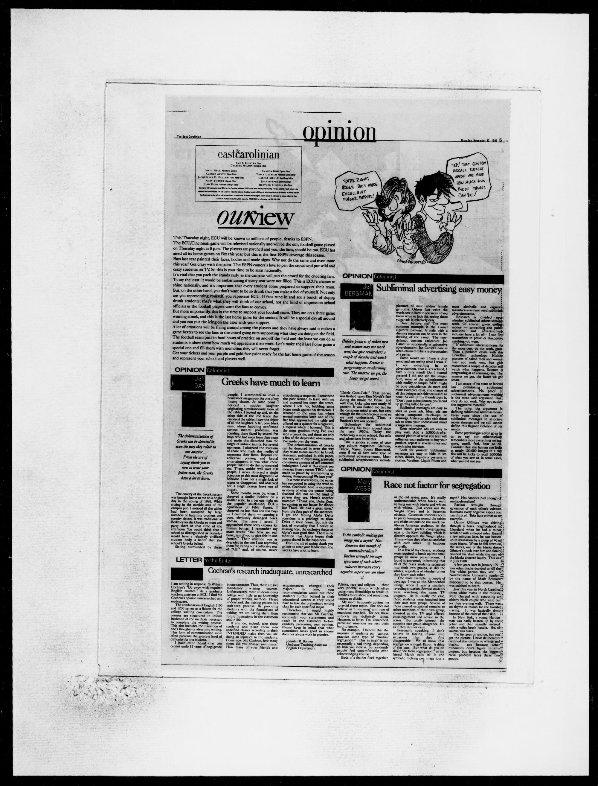Public access is provided to these resources to preserve the historical record. The content represents the opinions and actions of their creators and the culture in which they were produced. Therefore, some materials may contain language and imagery that is outdated, offensive and/or harmful. The content does not reflect the opinions, values, or beliefs of ECU Libraries.