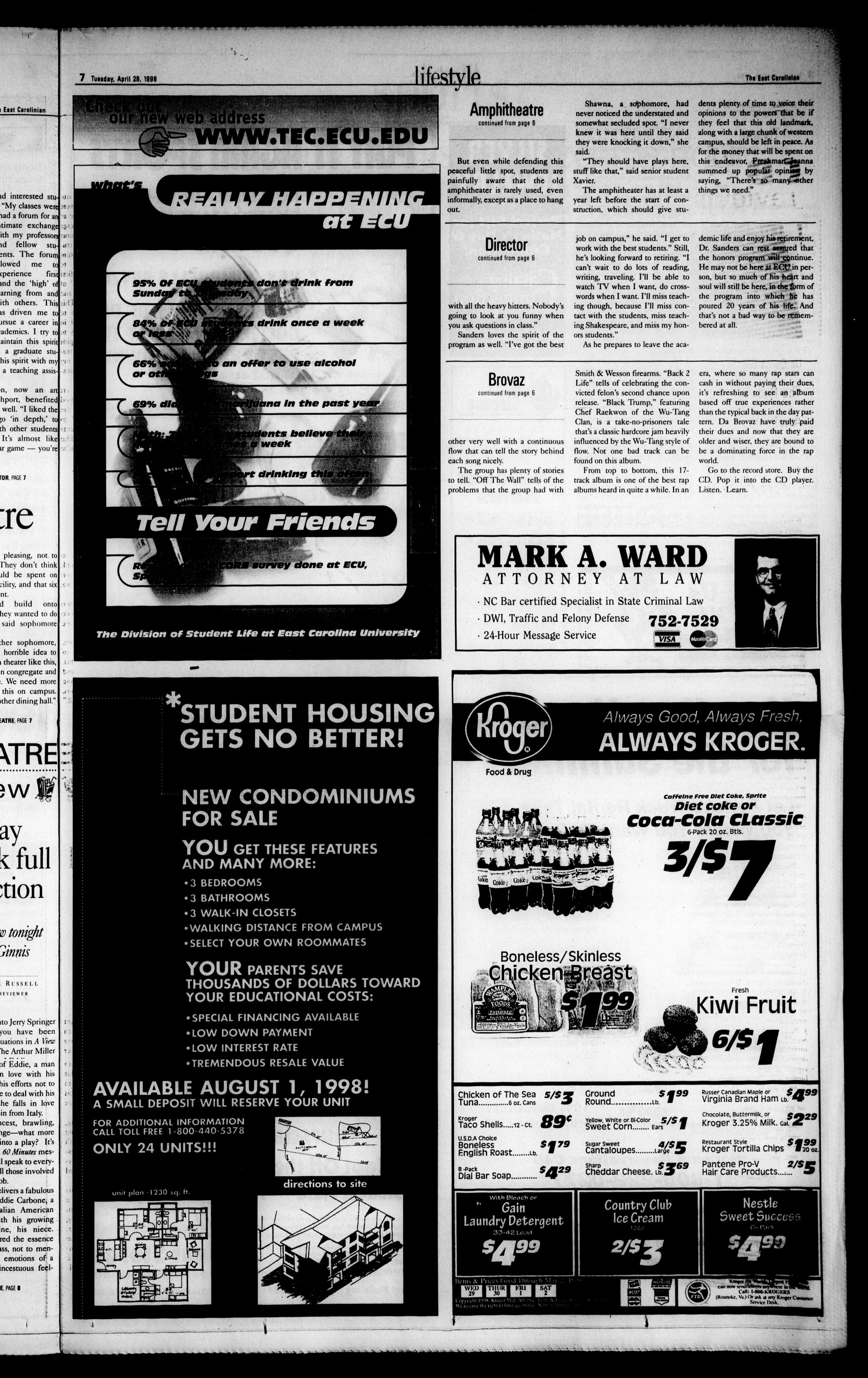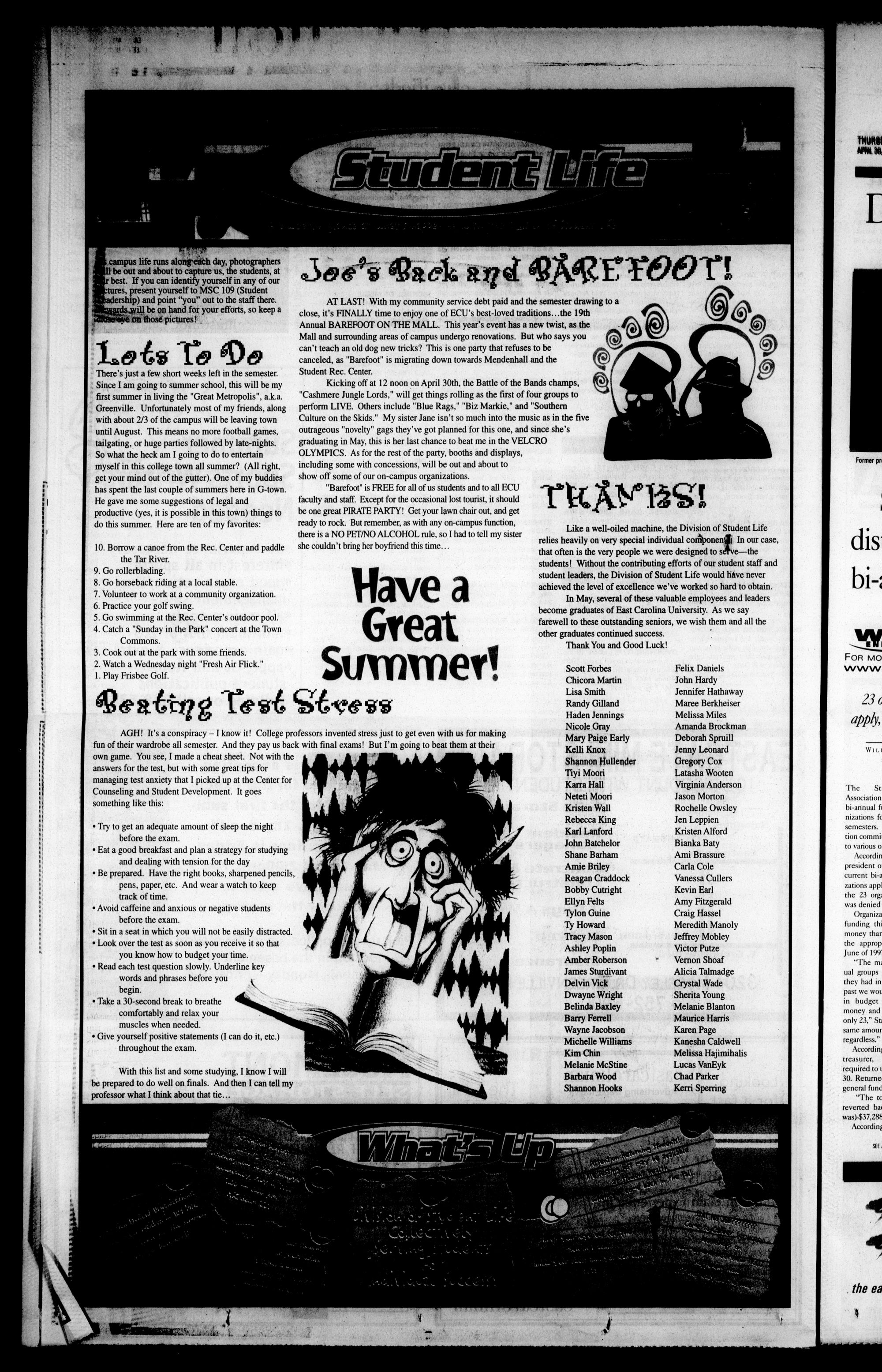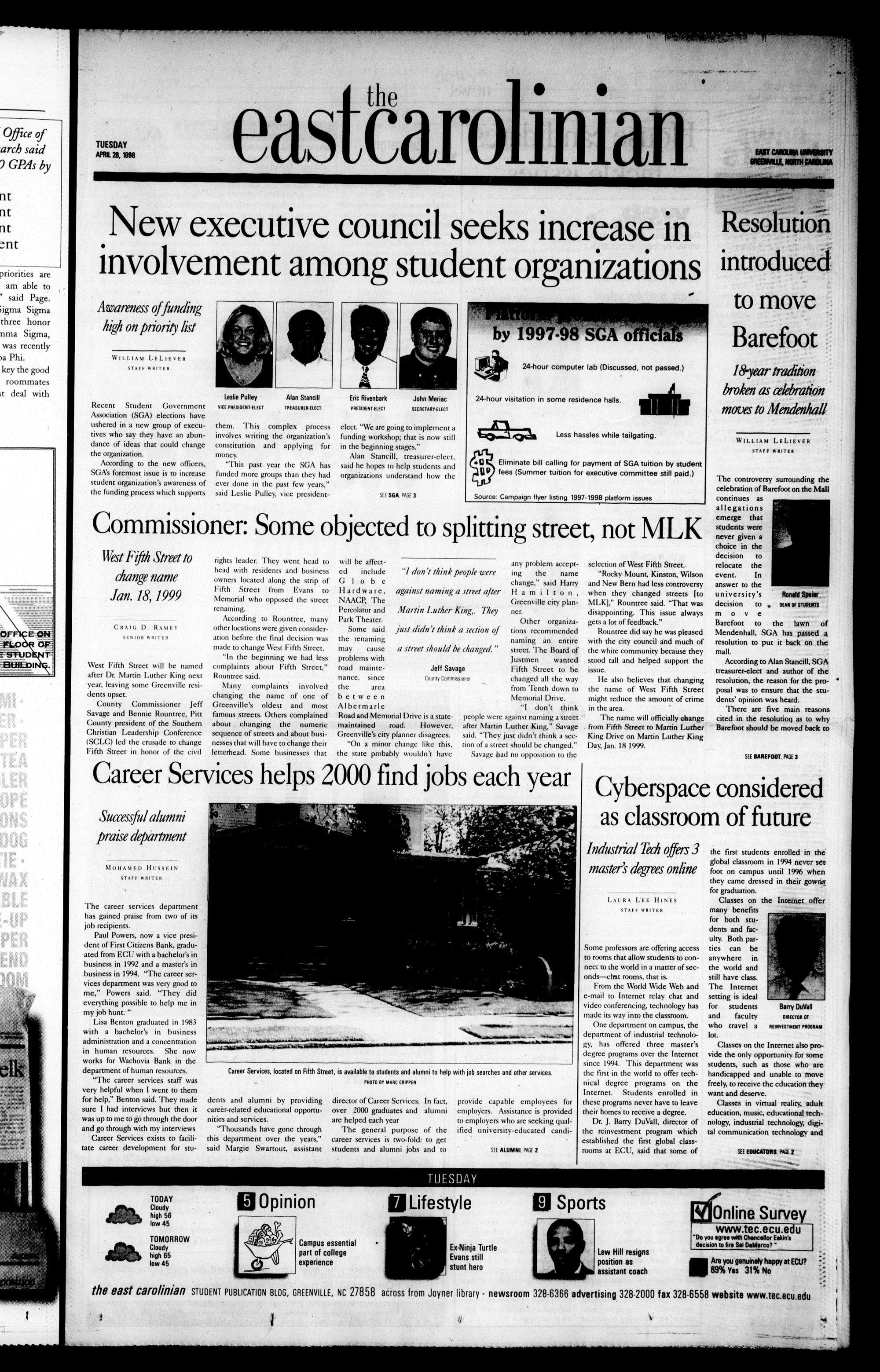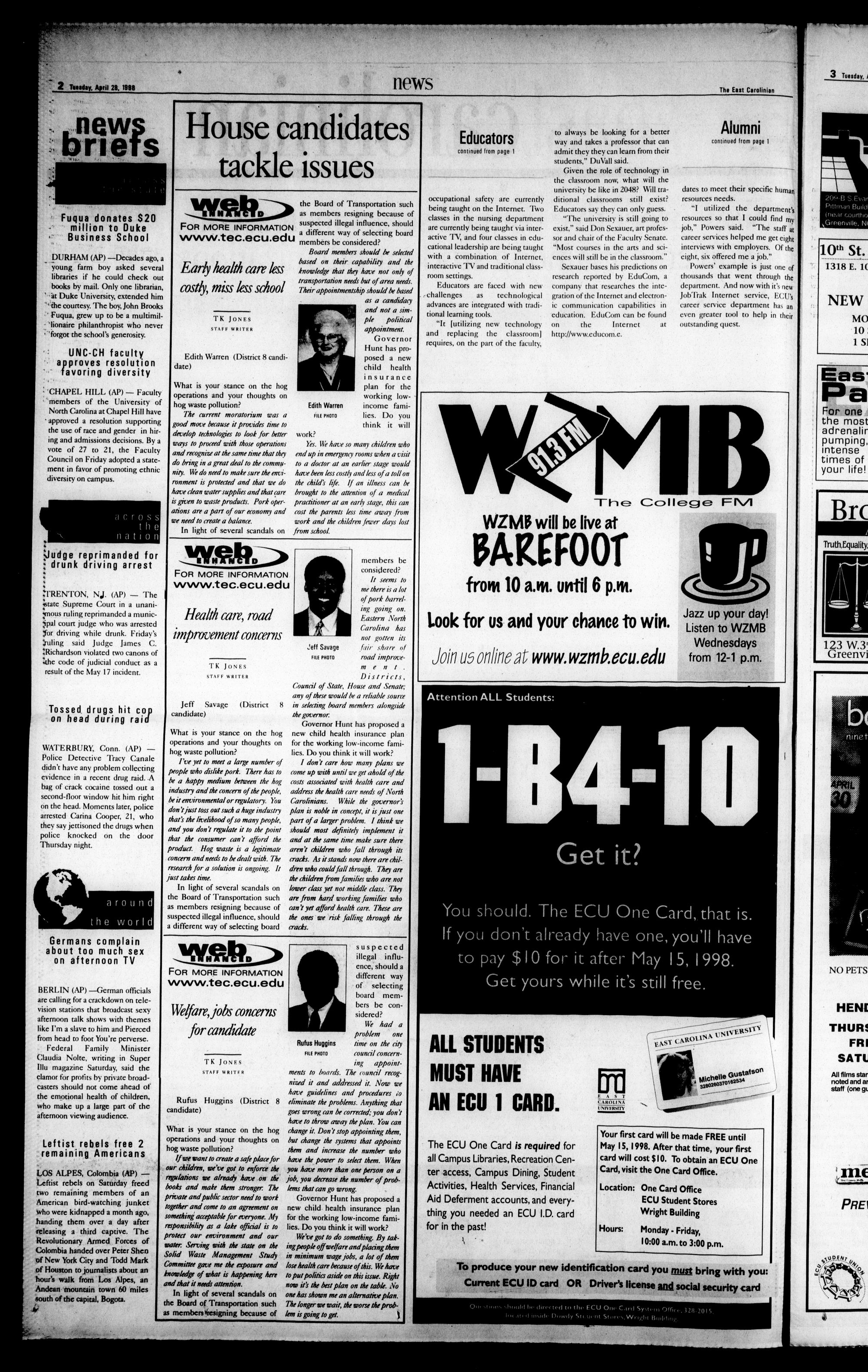 East Carolina's student-run campus newspaper was first published in 1923 as the East Carolina Teachers College News (1923-1925). It has been re-named as The Teco Echo (1925, 1926-1952), East Carolinian (1952-1969), Fountainhead (1969-1979), and The East Carolinian (1969, 1979-present). It includes local, state, national, and international stories with a focus on campus events.