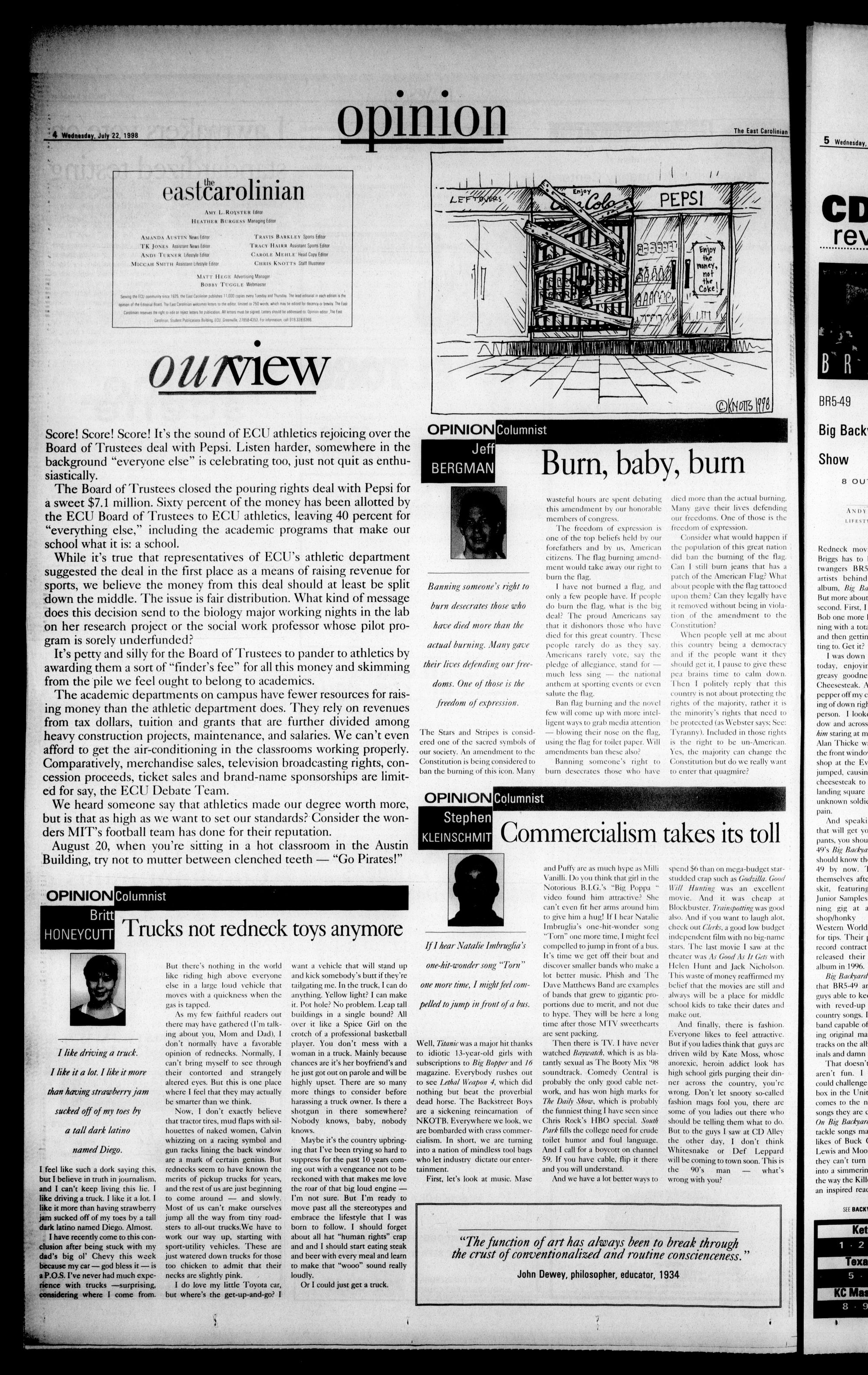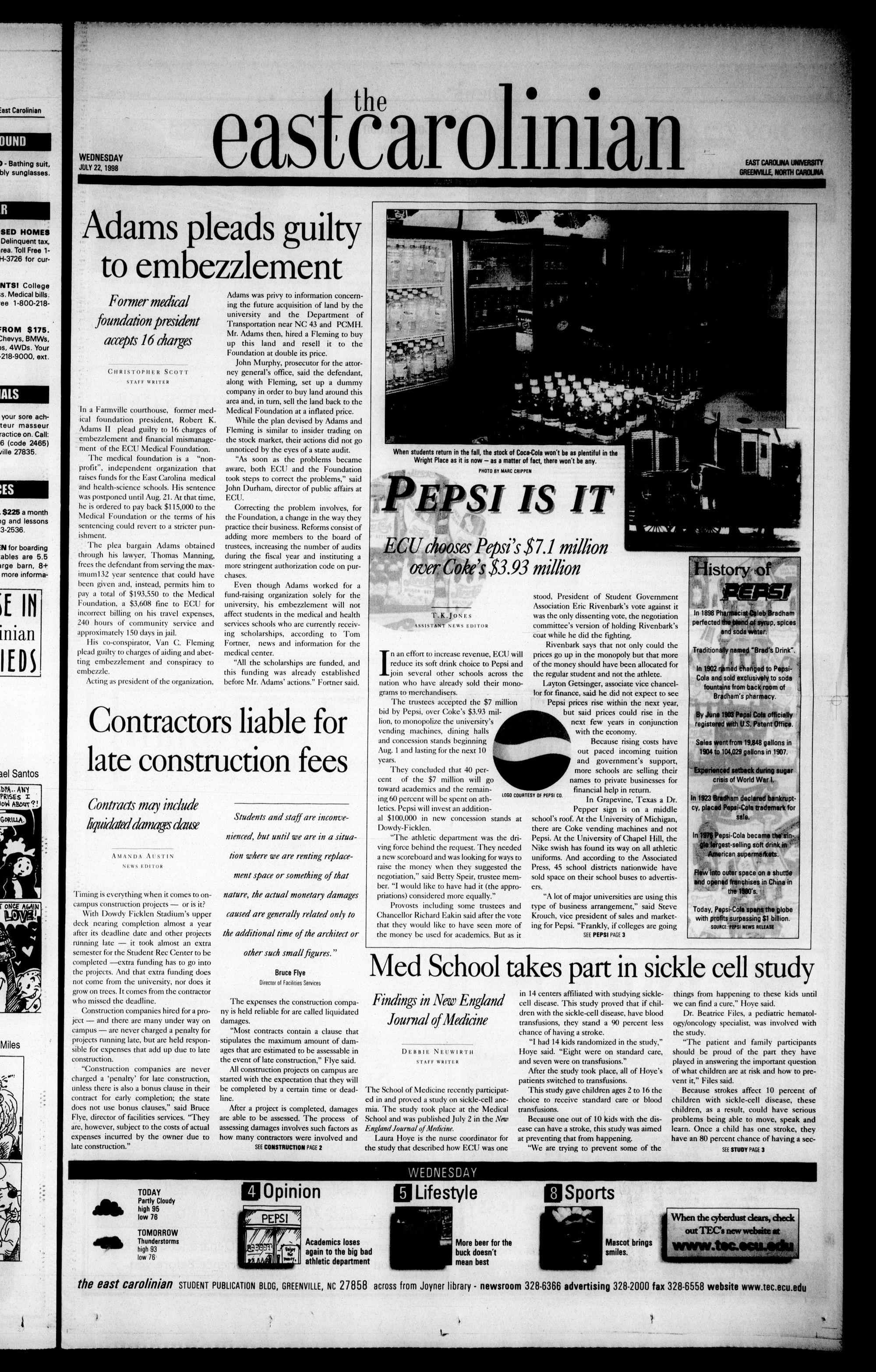 East Carolina's student-run campus newspaper was first published in 1923 as the East Carolina Teachers College News (1923-1925). It has been re-named as The Teco Echo (1925, 1926-1952), East Carolinian (1952-1969), Fountainhead (1969-1979), and The East Carolinian (1969, 1979-present). It includes local, state, national, and international stories with a focus on campus events.