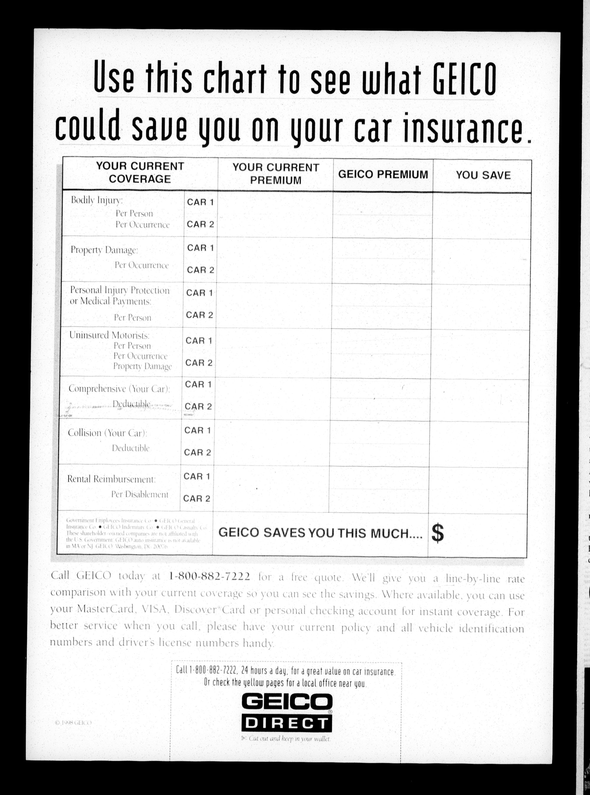 Gall GEICO today at 1-800-882-7222 lor a lice quote. We'll give vou a line-by-line rate