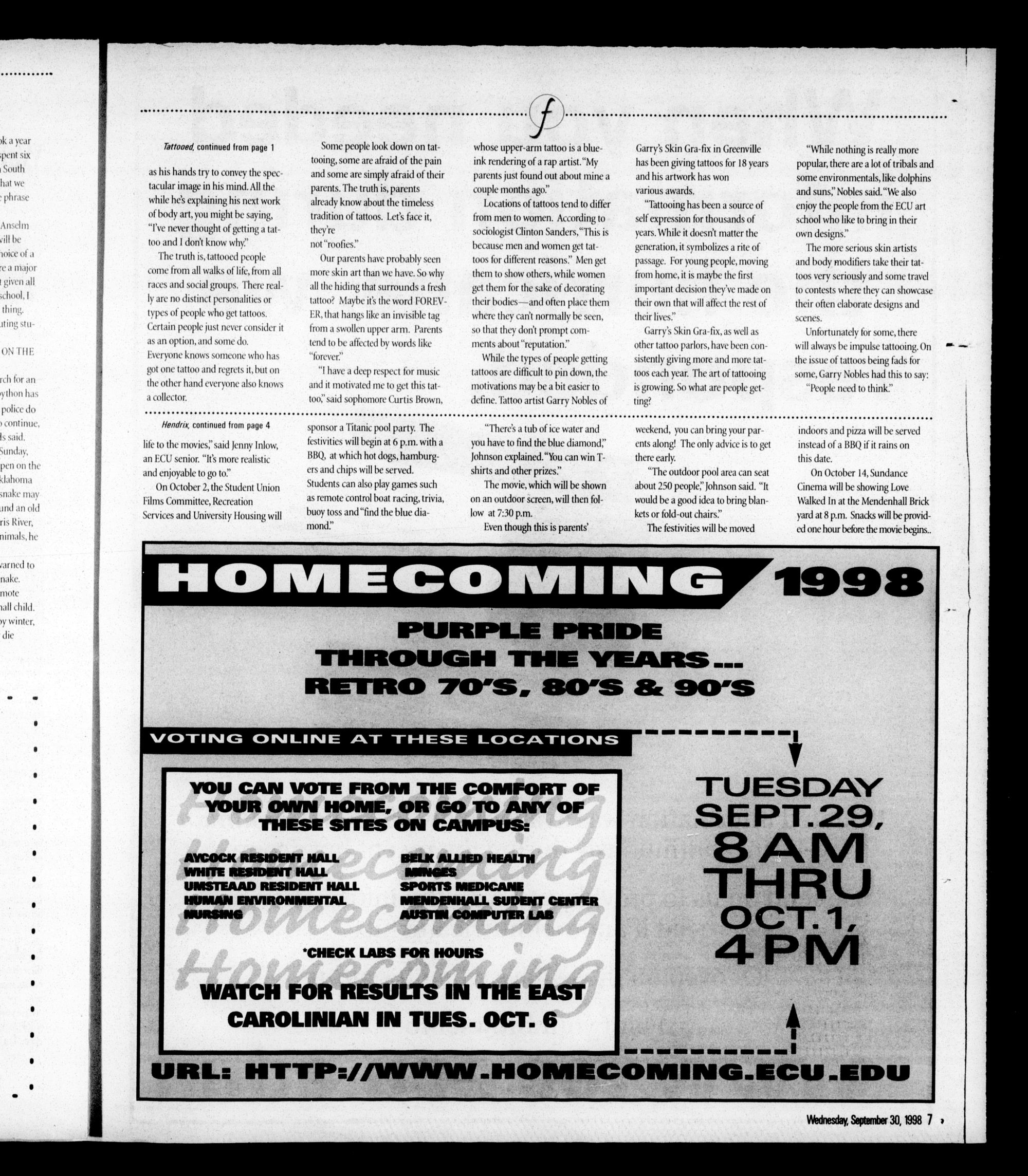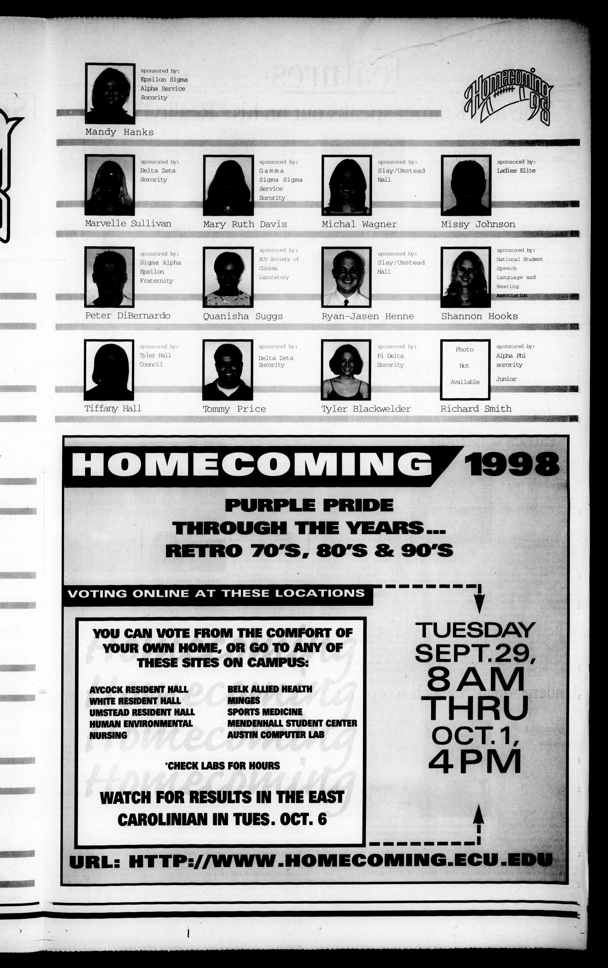 YOU CAN VOTE FROM THE COMFORT OF YOUR OWN HOME, OR GO TO AMY OF THESE SITES ON CAMPUS: AYCOCK RESIDENT HALL BILK ALLIED HEALTH WHITE RESIDENT HALL MMNGCS ItfP UMSTEAAD RESIDENT HALL SPORTS MEDICANE HUMAN ENVIRONMENTAL MENDENHALL SUDENT CENTER NUM1S AUSTIN COMPUTER LAB Sr w Wf' fr W WrWttttWi W S' trlrW OWBW LA. CHECK LABS FOR HOURS ? M?J WATCH FOR RESULTS IN THE EAST CAROLINIAN IN TUES. OCT. 6TUESDAY SEPT. 29, 8AM THRU OCT.1, 4PM T
