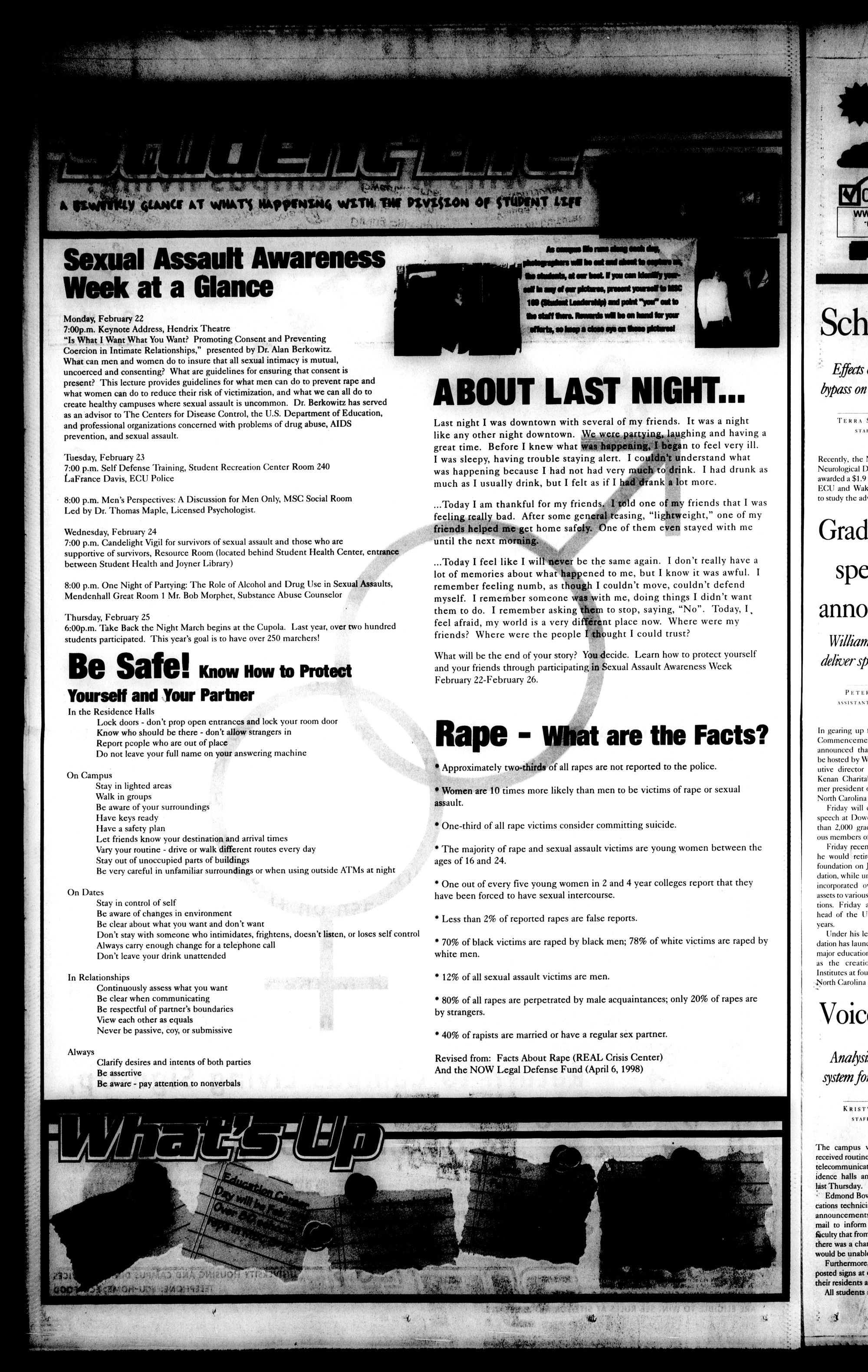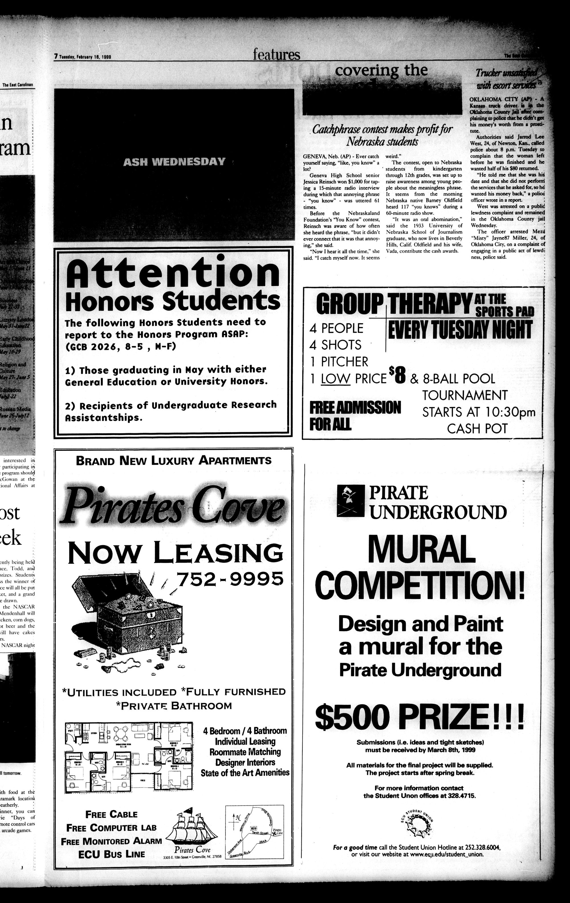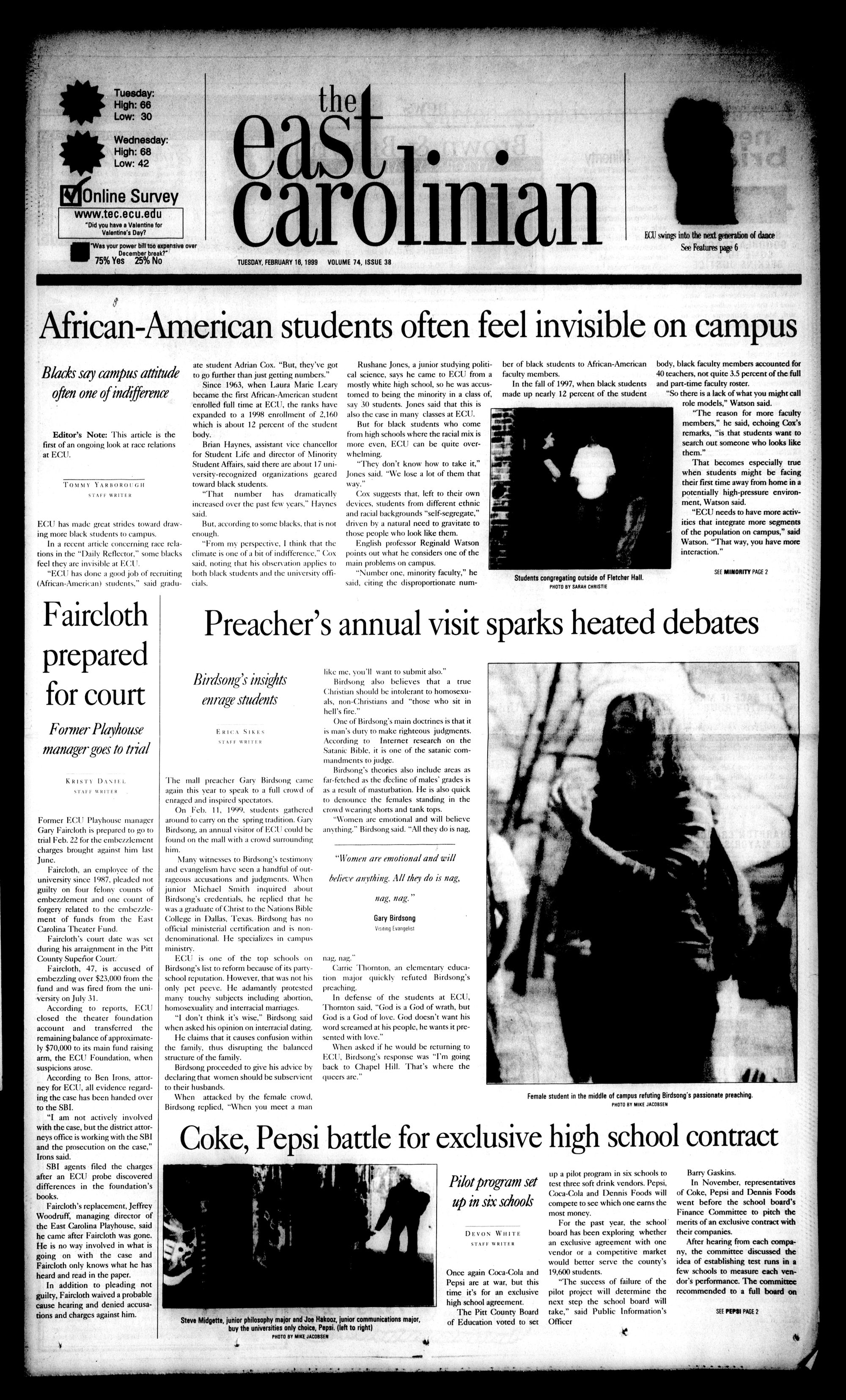East Carolina's student-run campus newspaper was first published in 1923 as the East Carolina Teachers College News (1923-1925). It has been re-named as The Teco Echo (1925, 1926-1952), East Carolinian (1952-1969), Fountainhead (1969-1979), and The East Carolinian (1969, 1979-present). It includes local, state, national, and international stories with a focus on campus events.