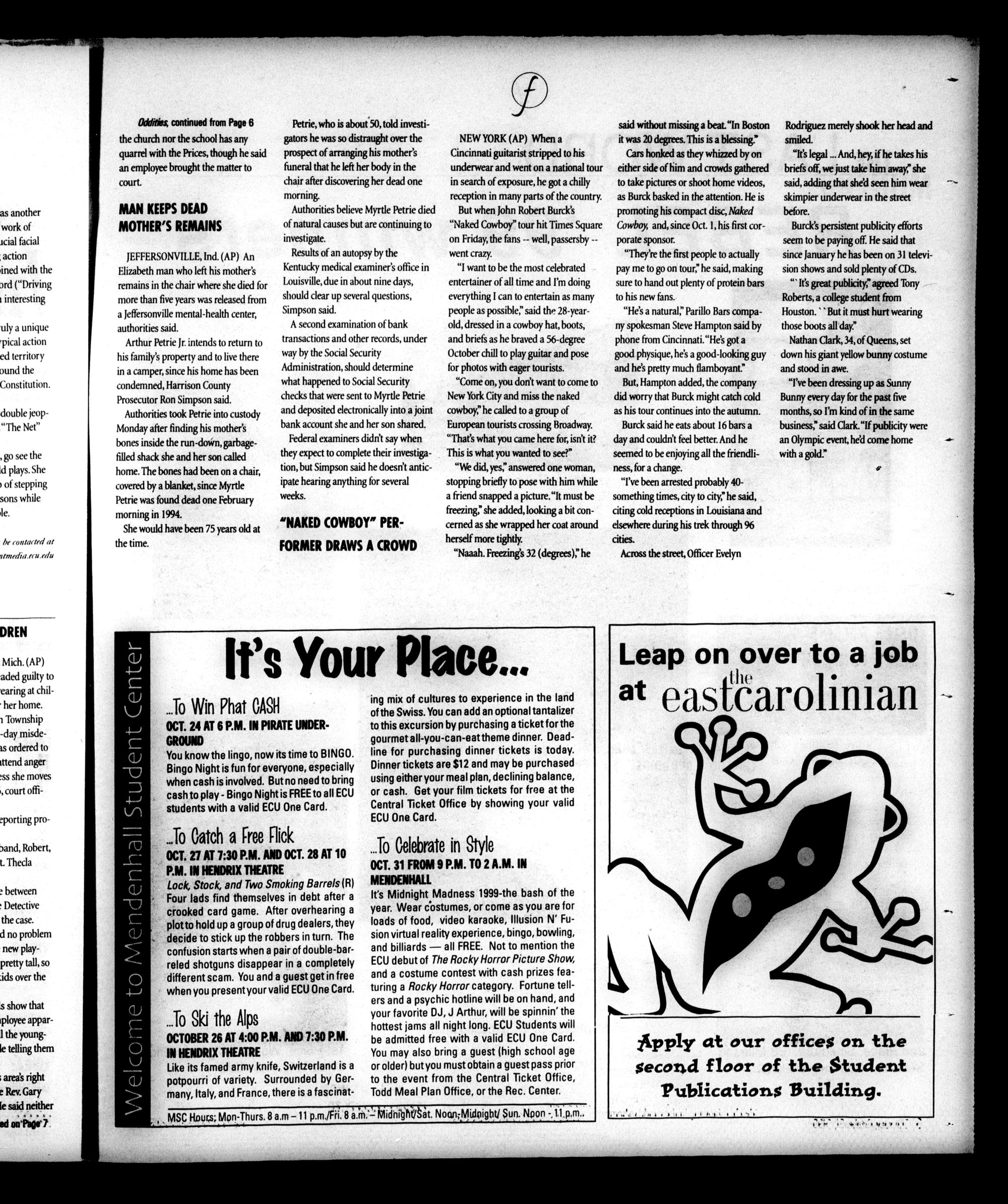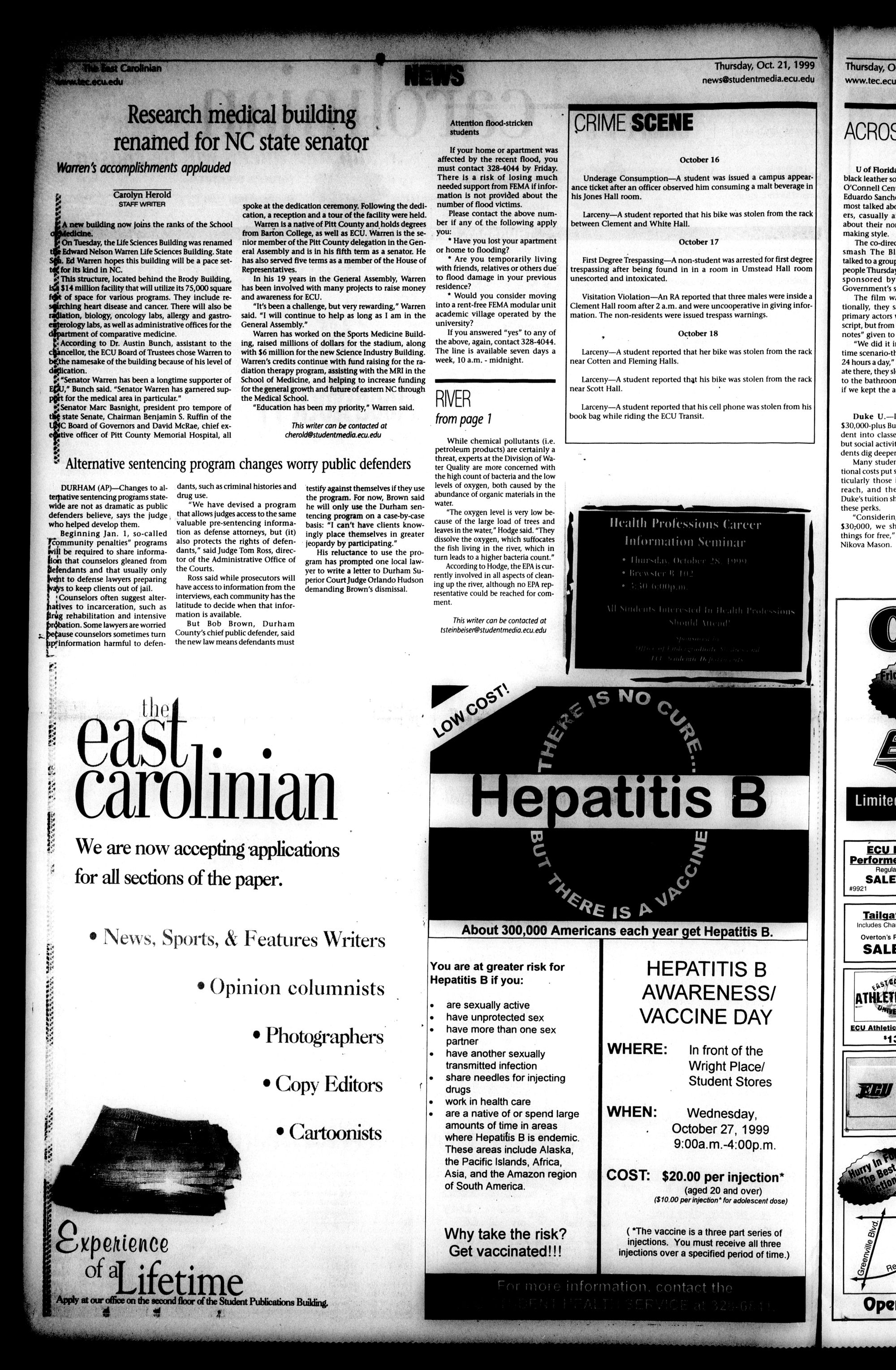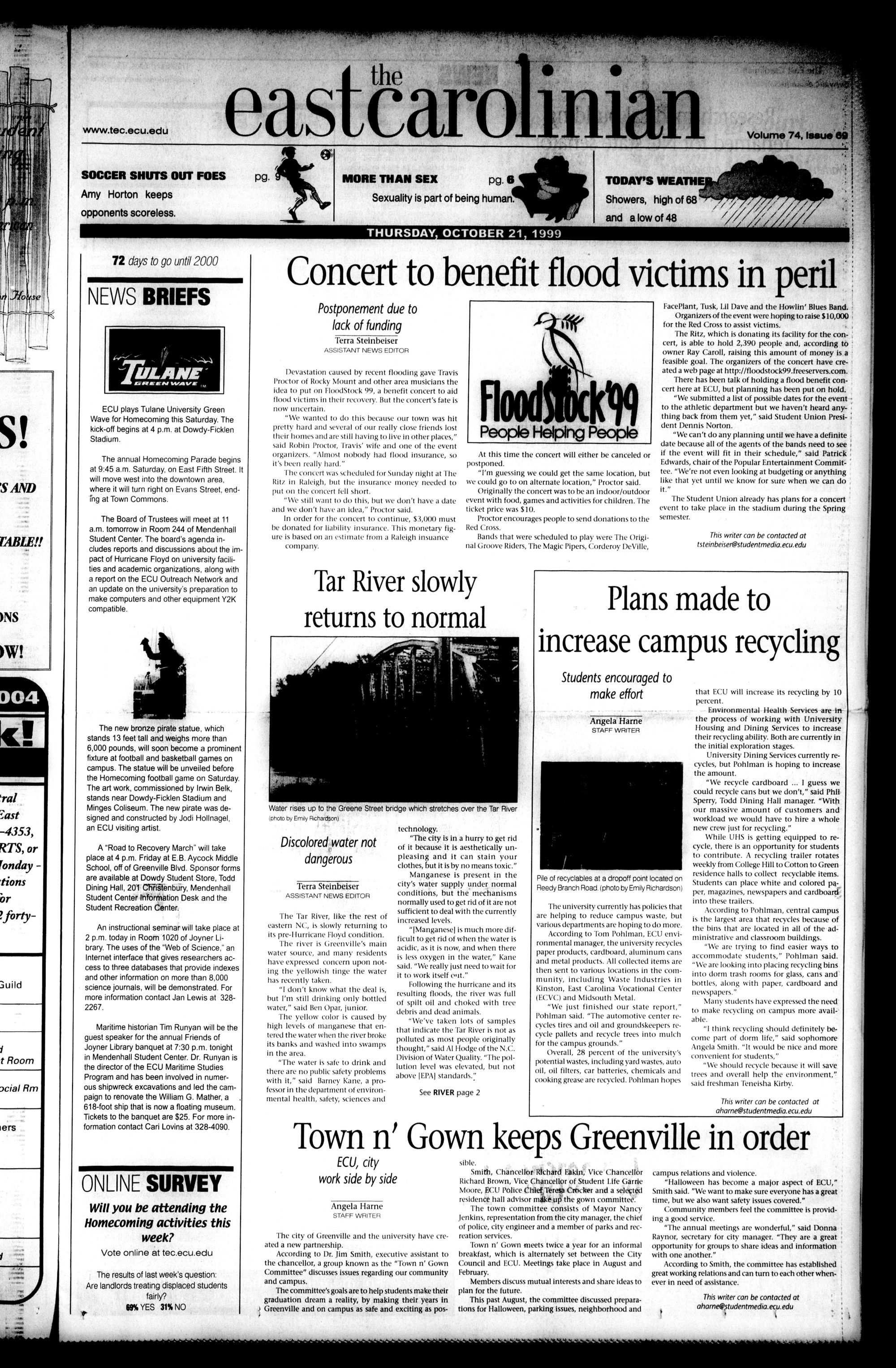 East Carolina's student-run campus newspaper was first published in 1923 as the East Carolina Teachers College News (1923-1925). It has been re-named as The Teco Echo (1925, 1926-1952), East Carolinian (1952-1969), Fountainhead (1969-1979), and The East Carolinian (1969, 1979-present). It includes local, state, national, and international stories with a focus on campus events.