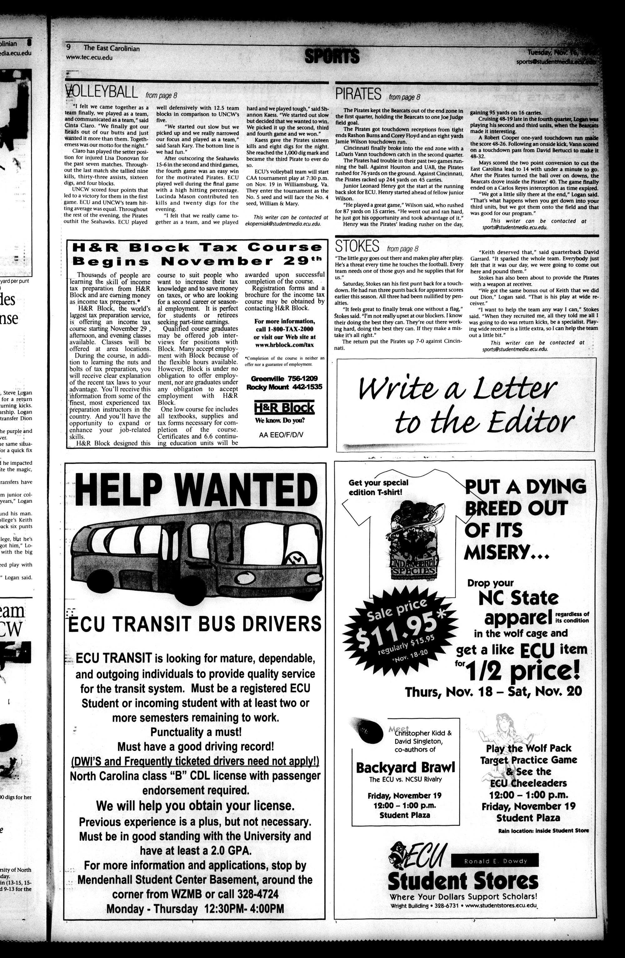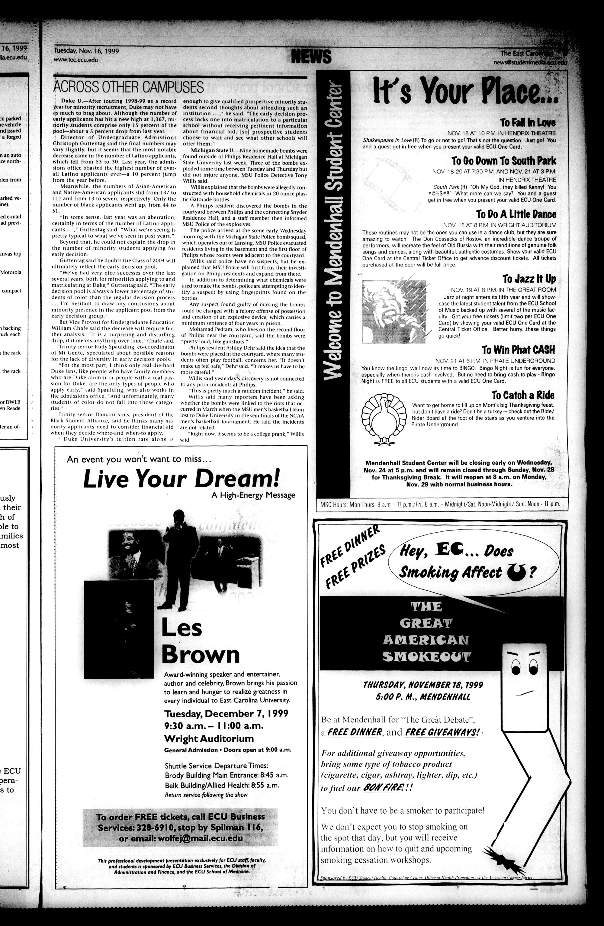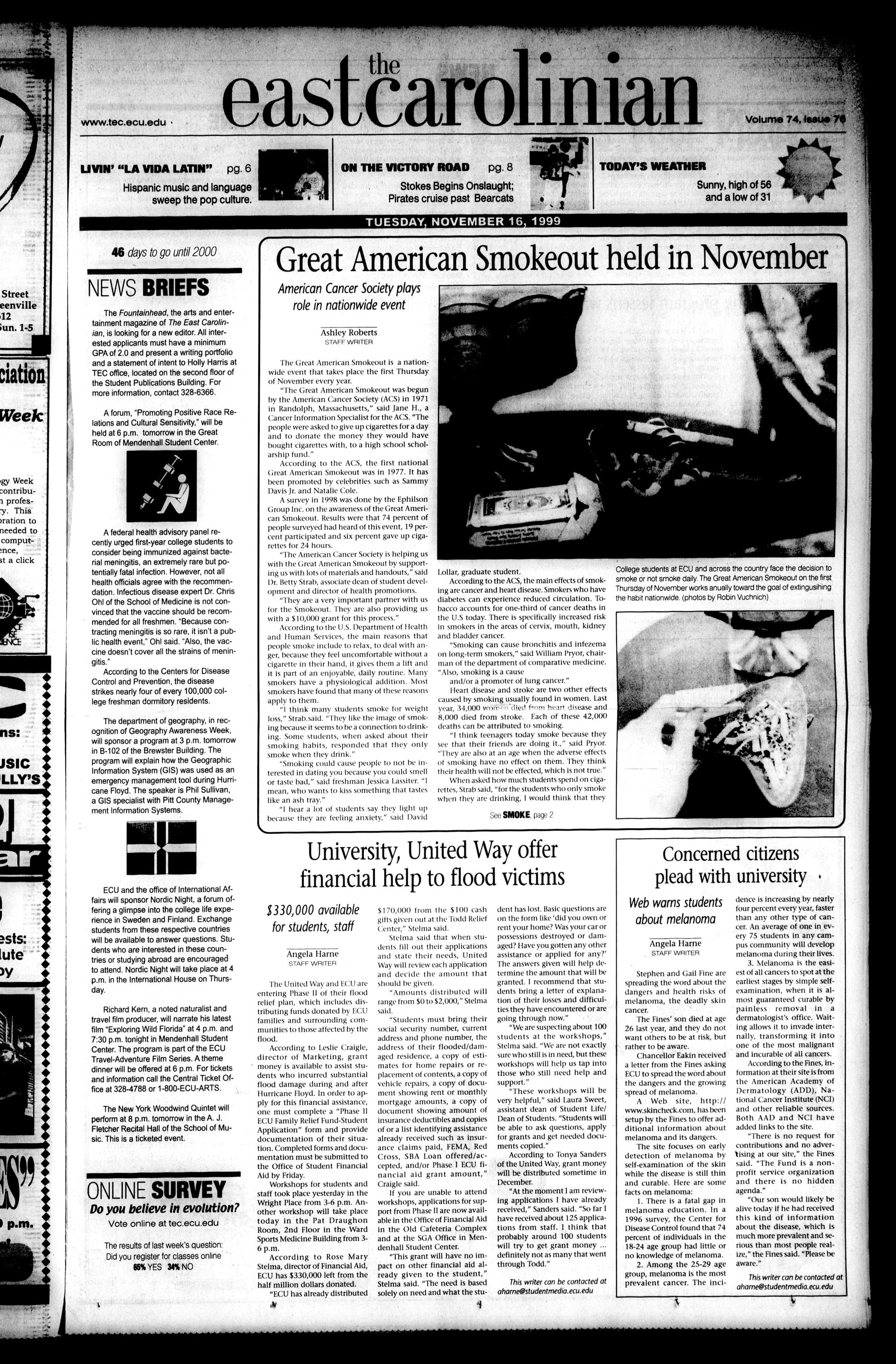 East Carolina's student-run campus newspaper was first published in 1923 as the East Carolina Teachers College News (1923-1925). It has been re-named as The Teco Echo (1925, 1926-1952), East Carolinian (1952-1969), Fountainhead (1969-1979), and The East Carolinian (1969, 1979-present). It includes local, state, national, and international stories with a focus on campus events.