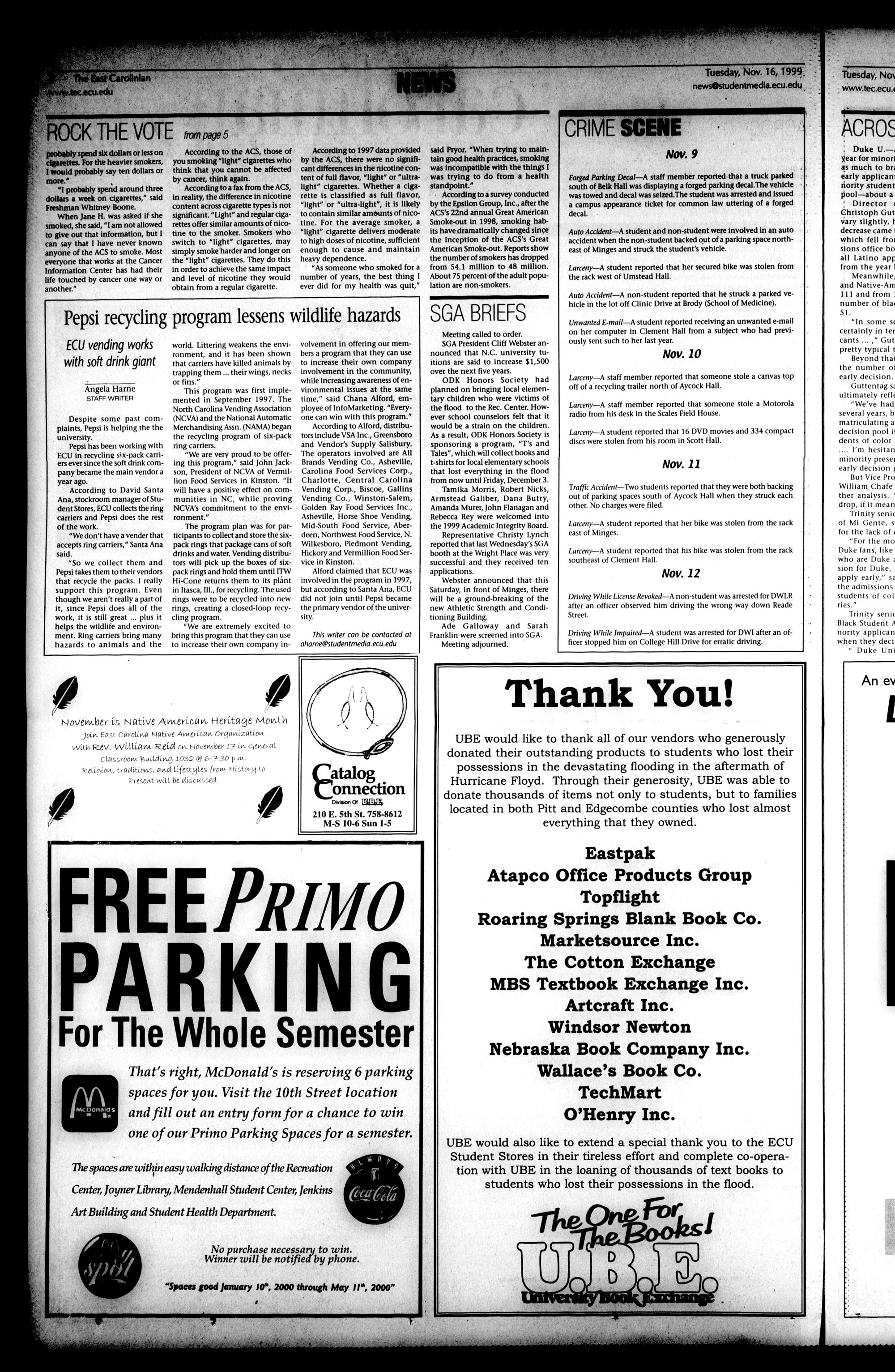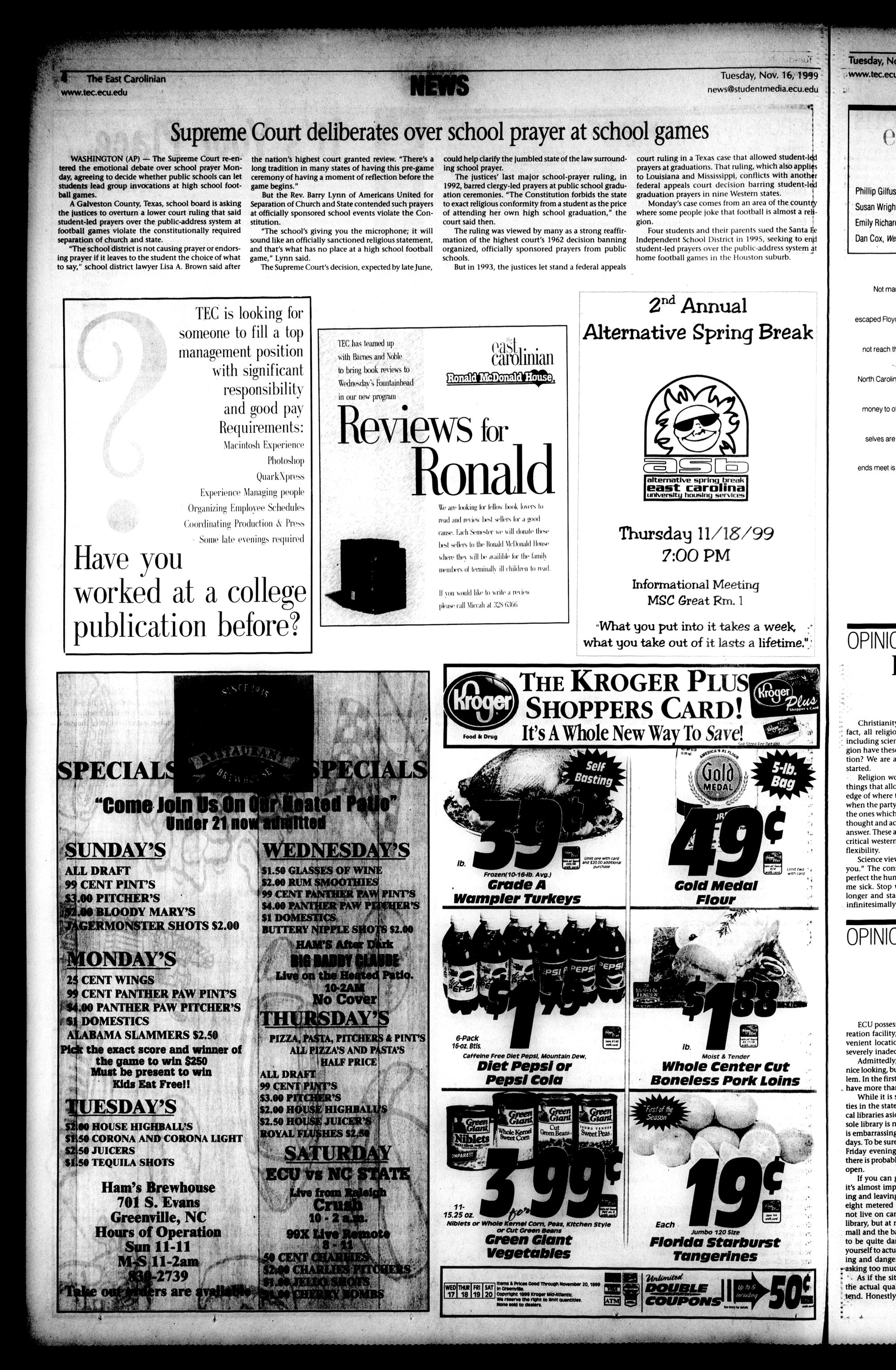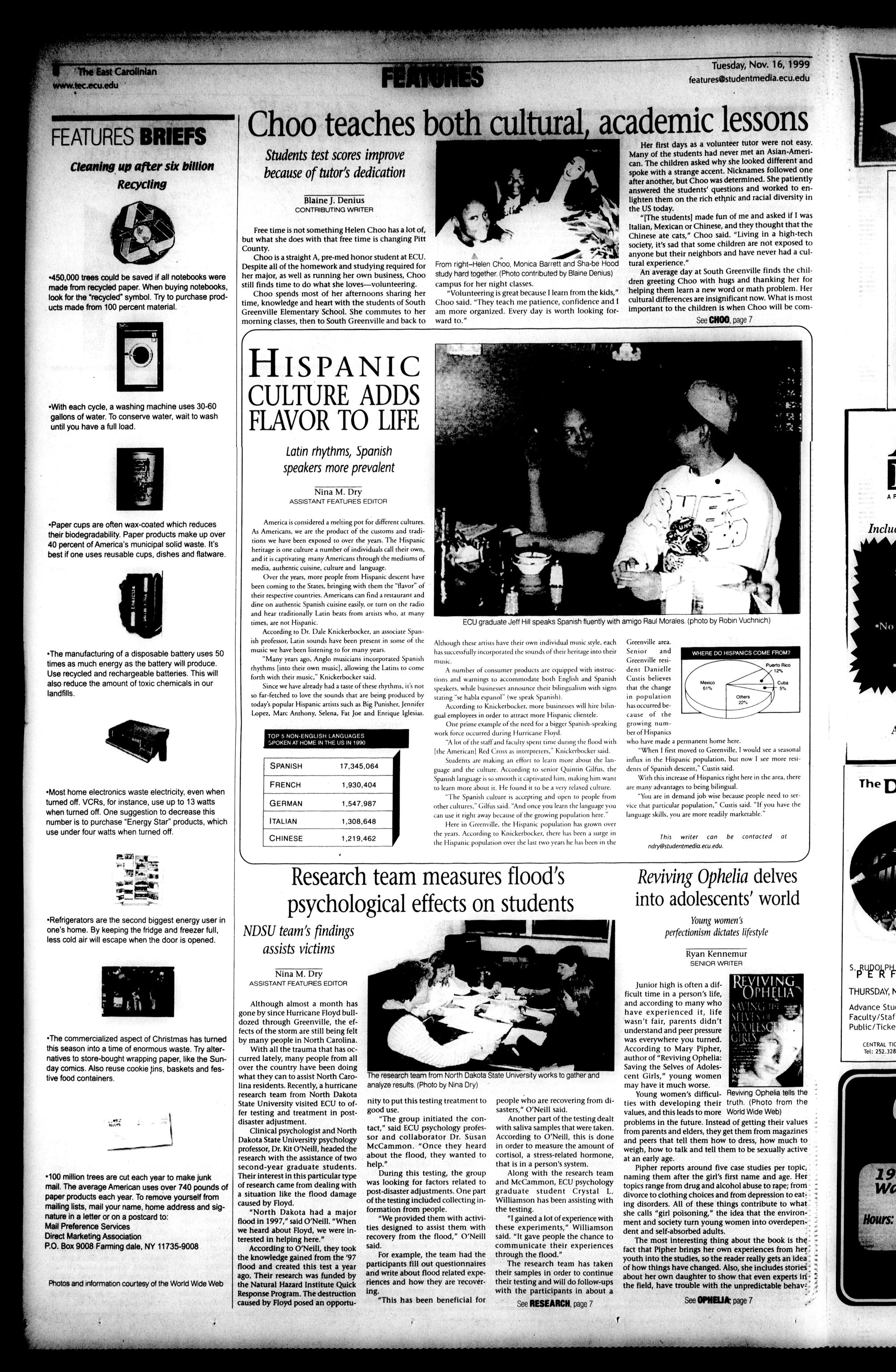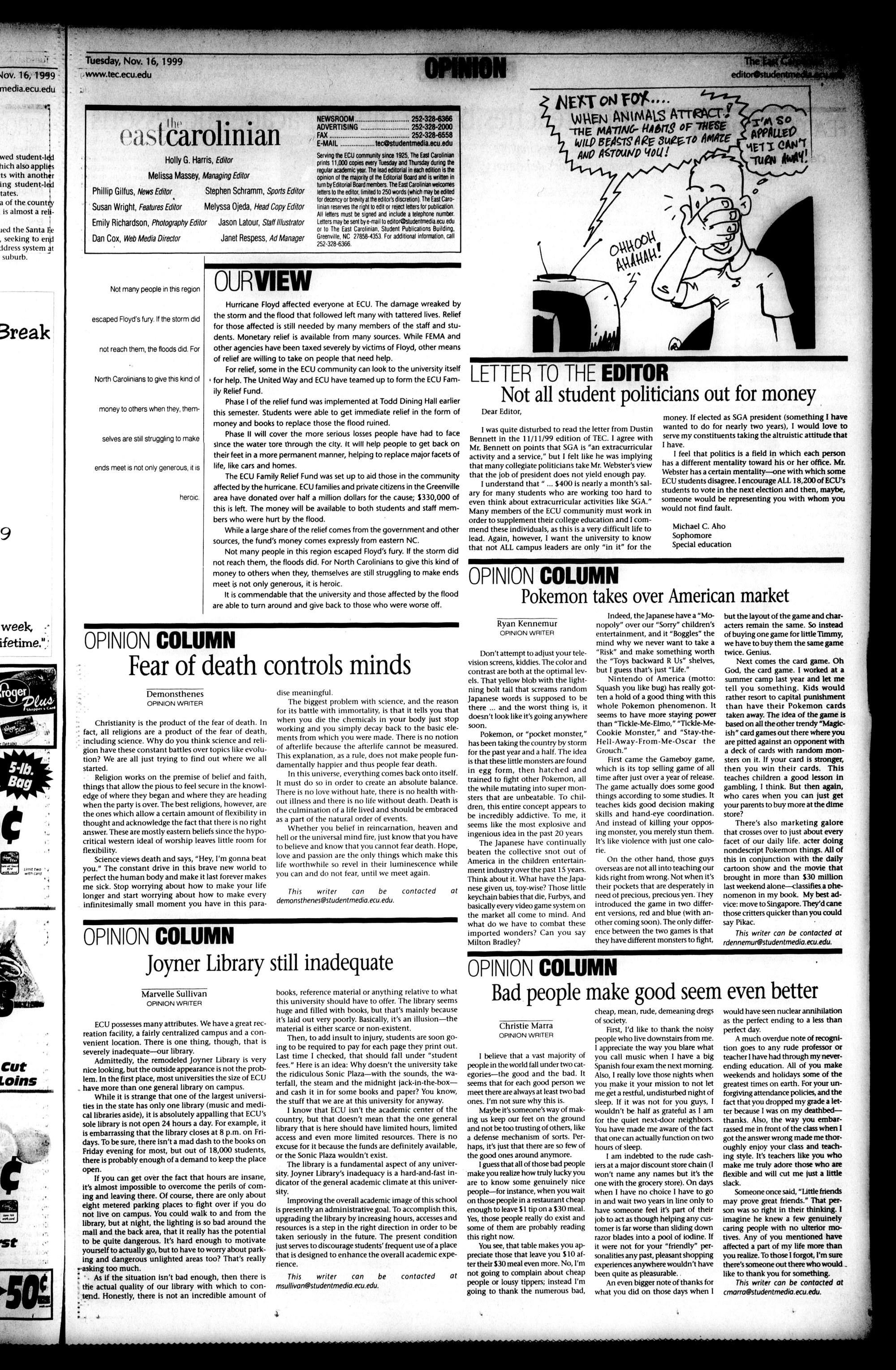 East Carolina's student-run campus newspaper was first published in 1923 as the East Carolina Teachers College News (1923-1925). It has been re-named as The Teco Echo (1925, 1926-1952), East Carolinian (1952-1969), Fountainhead (1969-1979), and The East Carolinian (1969, 1979-present). It includes local, state, national, and international stories with a focus on campus events.