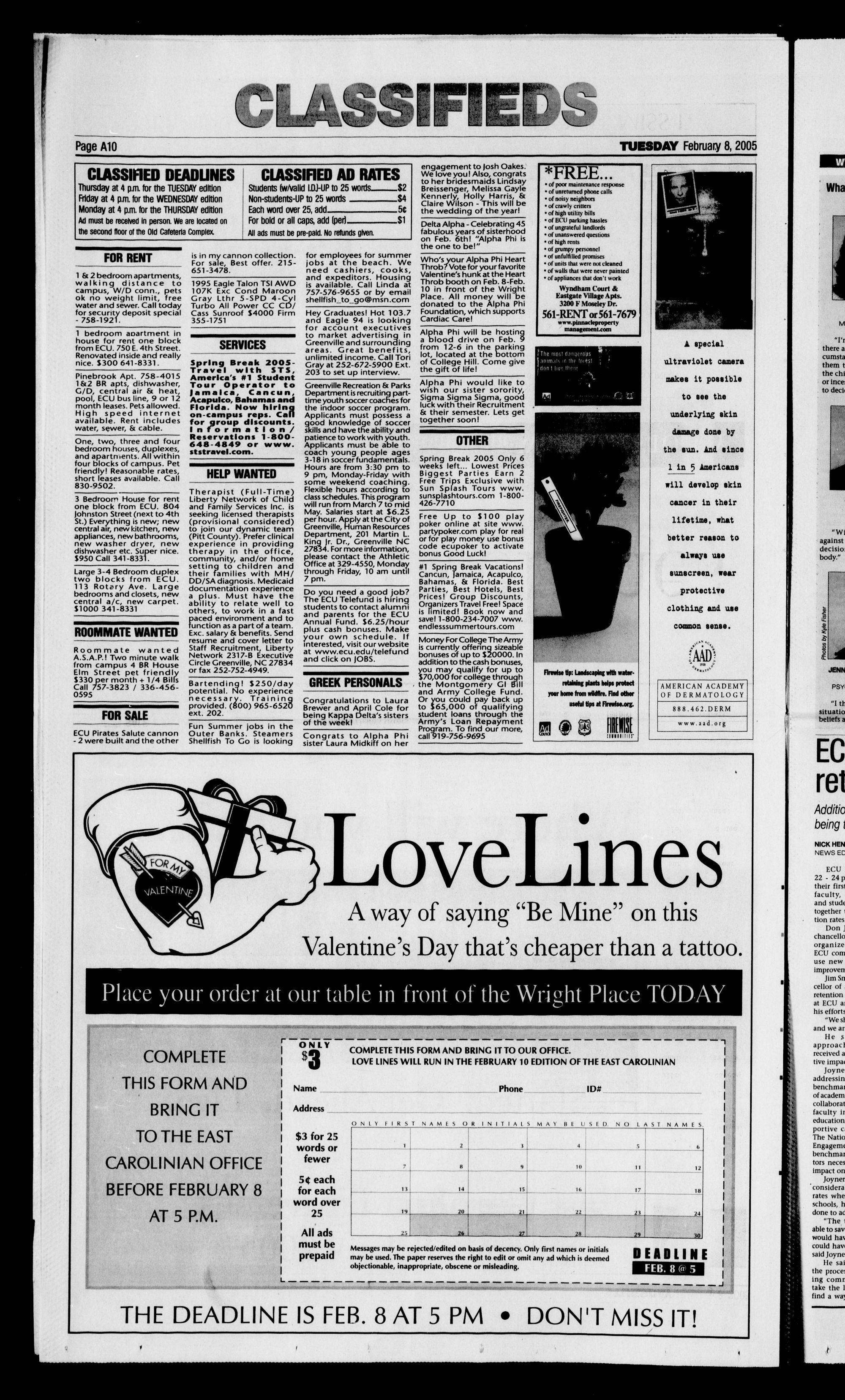 LOVE LINES WILL RUN IN THE FEBRUARY 10 EDITION OF THE EAST CAROLINIAN