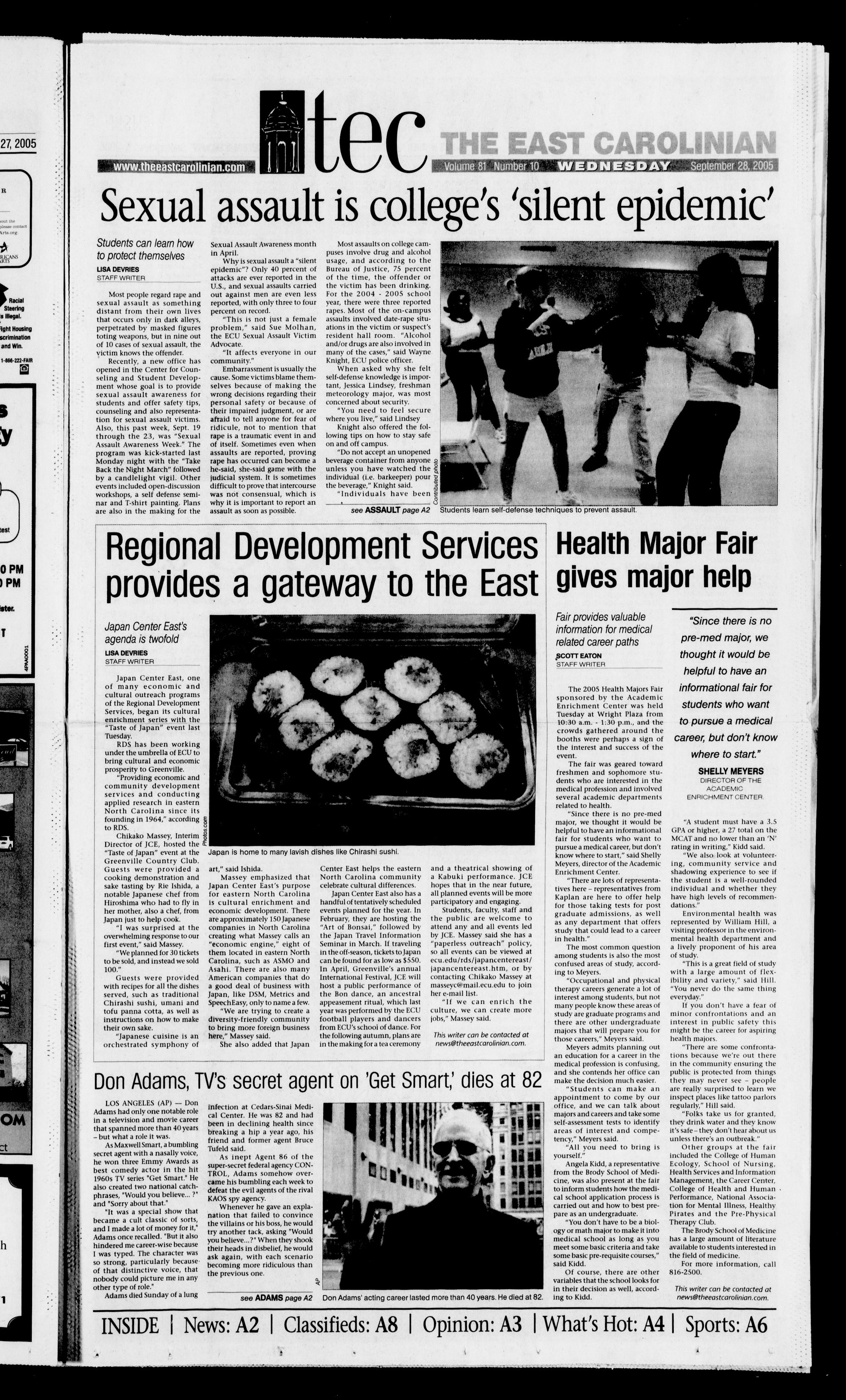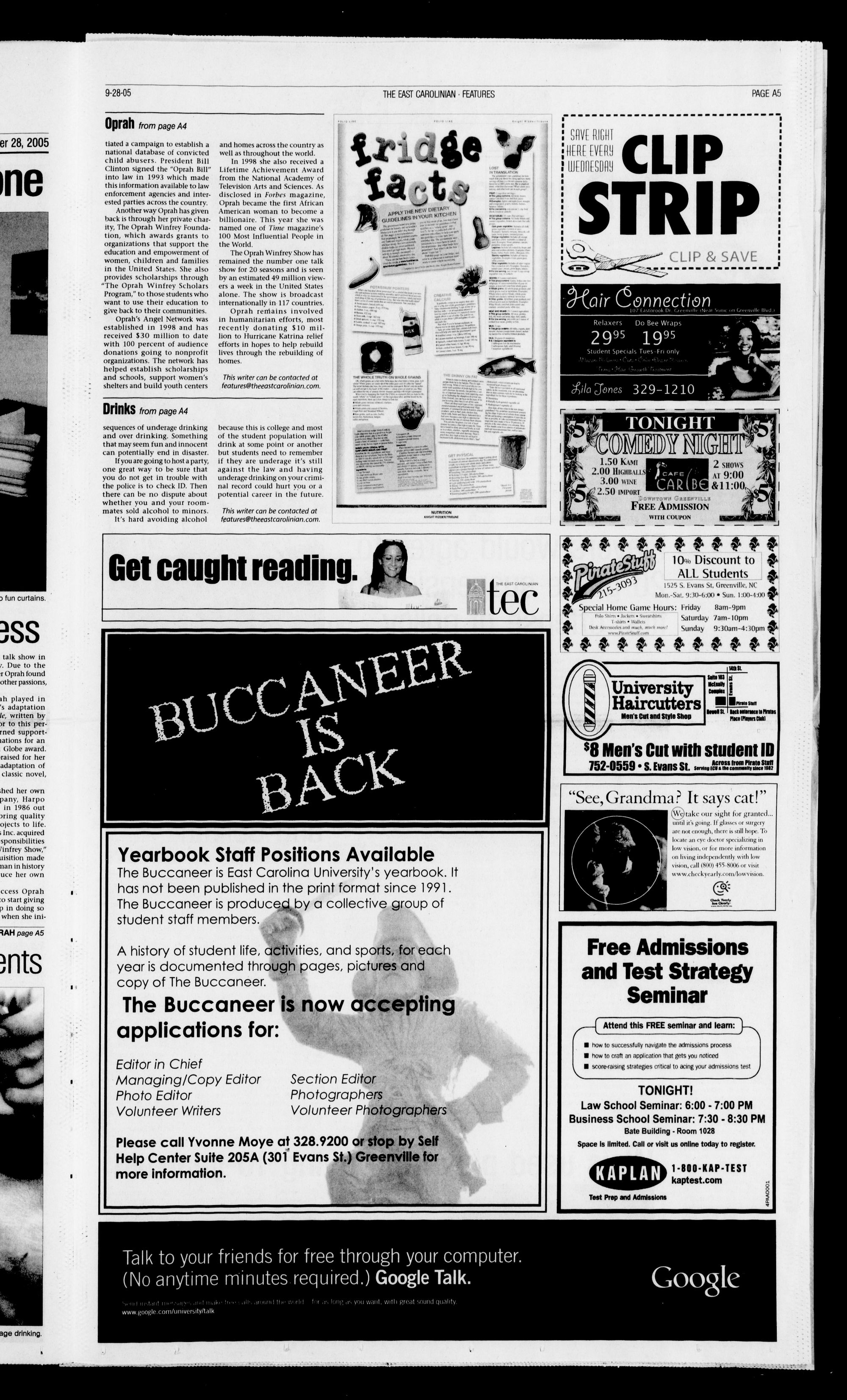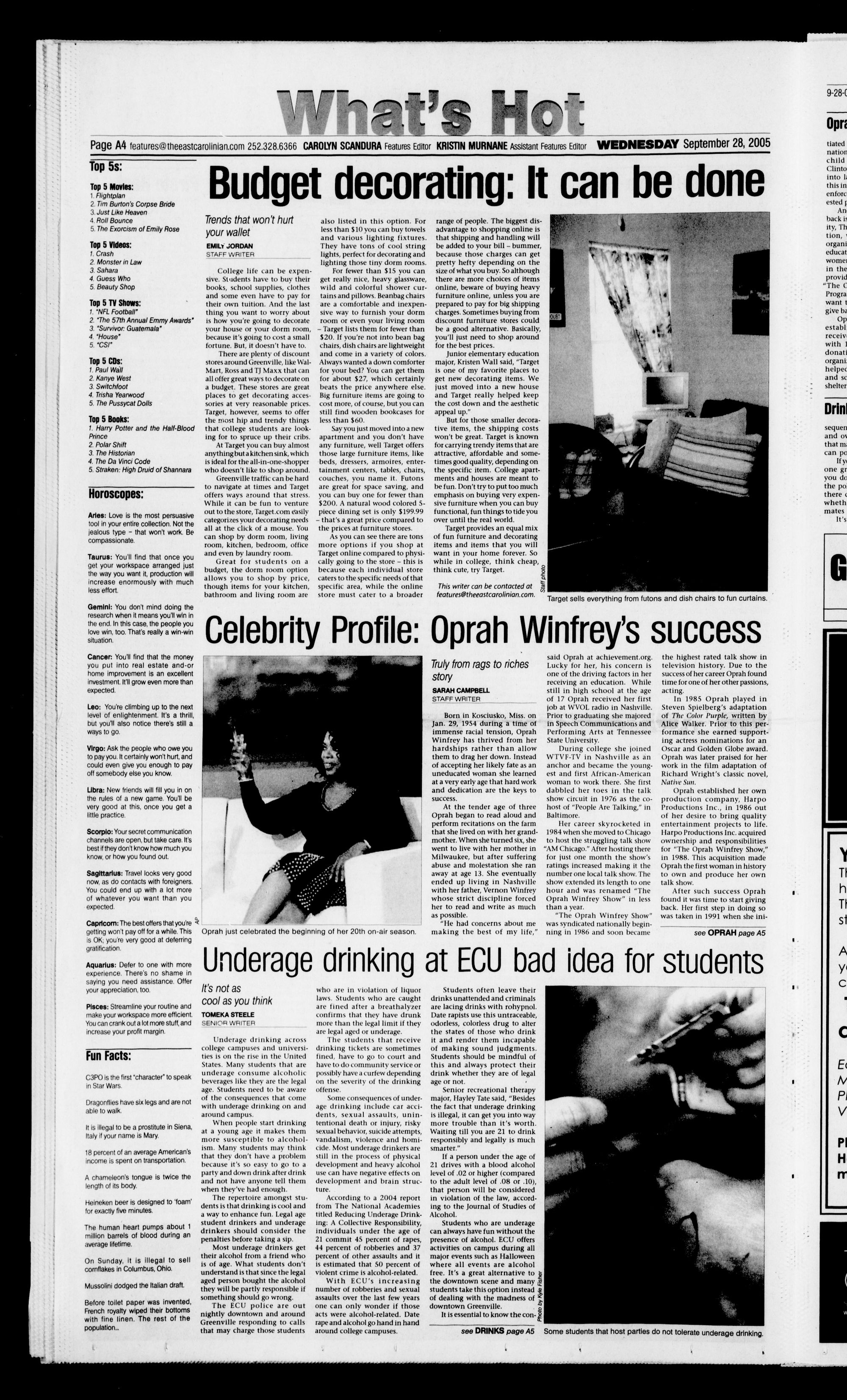 East Carolina's student-run campus newspaper was first published in 1923 as the East Carolina Teachers College News (1923-1925). It has been re-named as The Teco Echo (1925, 1926-1952), East Carolinian (1952-1969), Fountainhead (1969-1979), and The East Carolinian (1969, 1979-present). It includes local, state, national, and international stories with a focus on campus events.