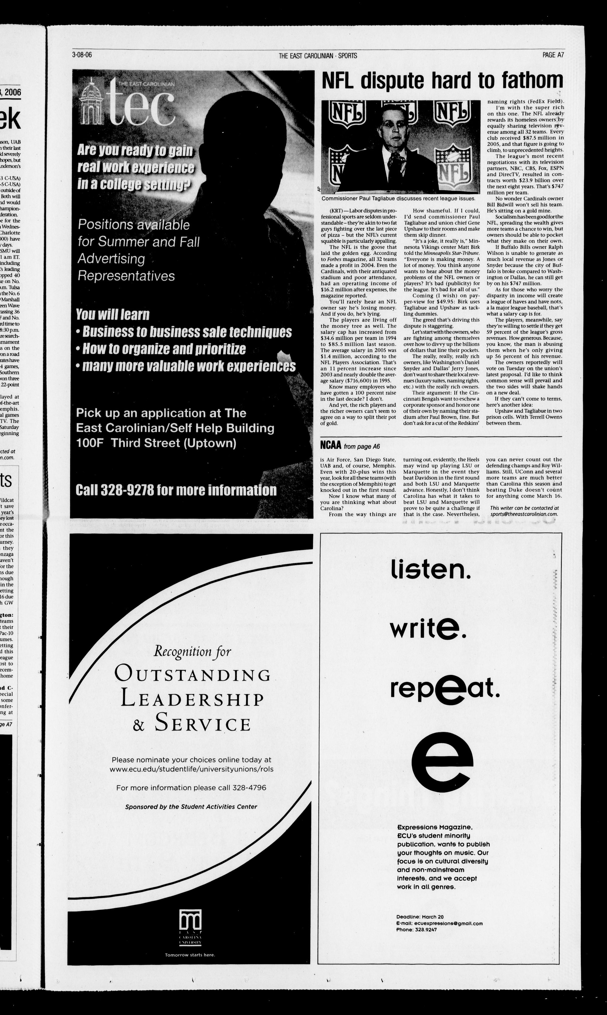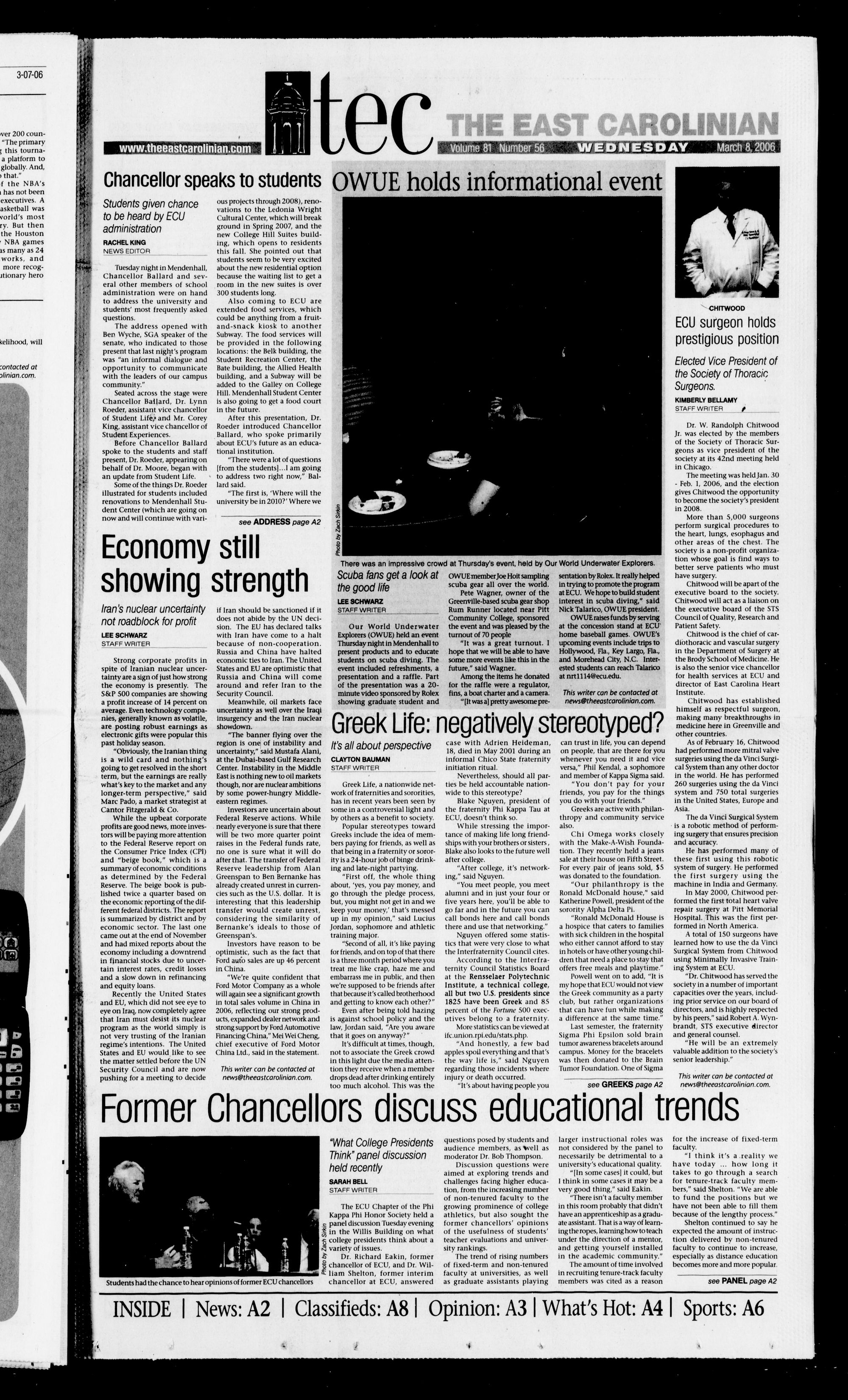 East Carolina's student-run campus newspaper was first published in 1923 as the East Carolina Teachers College News (1923-1925). It has been re-named as The Teco Echo (1925, 1926-1952), East Carolinian (1952-1969), Fountainhead (1969-1979), and The East Carolinian (1969, 1979-present). It includes local, state, national, and international stories with a focus on campus events.