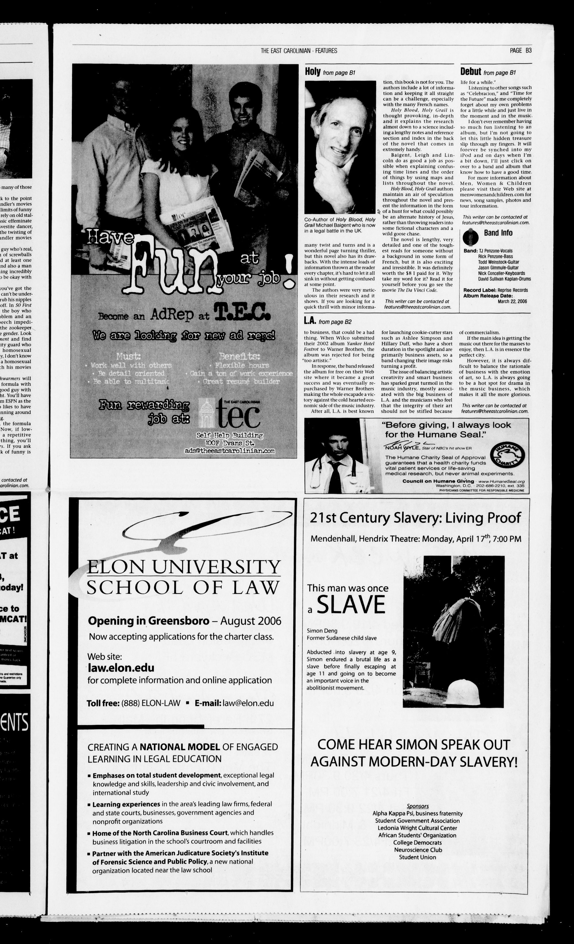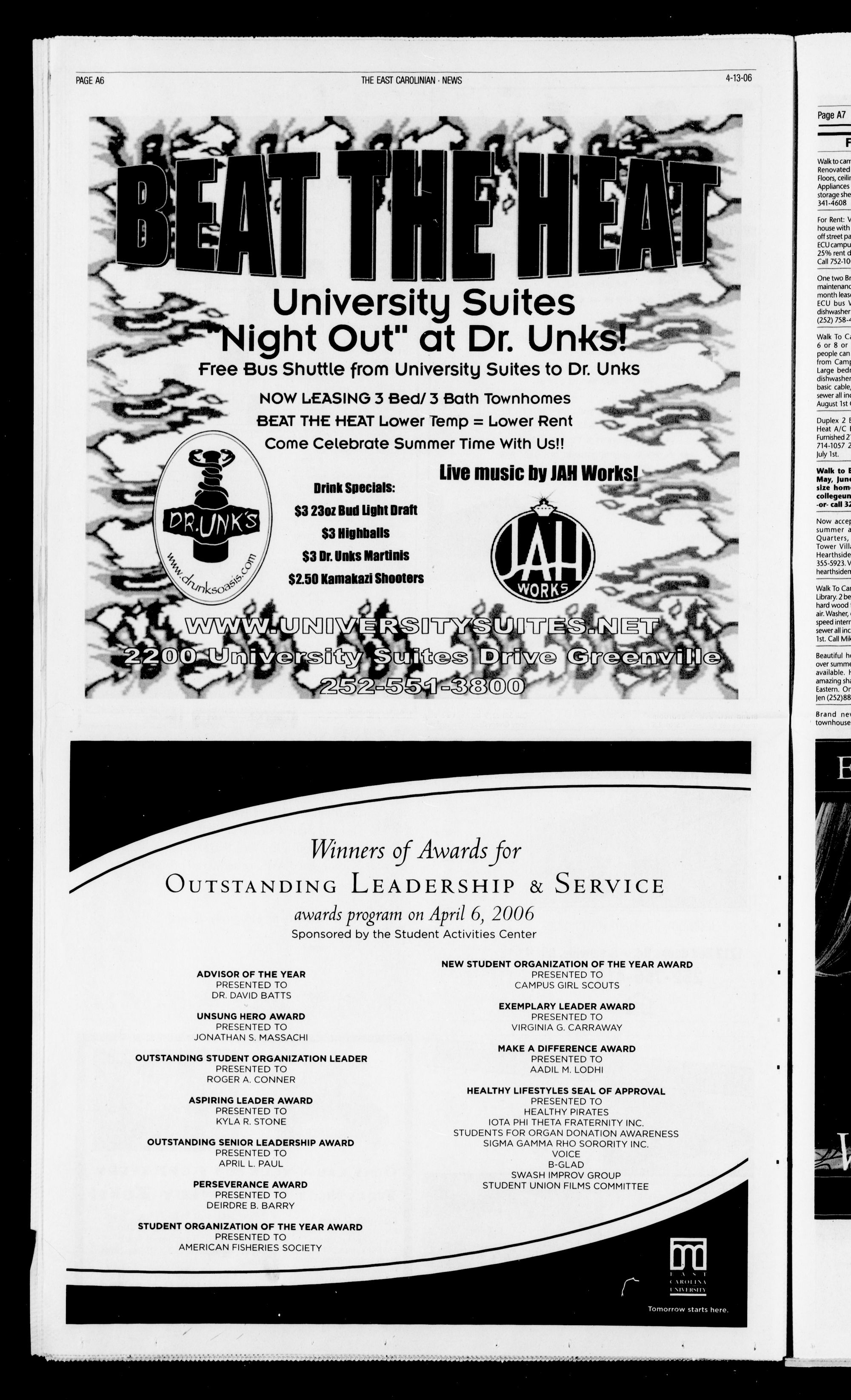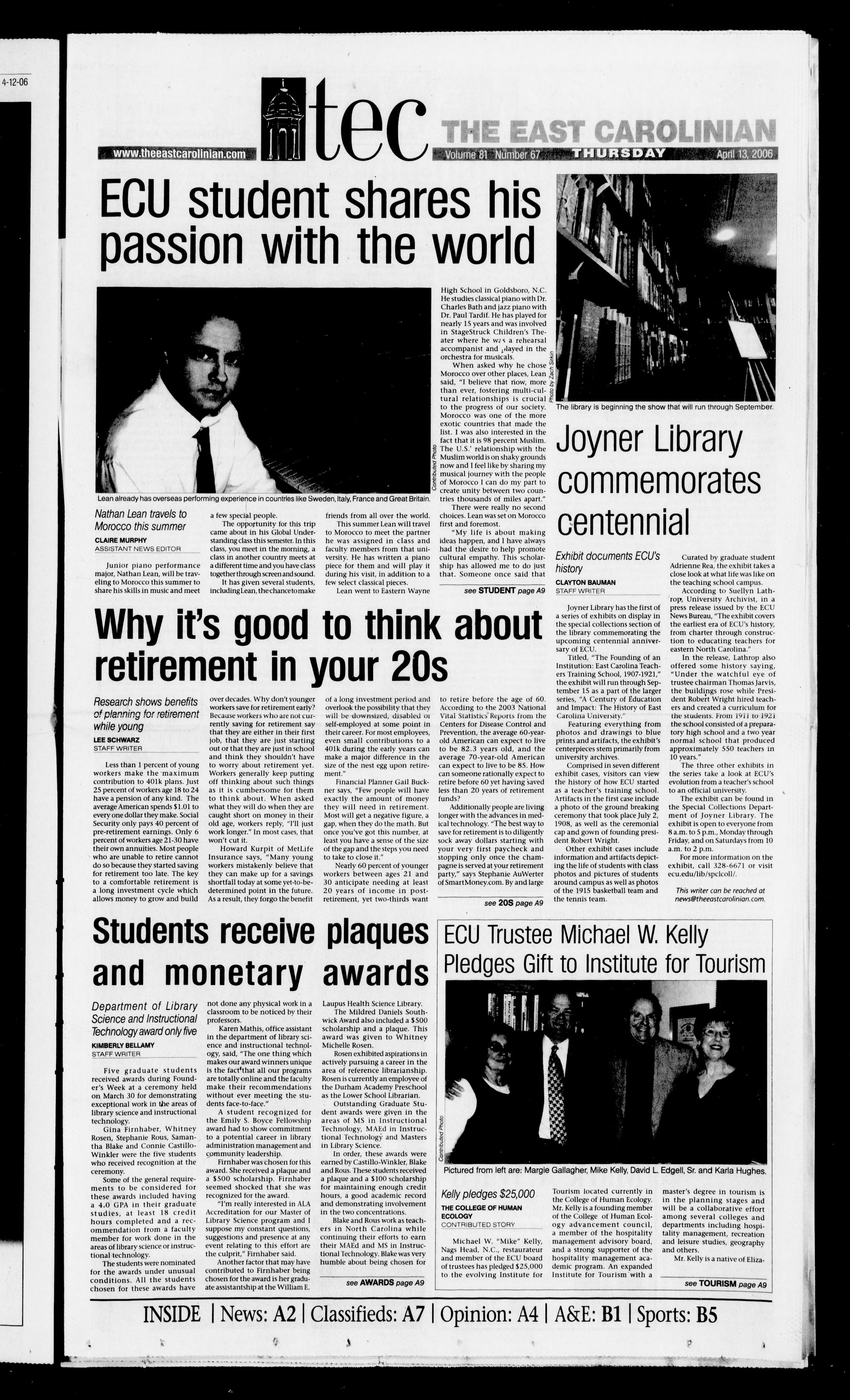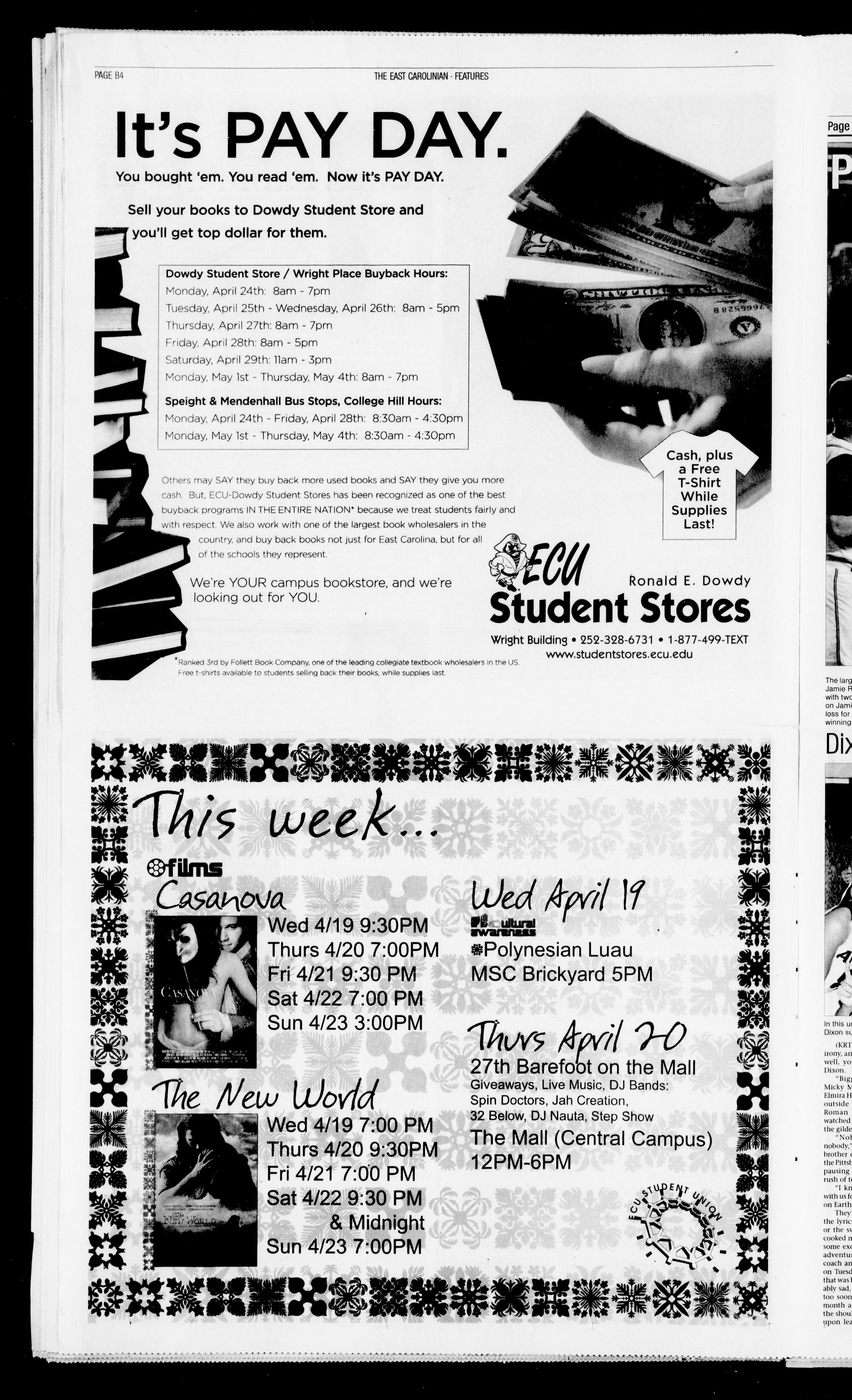 East Carolina's student-run campus newspaper was first published in 1923 as the East Carolina Teachers College News (1923-1925). It has been re-named as The Teco Echo (1925, 1926-1952), East Carolinian (1952-1969), Fountainhead (1969-1979), and The East Carolinian (1969, 1979-present). It includes local, state, national, and international stories with a focus on campus events.