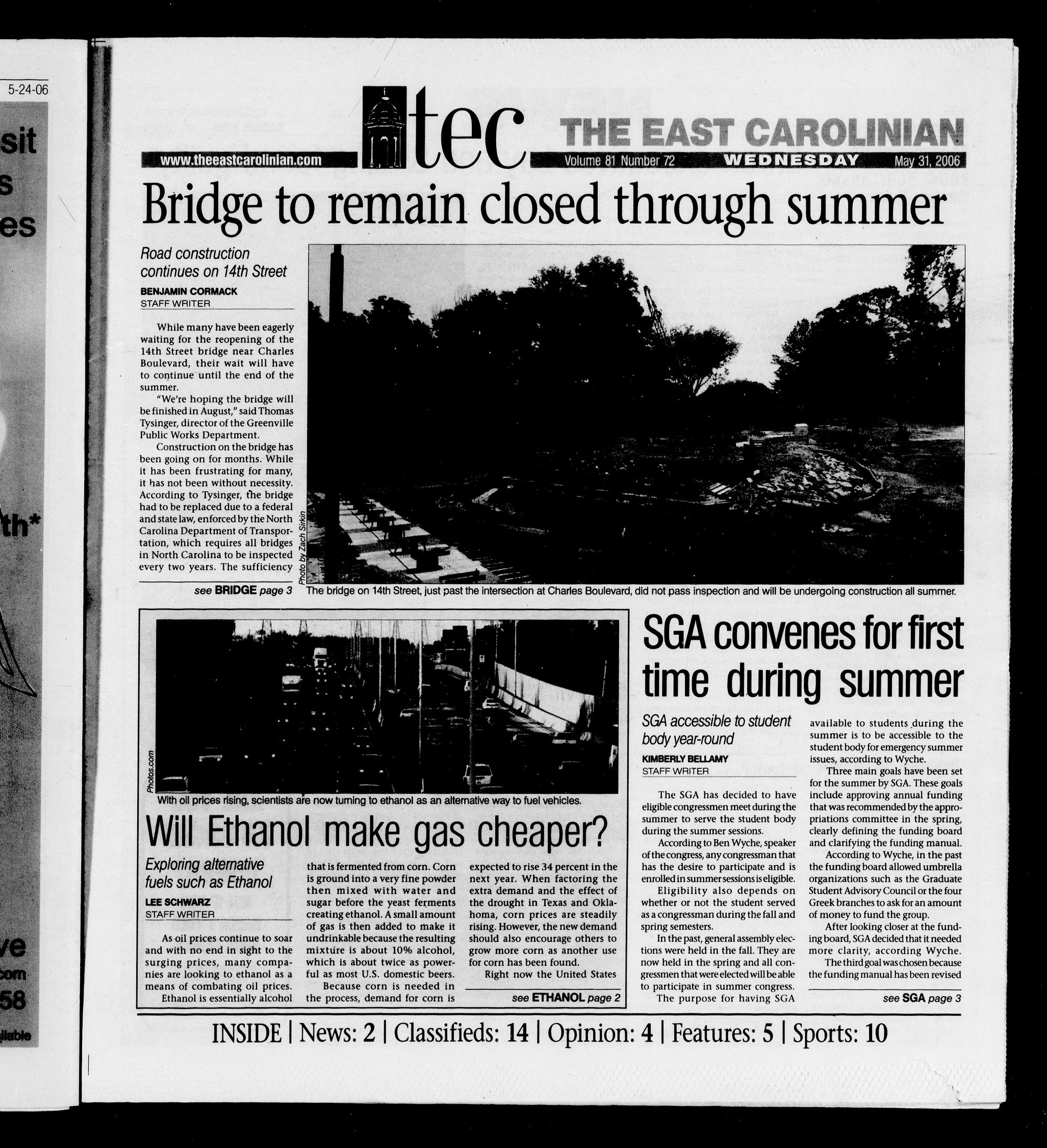 see BRIDGE page 3 The bridge on 14th Street, just past the intersection at Charles Boulevard, did not pass inspection and will be undergoing construction all summer.