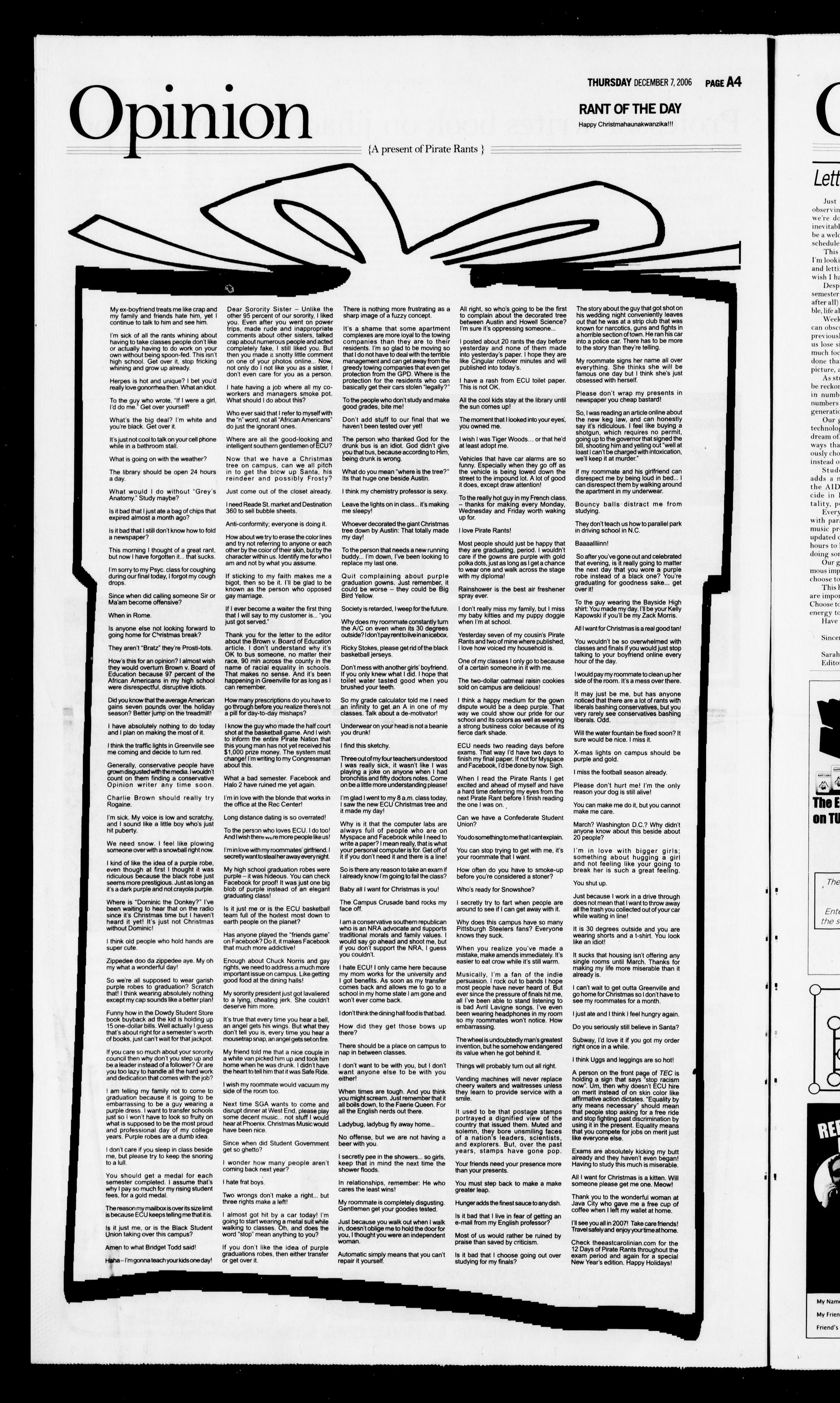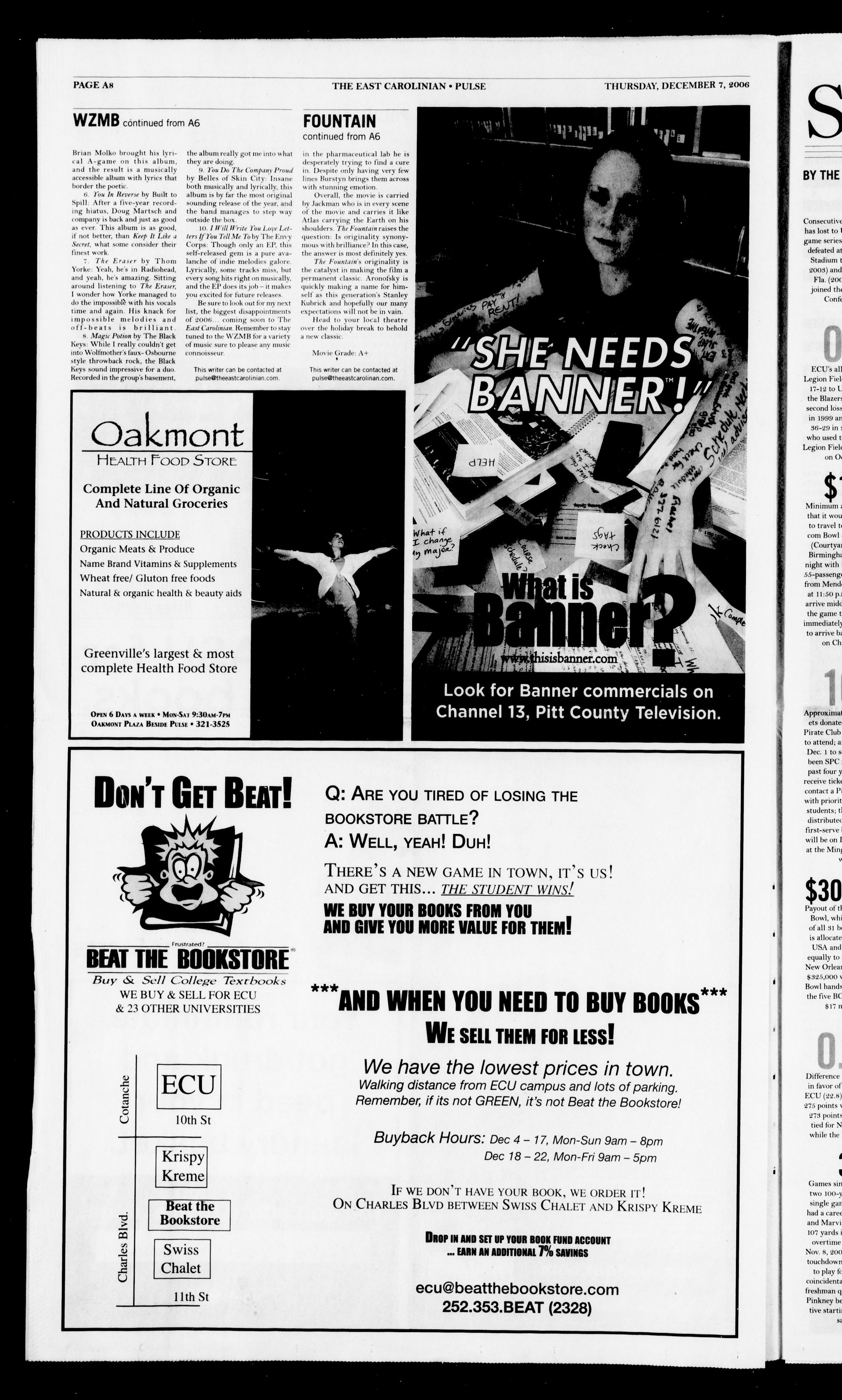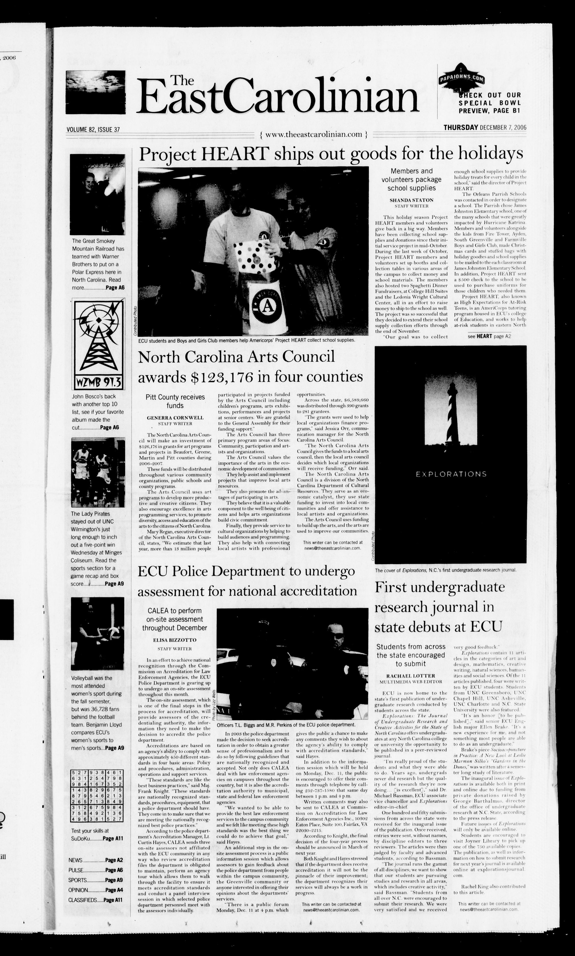 East Carolina's student-run campus newspaper was first published in 1923 as the East Carolina Teachers College News (1923-1925). It has been re-named as The Teco Echo (1925, 1926-1952), East Carolinian (1952-1969), Fountainhead (1969-1979), and The East Carolinian (1969, 1979-present). It includes local, state, national, and international stories with a focus on campus events.
