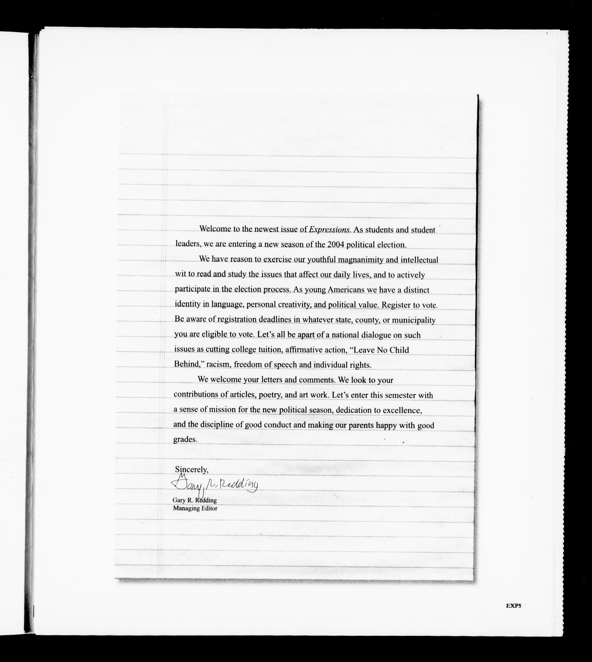 Welcome to the newest issue of Expressions. As students and student