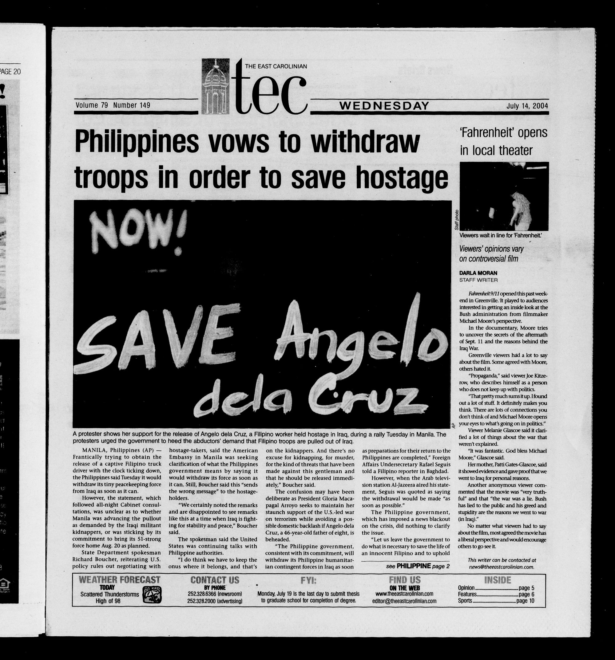 A protester shows her support for the release of Angelo dela Cruz, a Filipino worker held hostage in Iraq, during a rally Tuesday in Manila. The