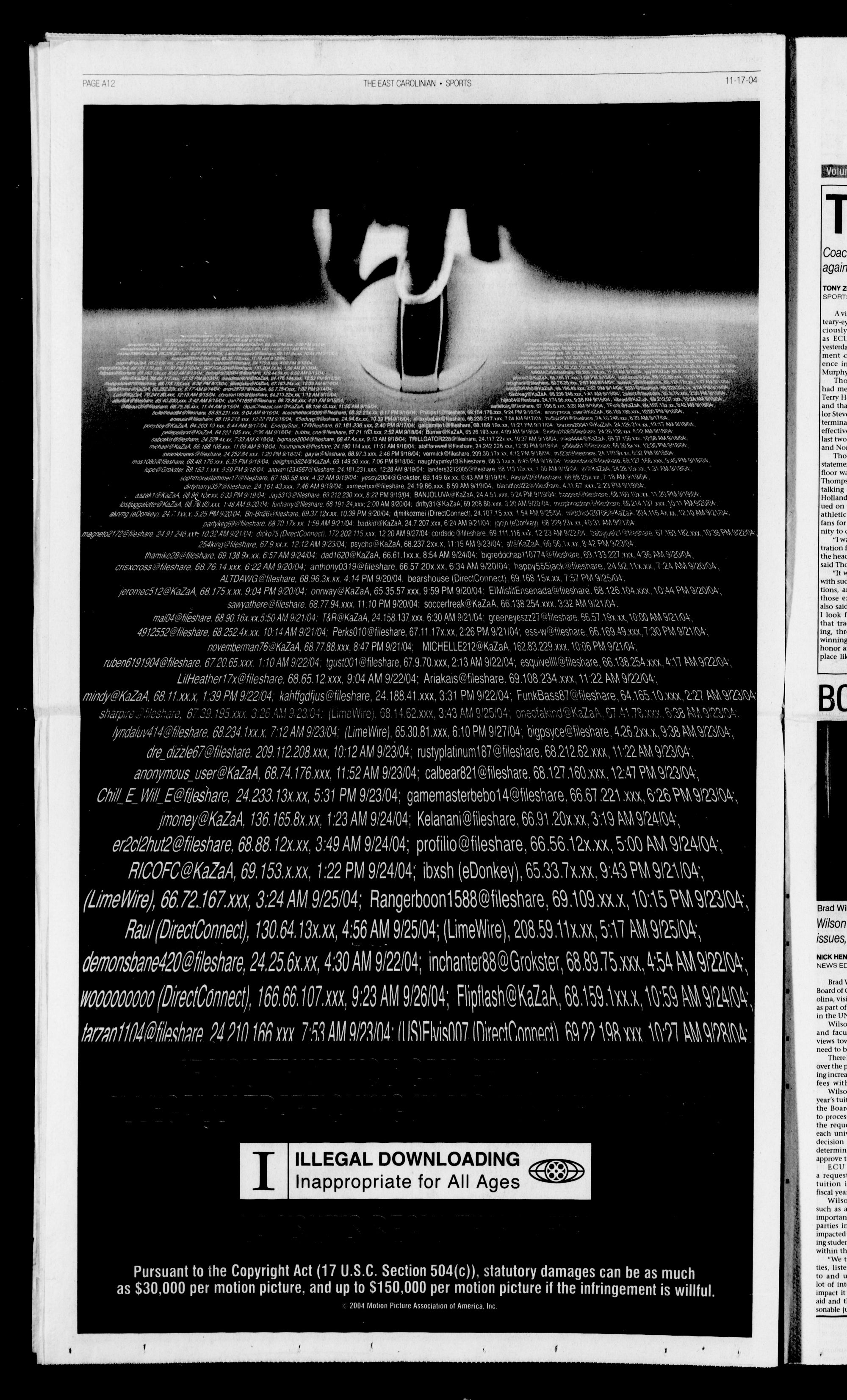 crisxcross&fileshare, 68.76. U.xxx 6:22AM92004; anthony0319@iileshare, 66.57.20x.xx, 6:34 AM 92004, happv5b5a@esa,2aiA1rmWA