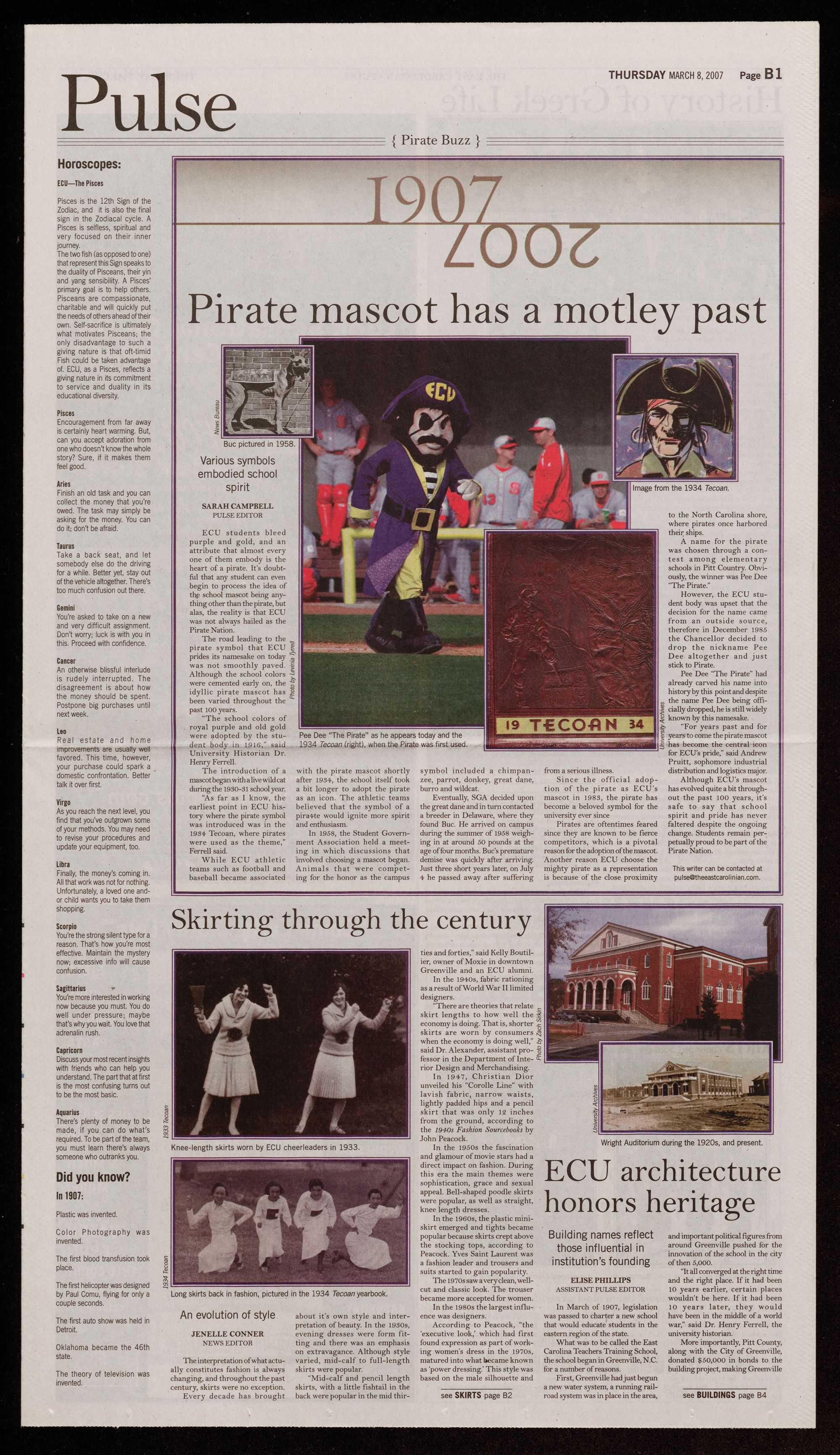 East Carolina's student-run campus newspaper was first published in 1923 as the East Carolina Teachers College News (1923-1925). It has been re-named as The Teco Echo (1925, 1926-1952), East Carolinian (1952-1969), Fountainhead (1969-1979), and The East Carolinian (1969, 1979-present). It includes local, state, national, and international stories with a focus on campus events.
