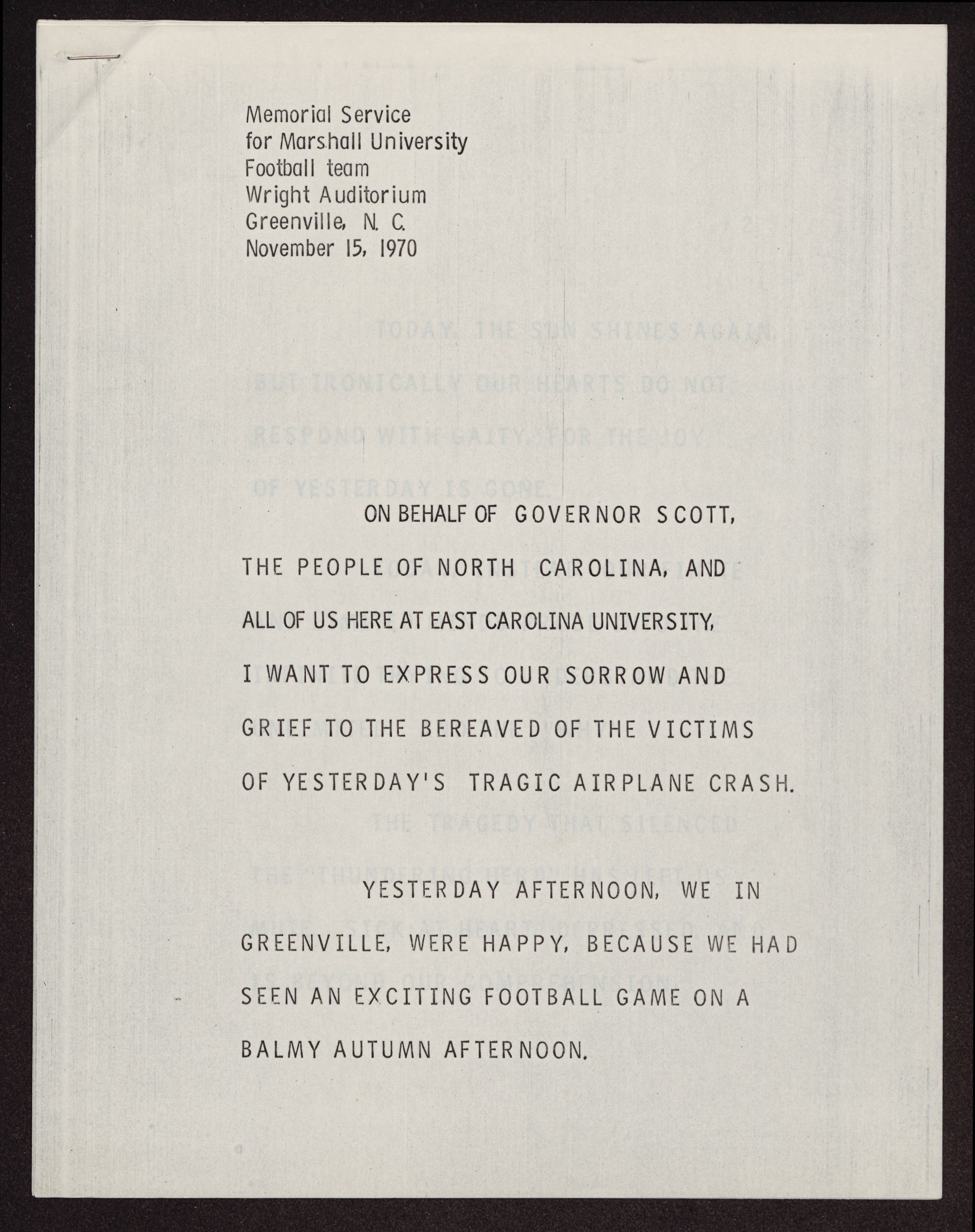 East Carolina University Chancellor Leo Jenkins' speech given at the memorial service to honor the Marshall University football team. The memorial service honored those who died in the plane crash on November 14, 1970. Marshall's football team was returning home from playing ECU when their plane crashed near Kenova and Ceredo, West Virginia killing 37 players, 8 coaches, 25 boosters, and 5 flight crew members. The event is also known as the Southern Airways Flight 932 tragedy.