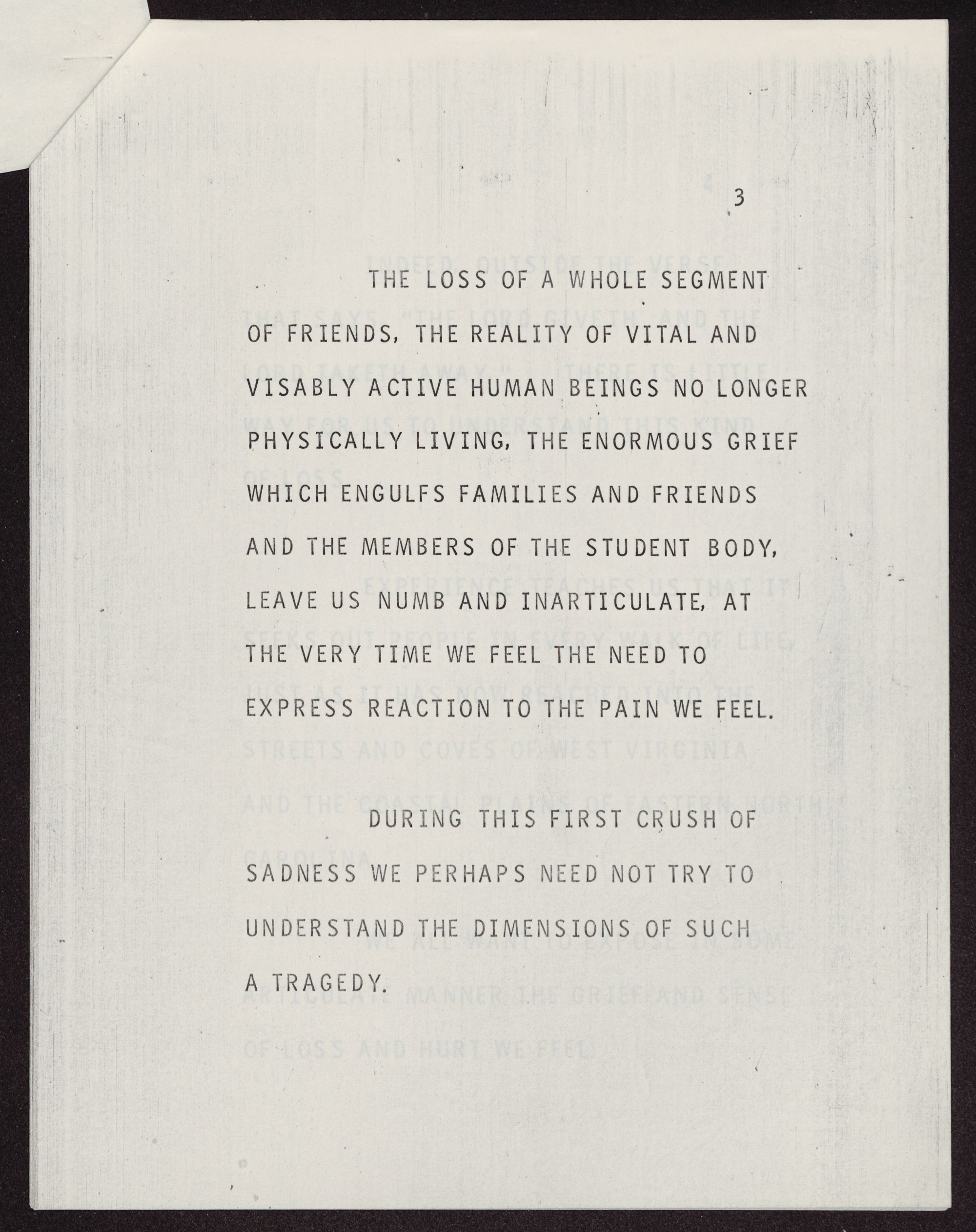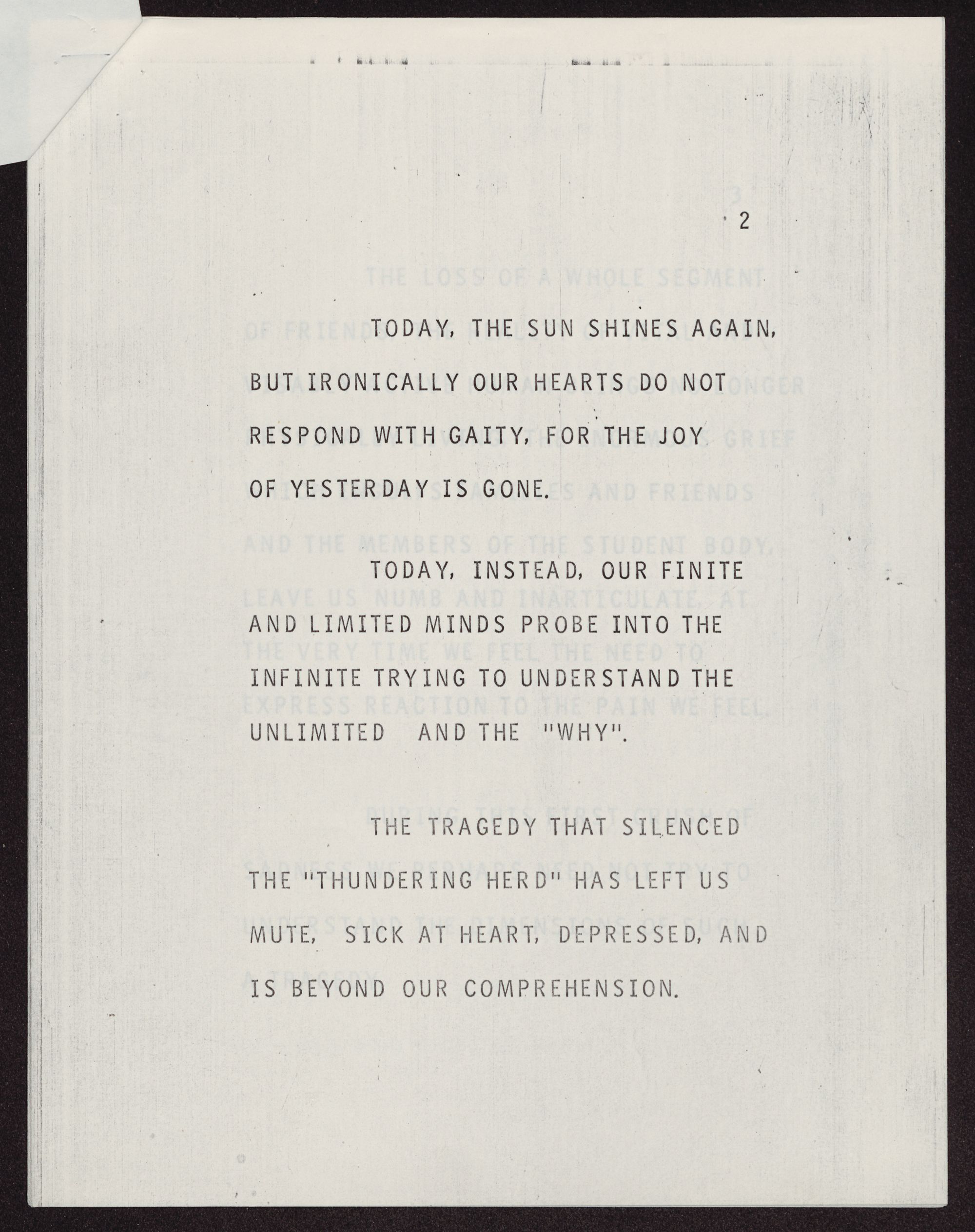 THE LOSS OF A WHOLE SEGMENT OF FRIENDS, THE REALITY OF VITAL AND VISIBLY ACTIVE HUMAN. BEINGS NO LONGER PHYSICALLY LIVING, THE ENORMOUS GRIEF WHICH ENGULFS FAMILIES AND FRIENDS AND THE MEMBERS OF THE STUDENT BODY, LEAVE US NUMB AND INARTICULATE, AT THE VERY TIME WE FEEL THE NEED TO EXPRESS REACTION TO THE PAIN WE FEEL.