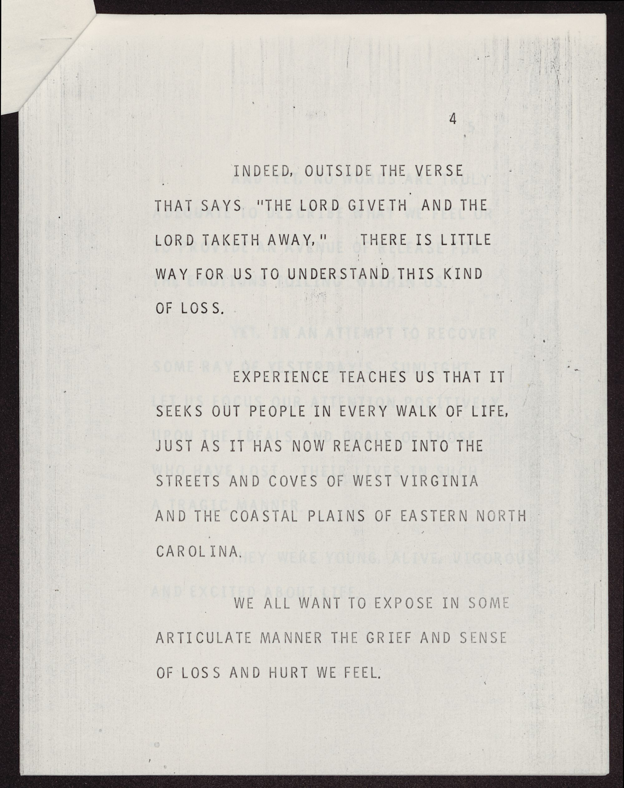 EXPERIENCE TEACHES US THAT IT SEEKS OUT PEOPLE IN EVERY WALK OF LIFE, JUST AS IT HAS NOW REACHED INTO THE STREETS AND COVES OF WEST VIRGINIA AND THE COASTAL PLAINS OF EASTERN NORTH CAROLINA.