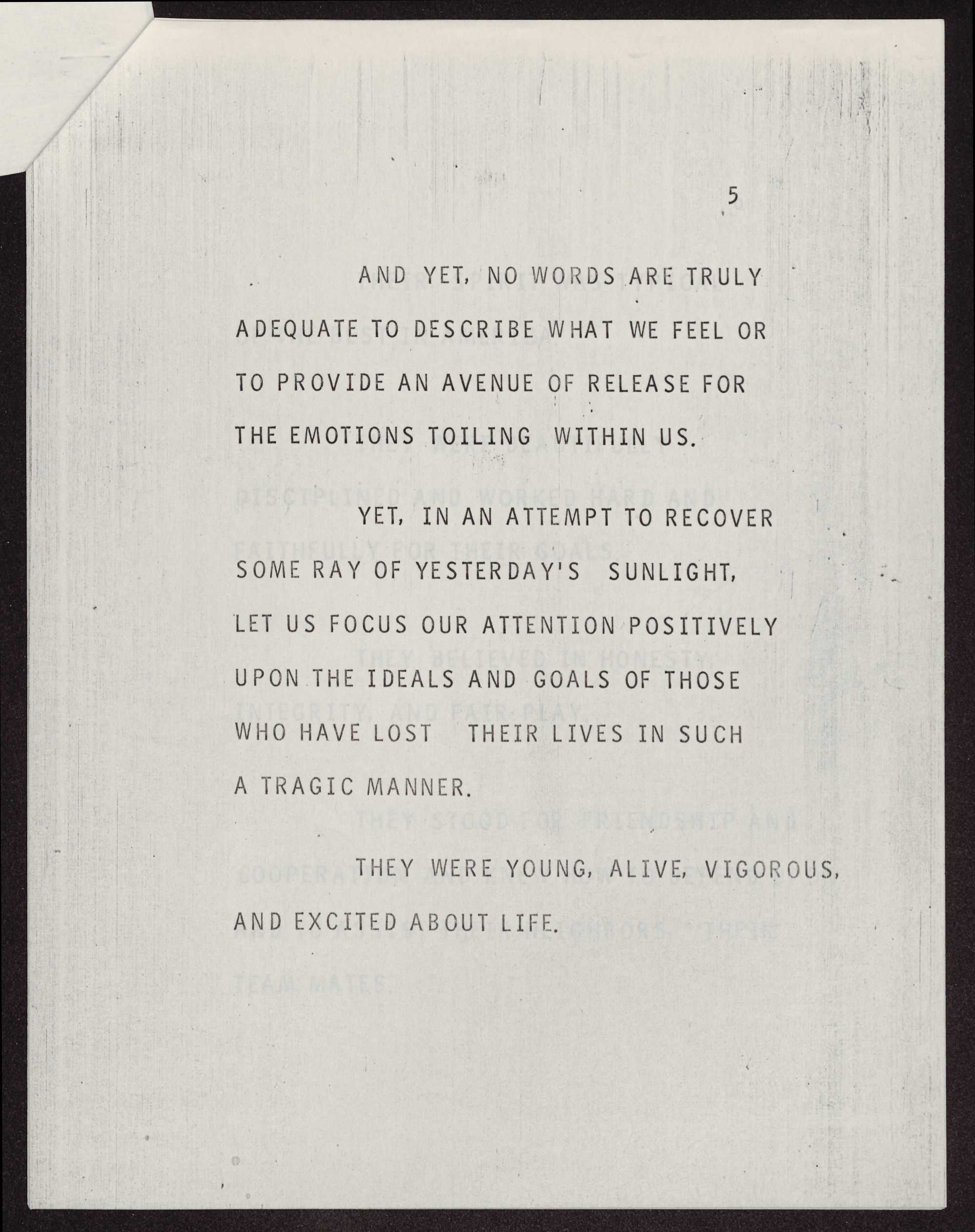 YET, IN AN ATTEMPT TO RECOVER SOME RAY OF YESTERDAY'S SUNLIGHT, LET US FOCUS OUR ATTENTION POSITIVELY UPON THE IDEALS AND GOALS OF THOSE WHO HAVE LOST THEIR LIVES IN SUCH A TRAGIC MANNER.