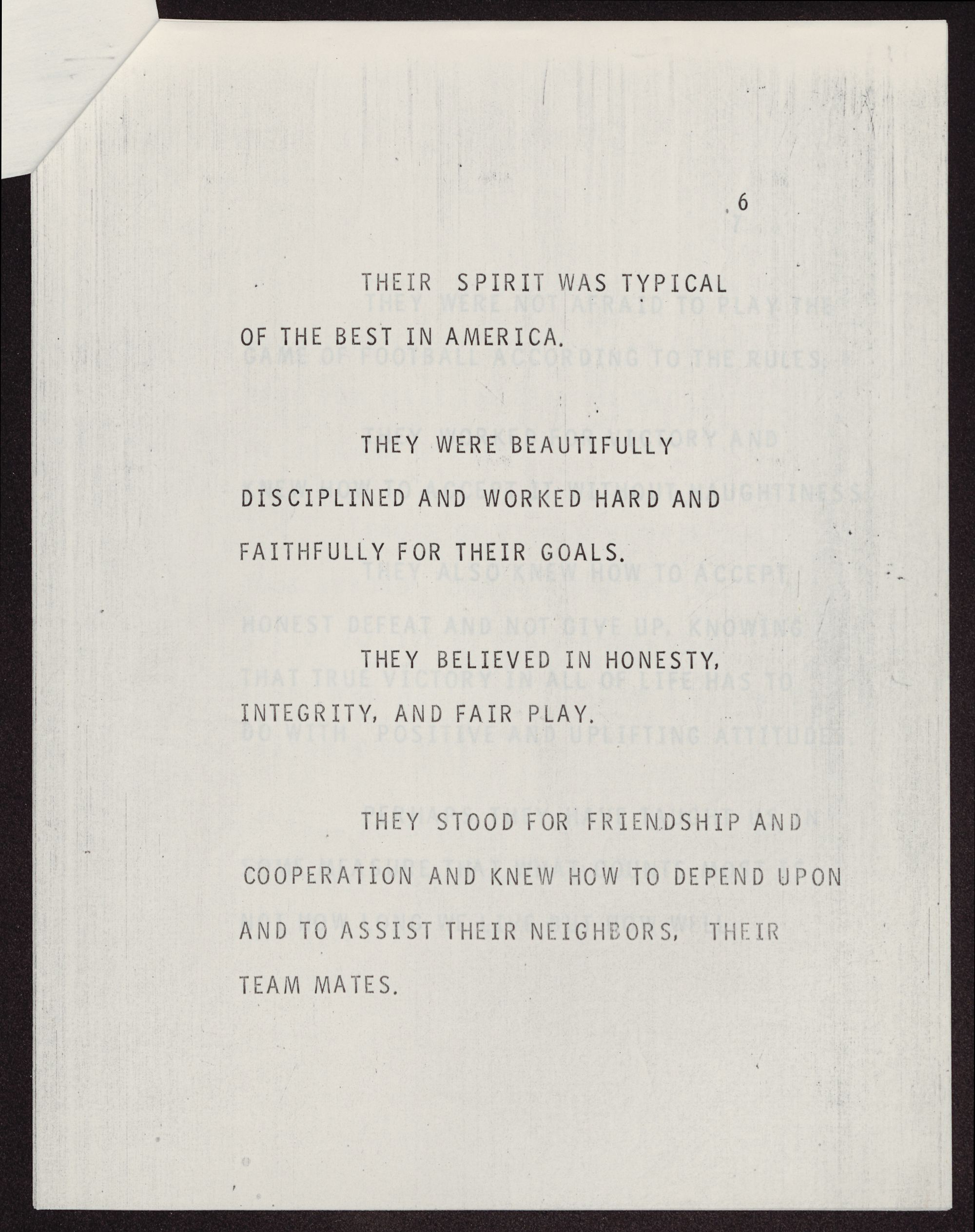THEY STOOD FOR FRIENDSHIP AND COOPERATION AND KNEW HOW TO DEPEND UPON AND TO ASSIST THEIR NEIGHBORS, THEIR TEAM MATES.