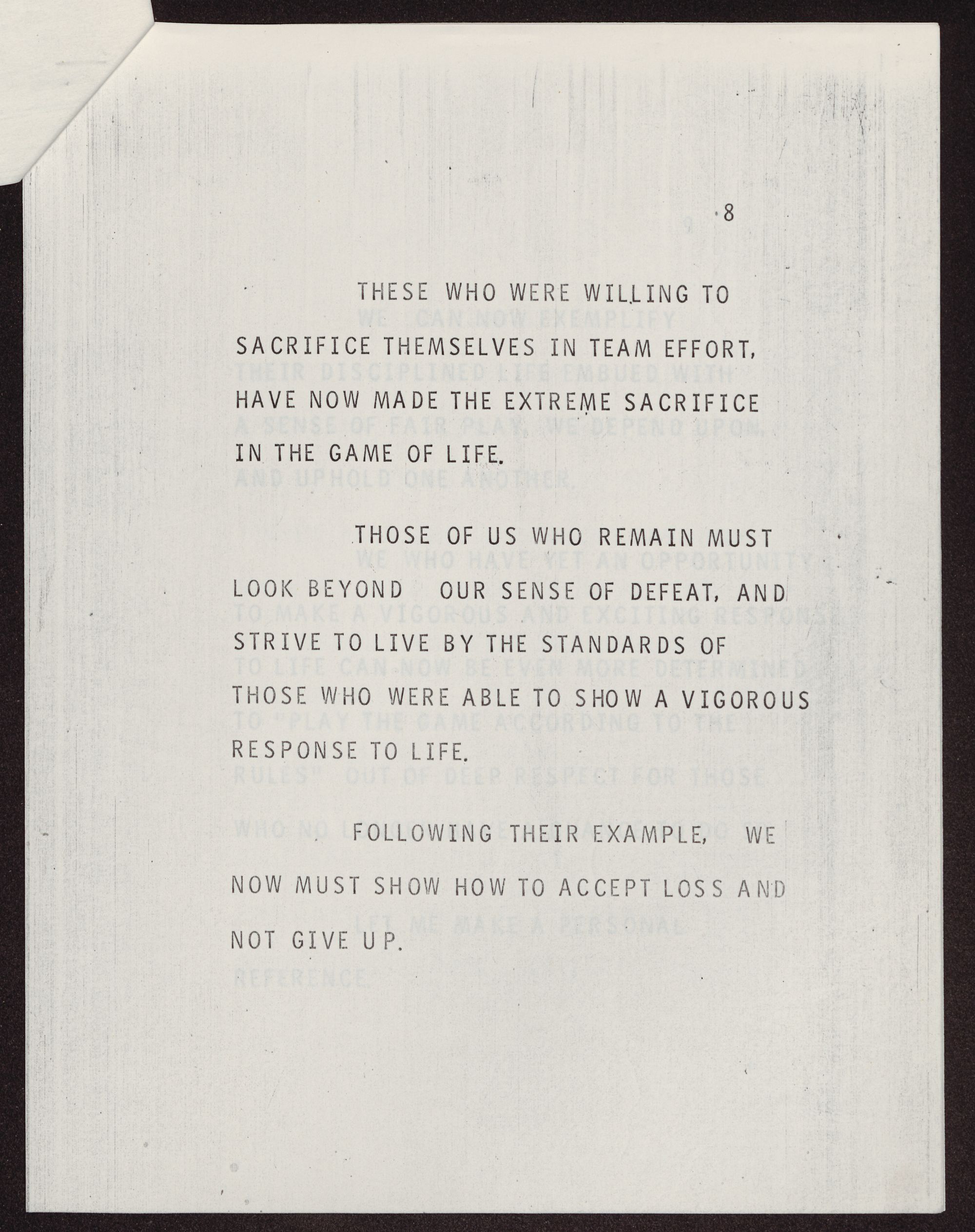 THOSE OF US WHO REMAIN MUST LOOK BEYOND OUR SENSE OF DEFEAT, AND STRIVE TO LIVE BY THE STANDARDS OF THOSE WHO WERE ABLE TO SHOW A VIGOROUS RESPONSE TO LIFE.