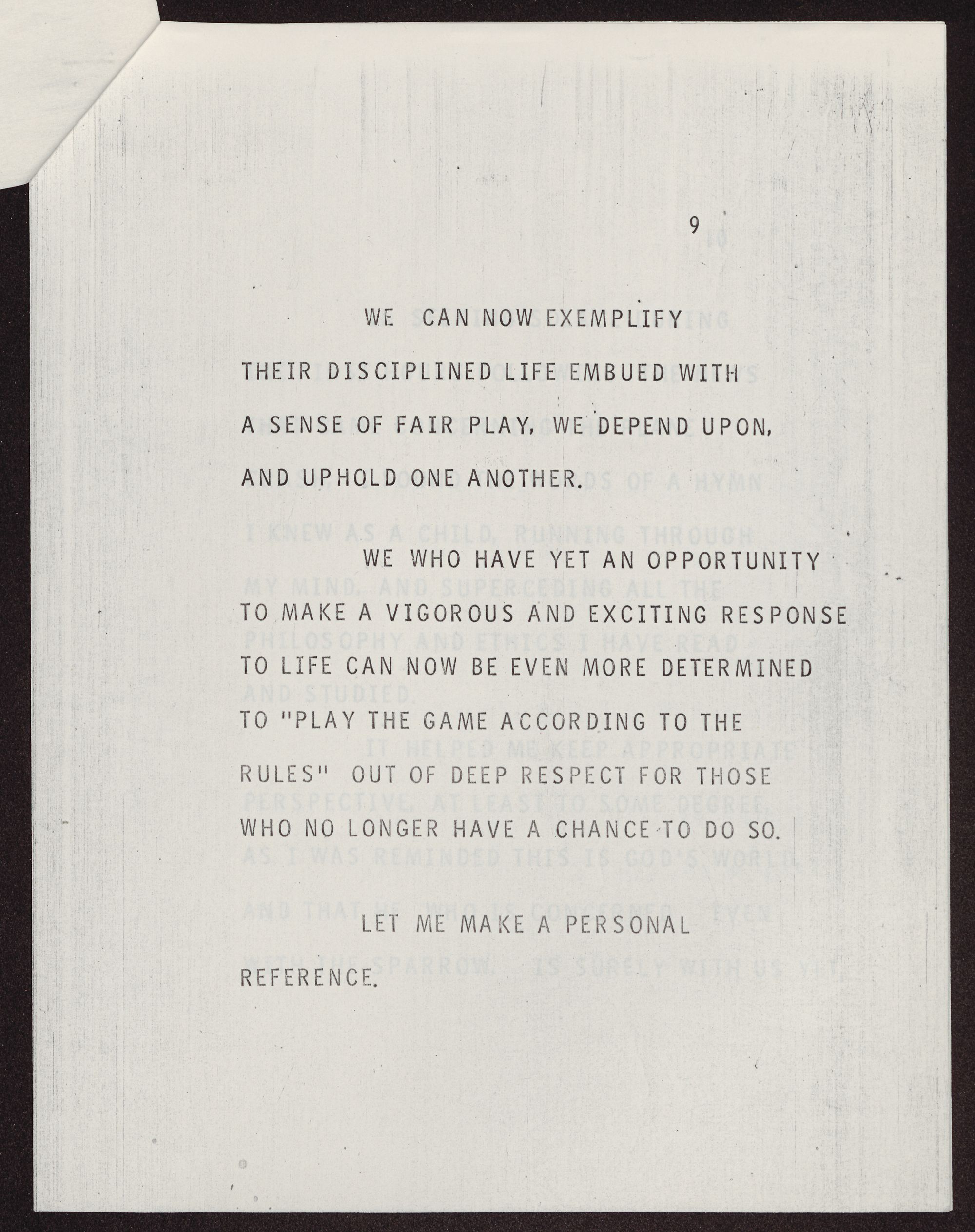WE WHO HAVE YET AN OPPORTUNITY TO MAKE A VIGOROUS AND EXCITING RESPONSE TO LIFE CAN NOW BE EVEN MORE DETERMINED TO "PLAY THE GAME ACCORDING TO THE RULES" OUT OF DEEP RESPECT FOR THOSE HO NO LONGER HAVE A CHANCE TO DO SO.