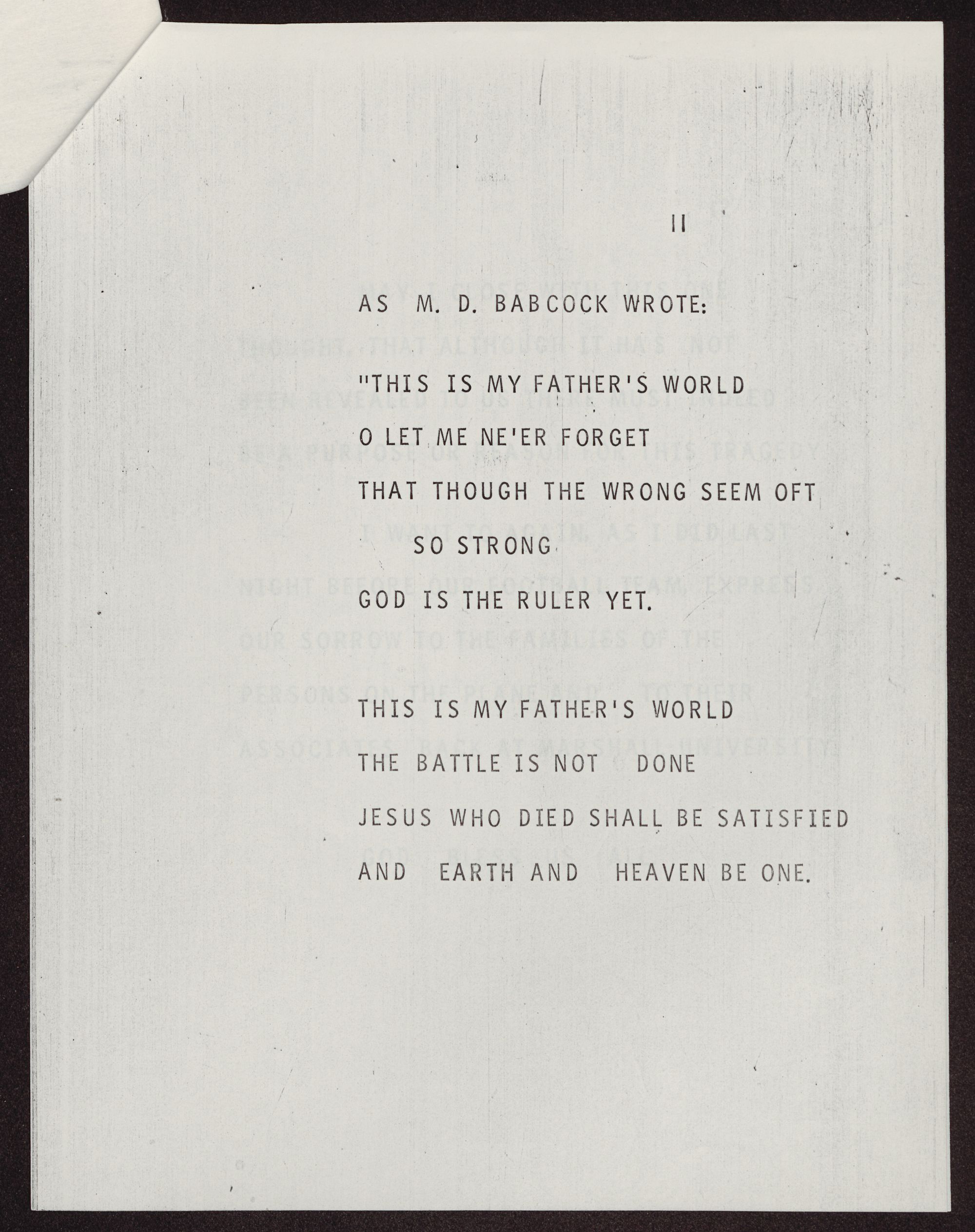 "THIS IS MY FATHER'S WORLD O LET ME NE'ER FORGET THAT THOUGH THE WRONG SEEM OFT SO STRONG GOD IS THE RULER YET.