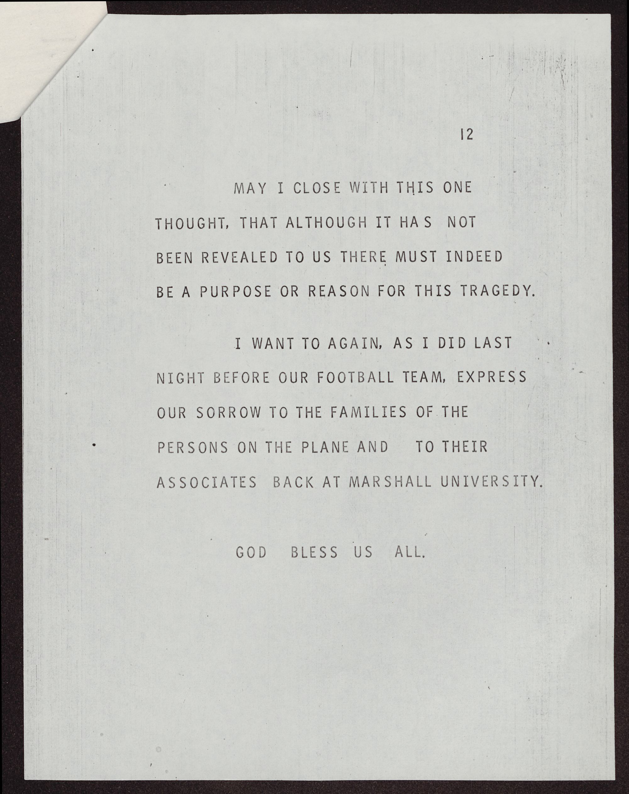 I WANT TO AGAIN, AS I DID LAST NIGHT BEFORE OUR FOOTBALL TEAM, EXPRESS OUR SORROW TO THE FAMILIES OF THE PERSON ON THE PLANE AND TO THEIR ASSOCIATES BACK AT MARSHAL UNIVERSITY