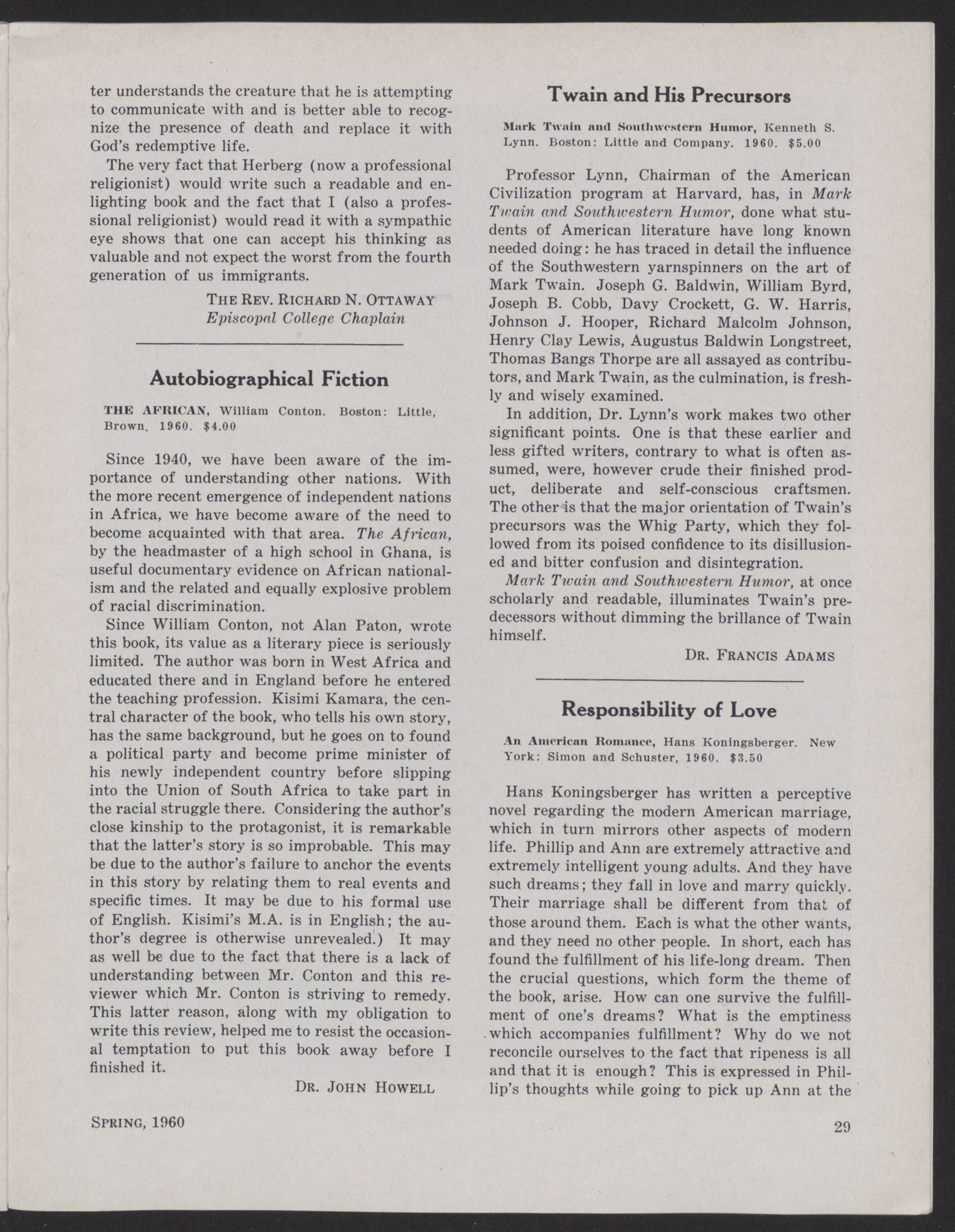 Reviews by The Rev, Richard N. Ottaway, Dr. Sohh. Howell,