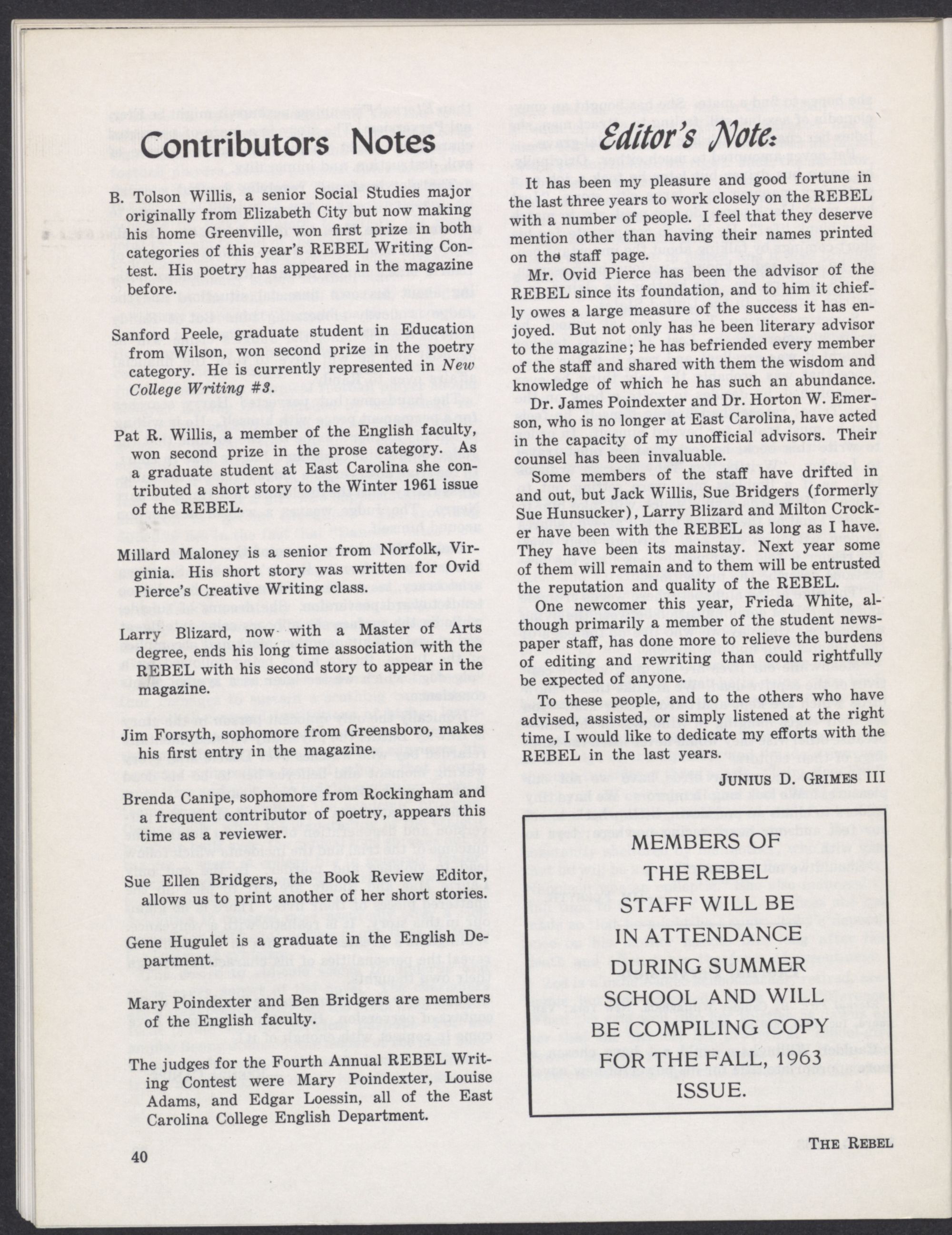1420, E.C.C., Greenville, North Carolina. Editorial and business offices