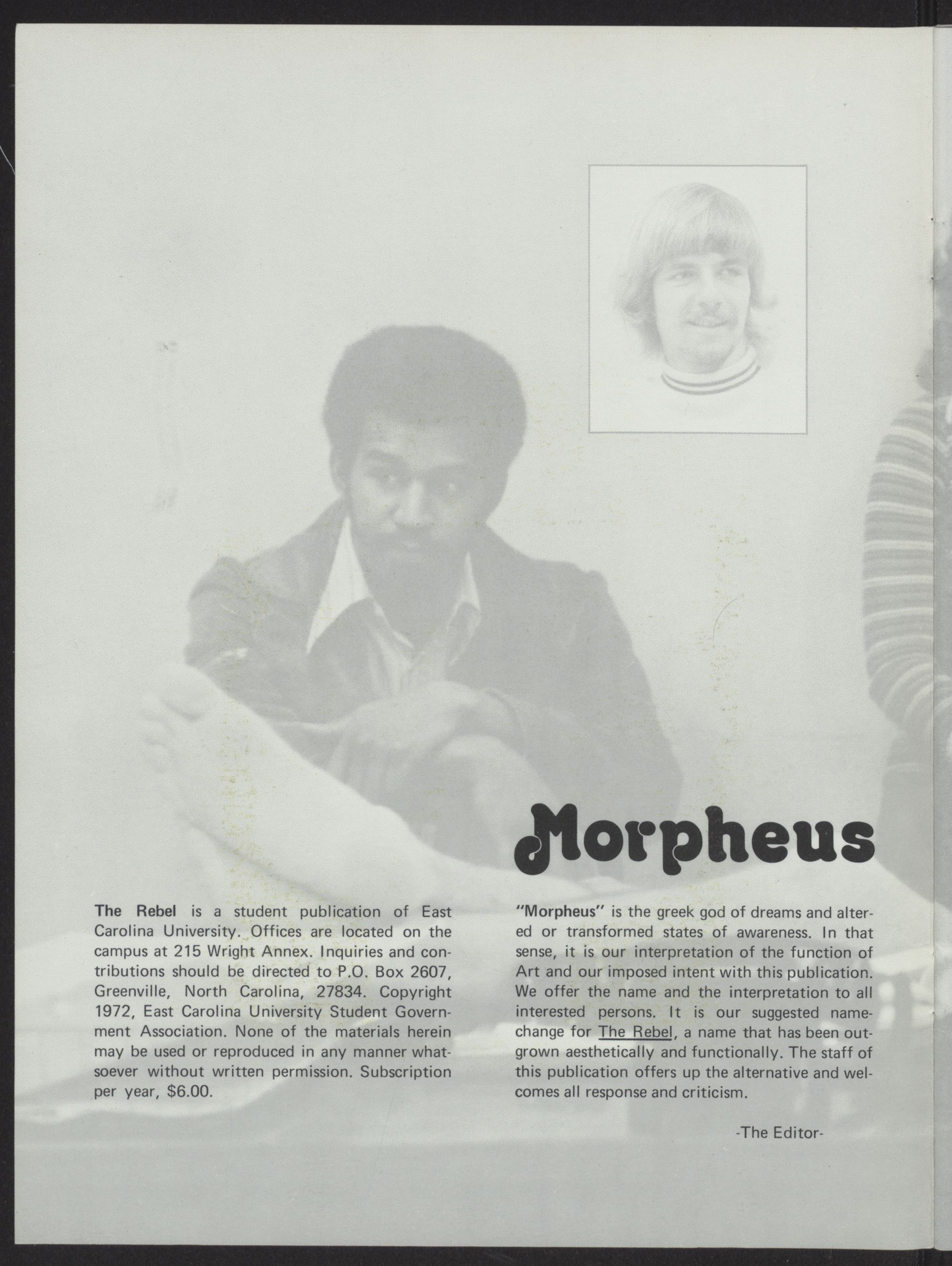 The Rebel was originally published in Fall 1958. The purpose of the magazine was to showcase the artwork and creative writing of the East Carolina University student body. The Rebel is printed with non-state funds. Beginning in the 1990s some volumes included a CD with featured music.
