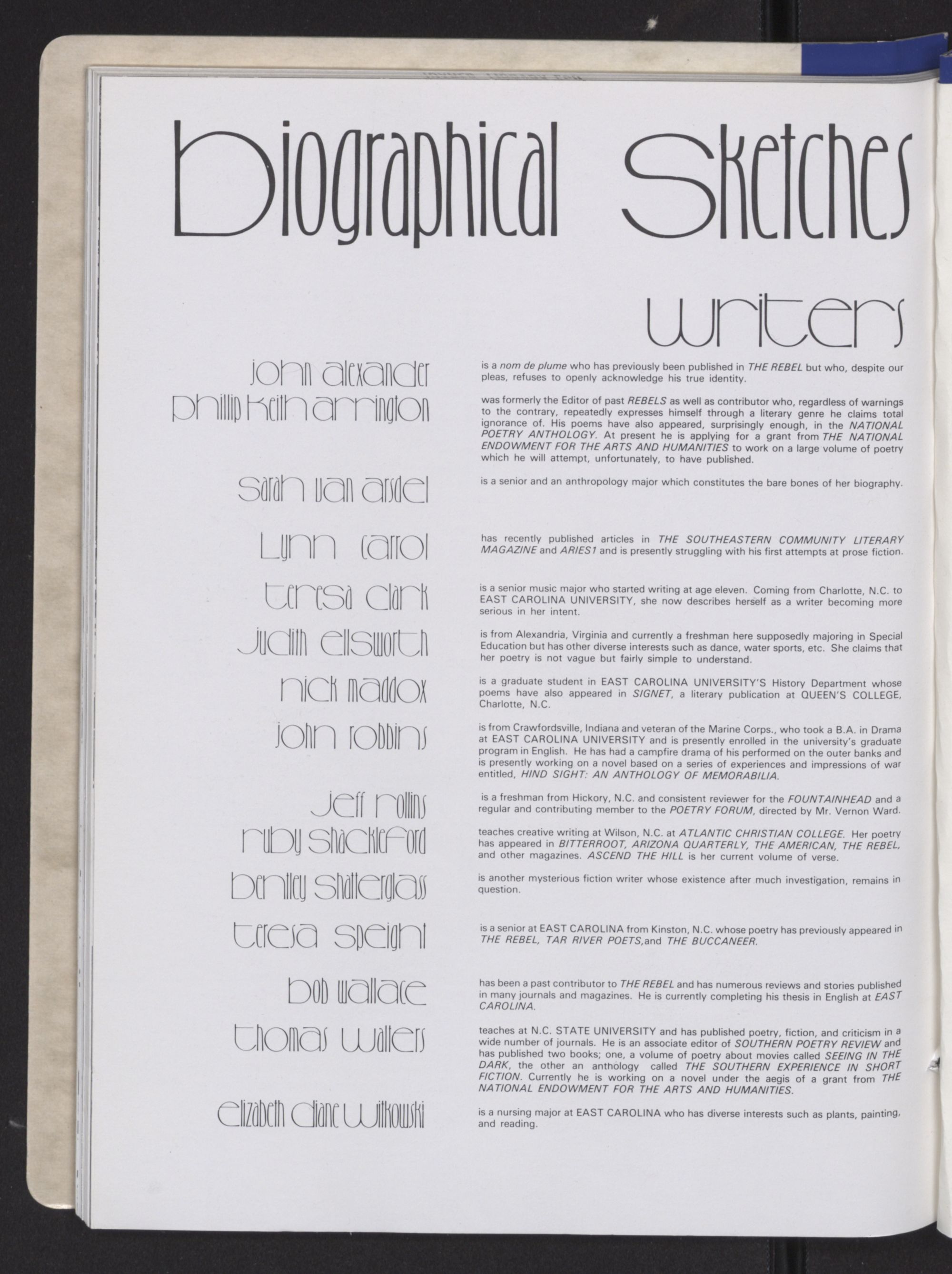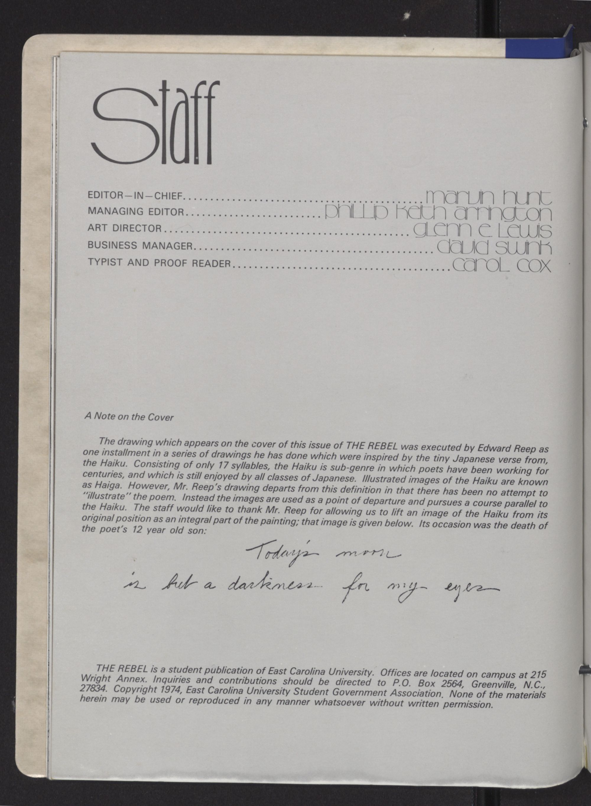 27834. Copyright 1974, East Carolina University Student Government Association. None of the materials
