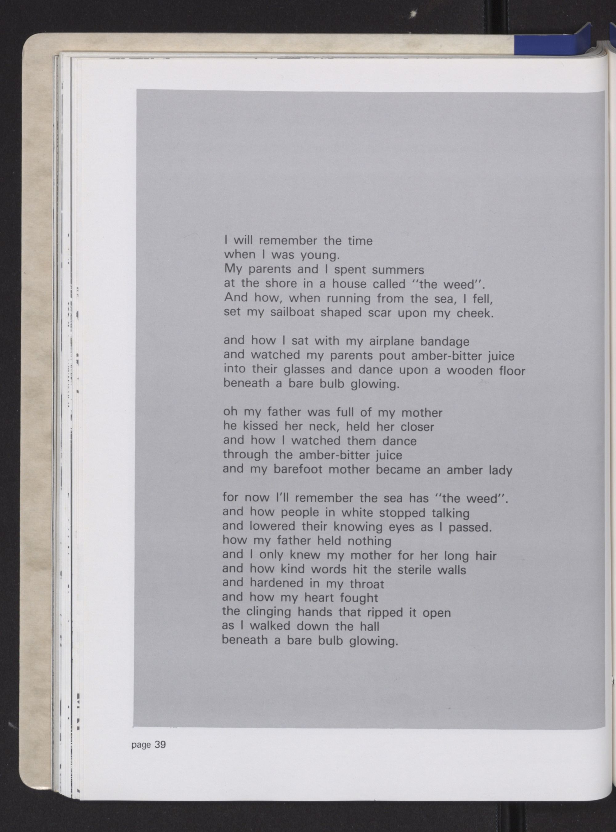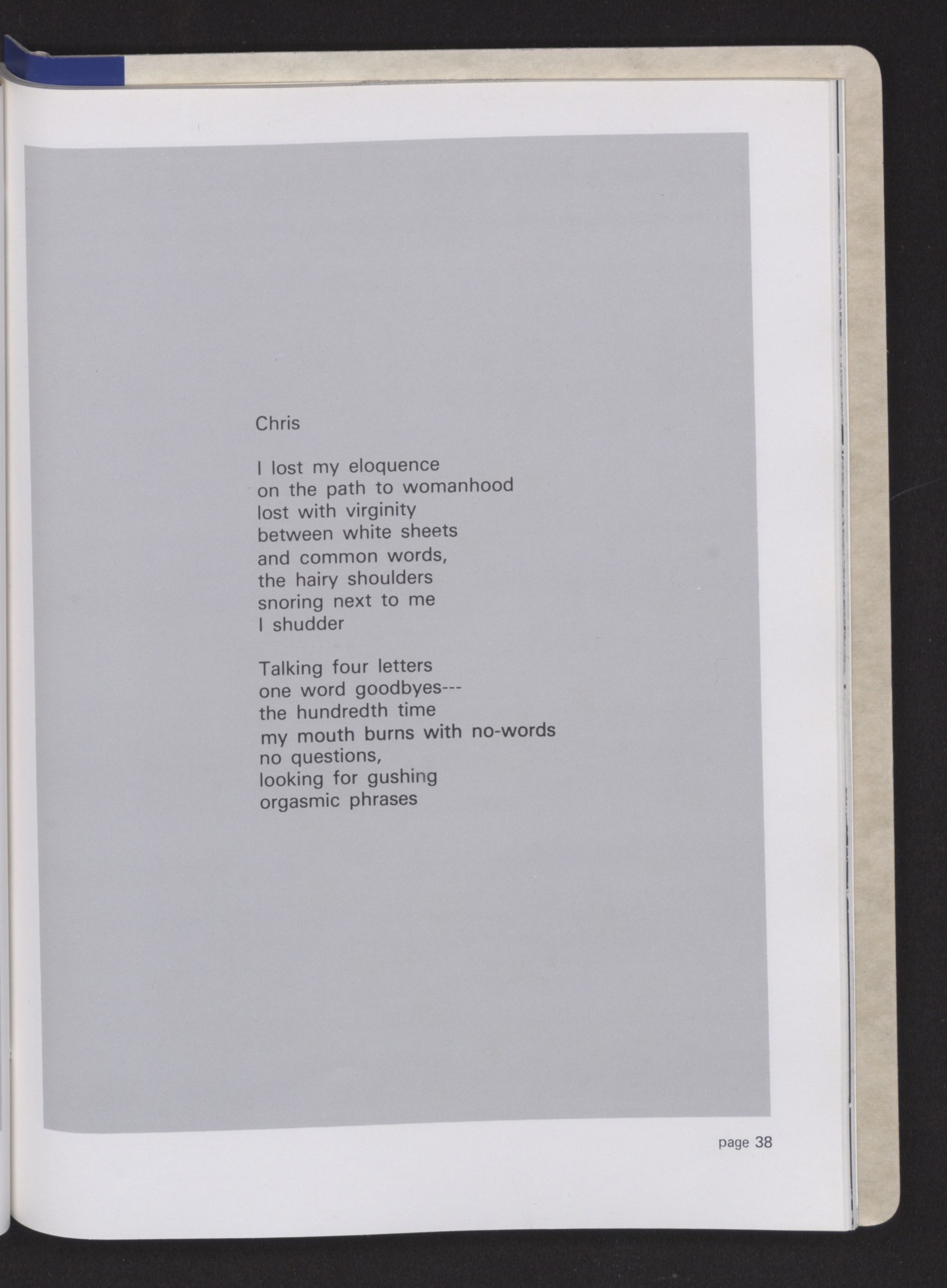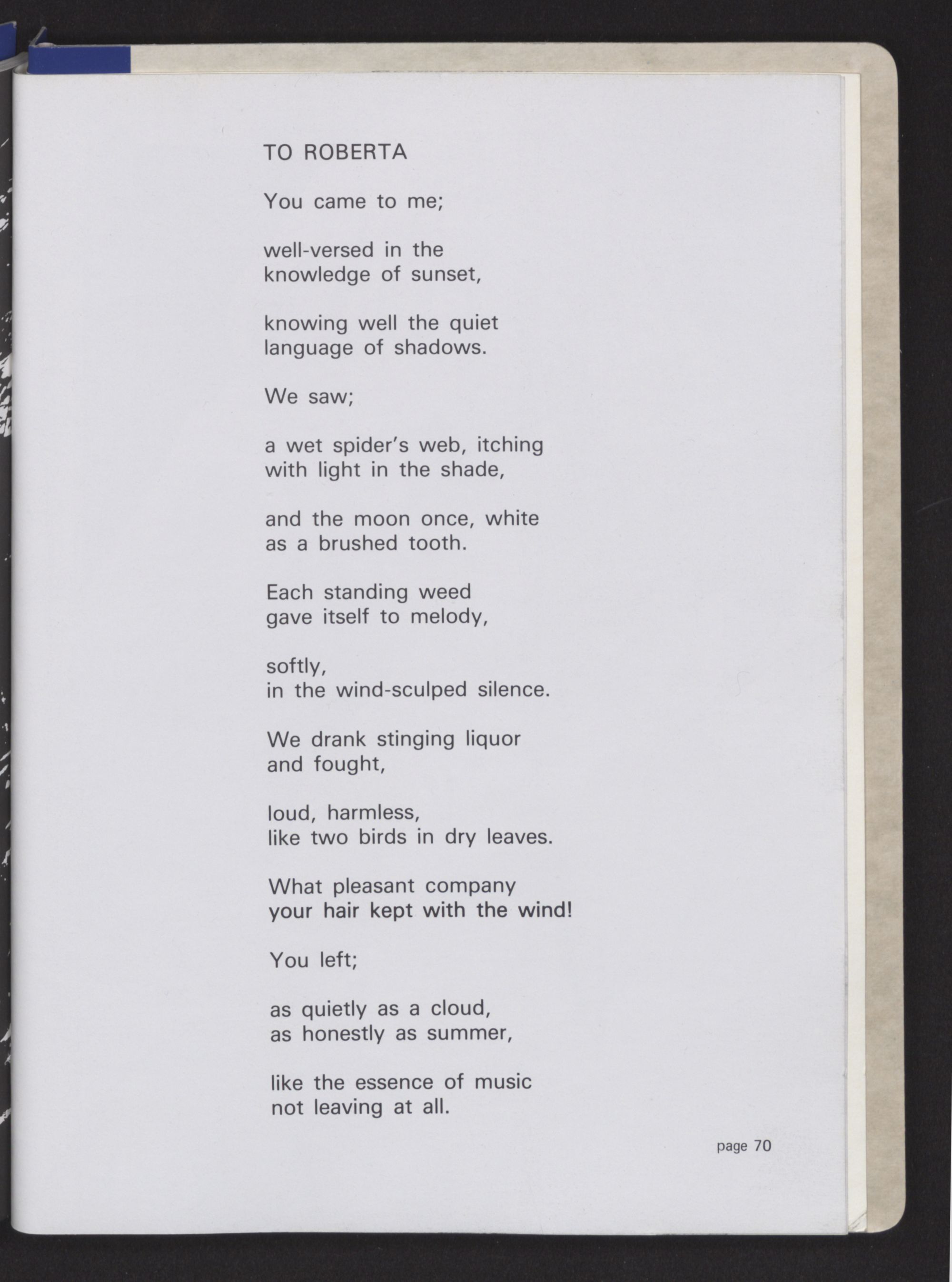 teaches creative writing at Wilson, N.C. at ATLANTIC CHRISTIAN COLLEGE. Her poetry