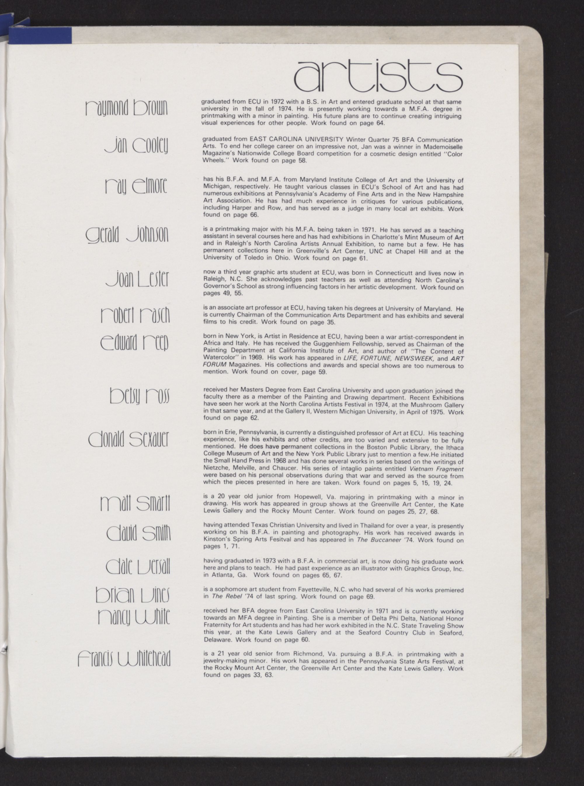 Lewis Gallery and the Rocky Mount Center. Work found on pages 25, 27, 68.