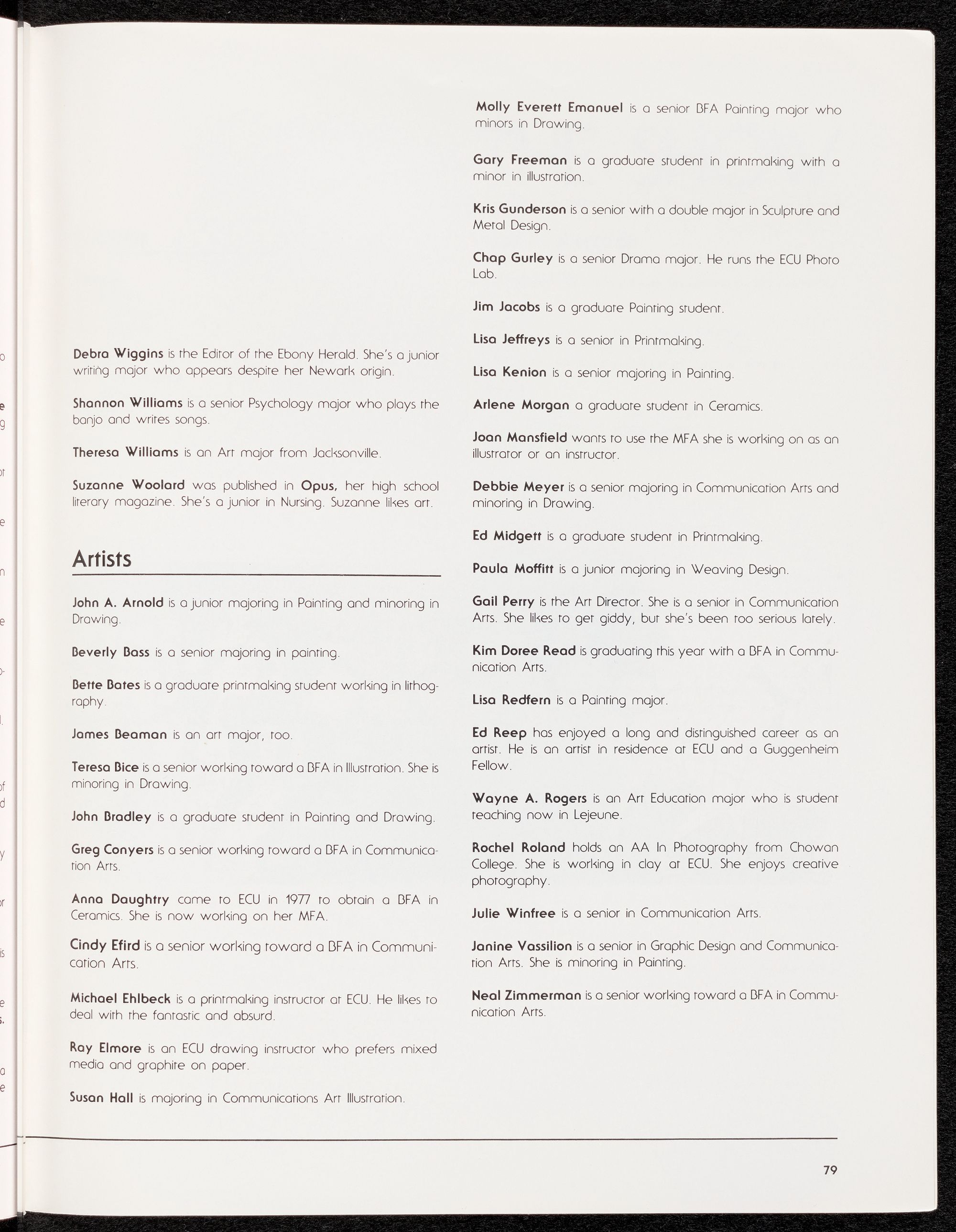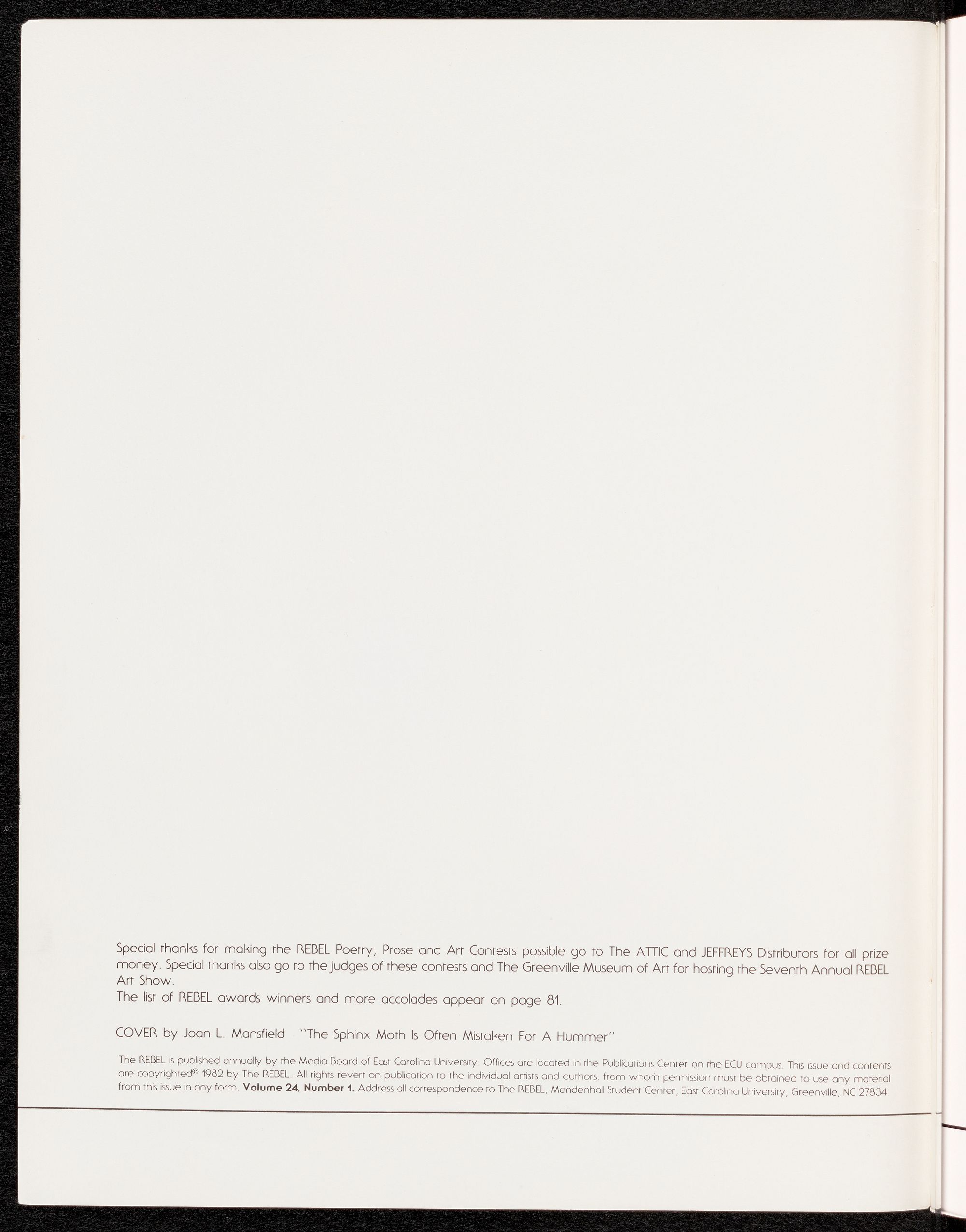 from this issue in any form. Volume 24, Number 1. Address all correspondence to The REBEL, Mendenhall Srudent Cenrer, East Carolina University, Greenville, NC 27834