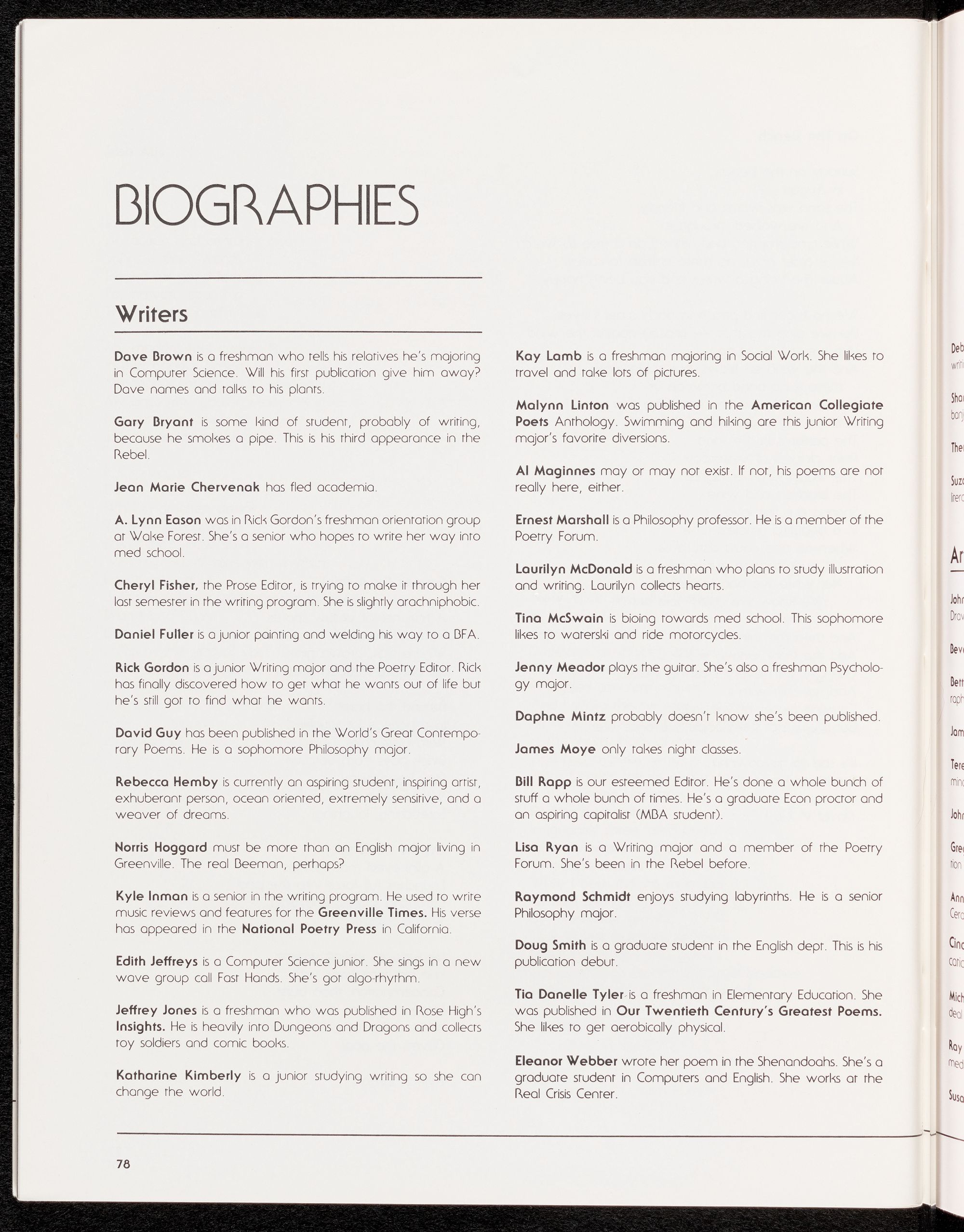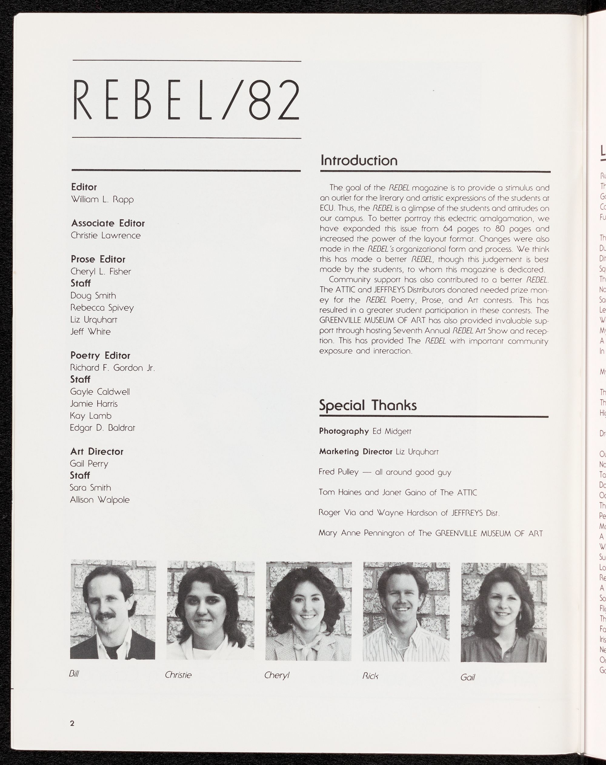 The REBEL is published annually by the Media Board of East Carolina Universiry. Offices are located in the Publications Center on the ECU campus. This issue and conrents