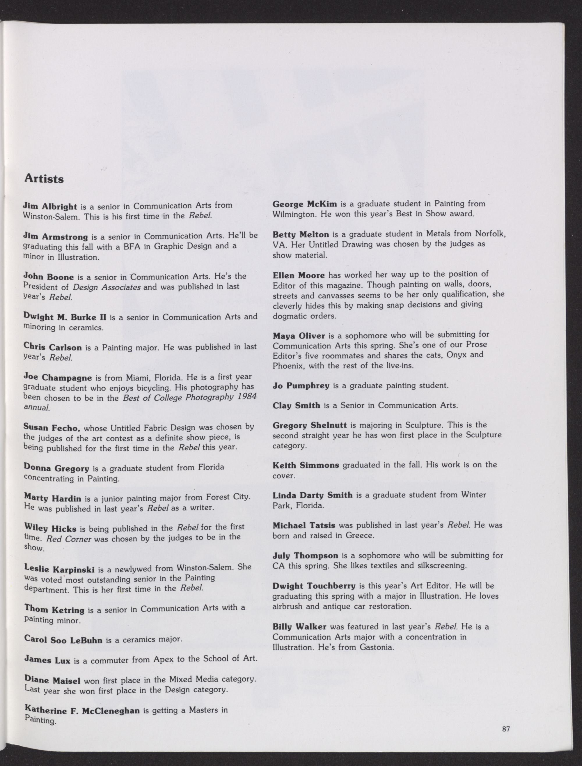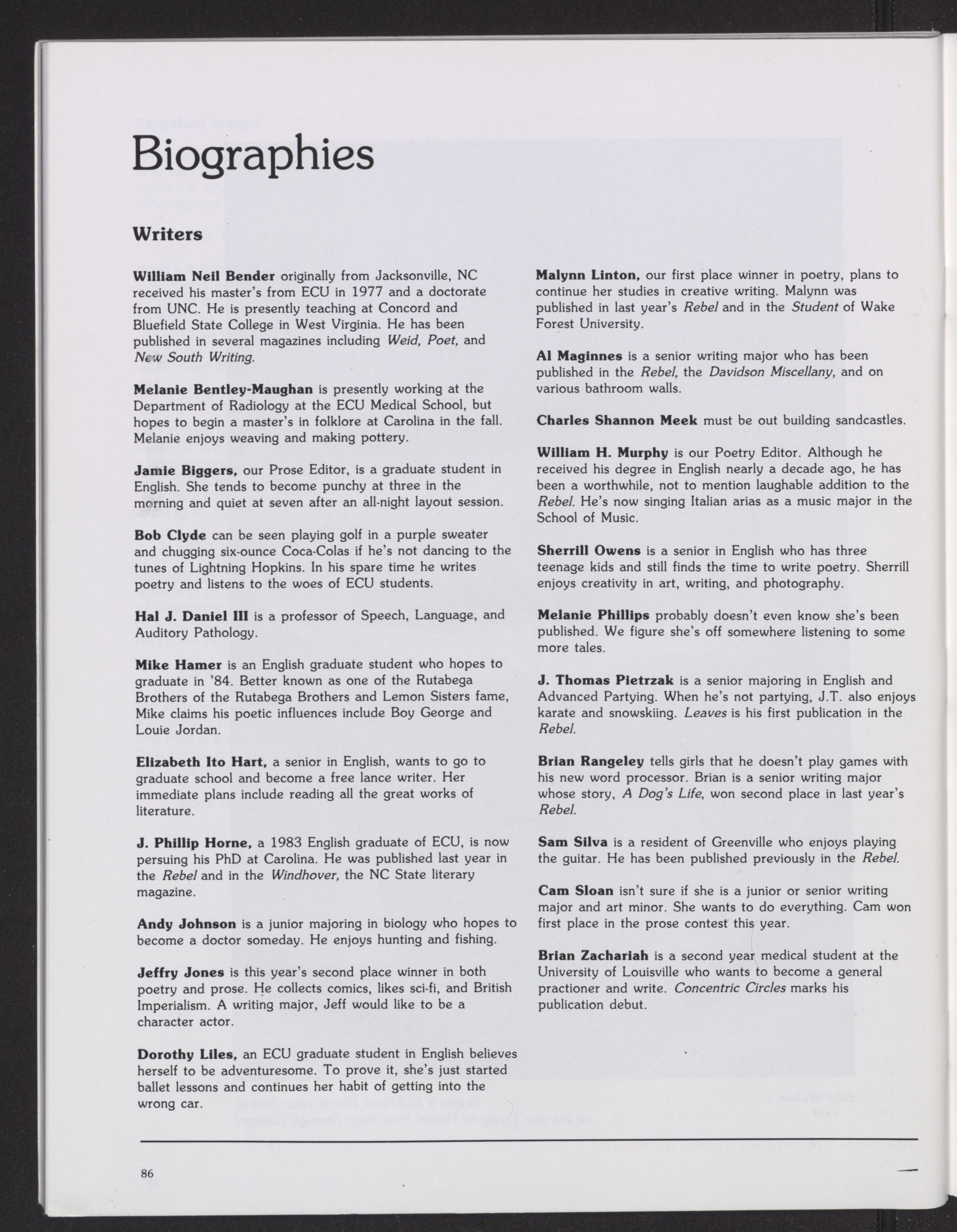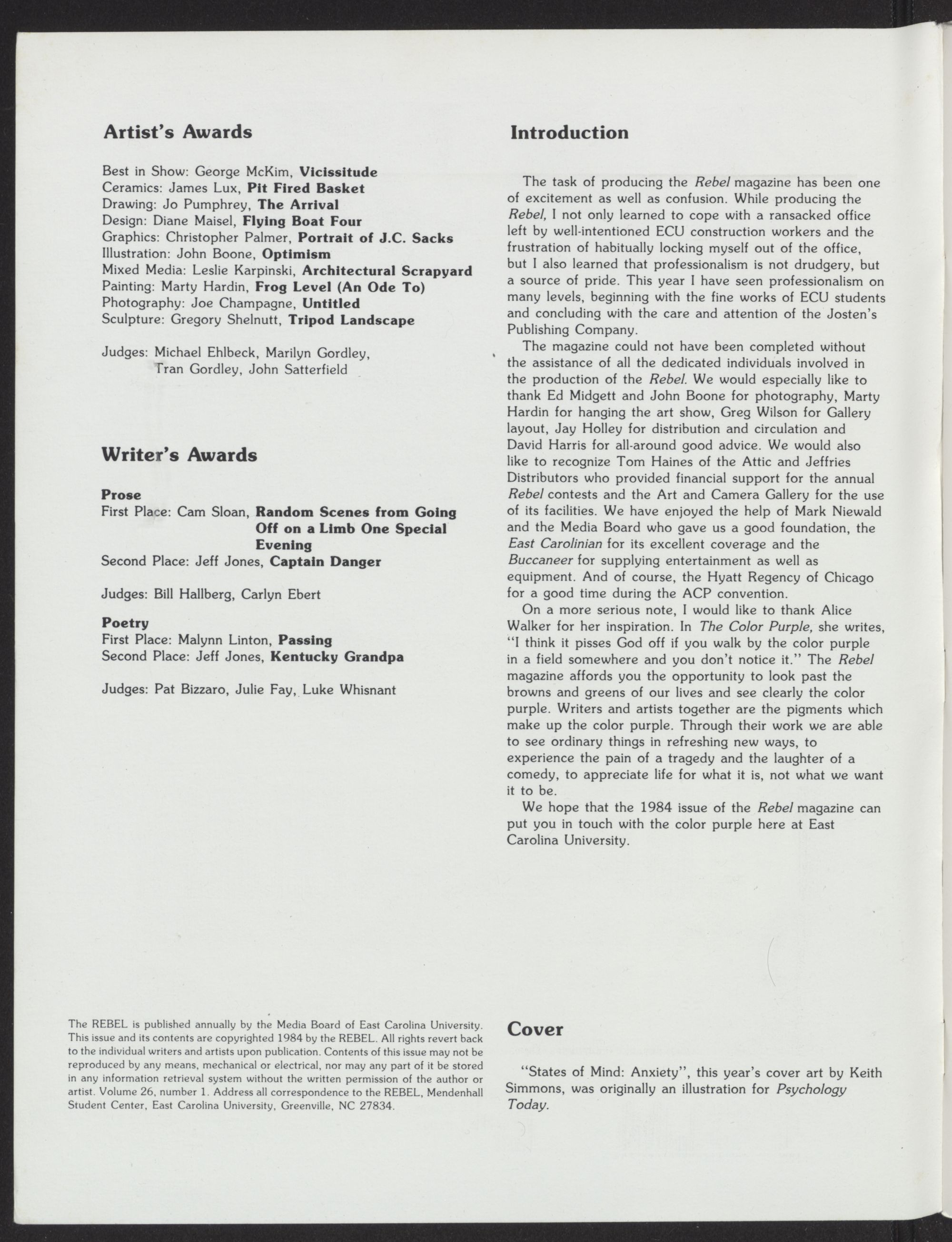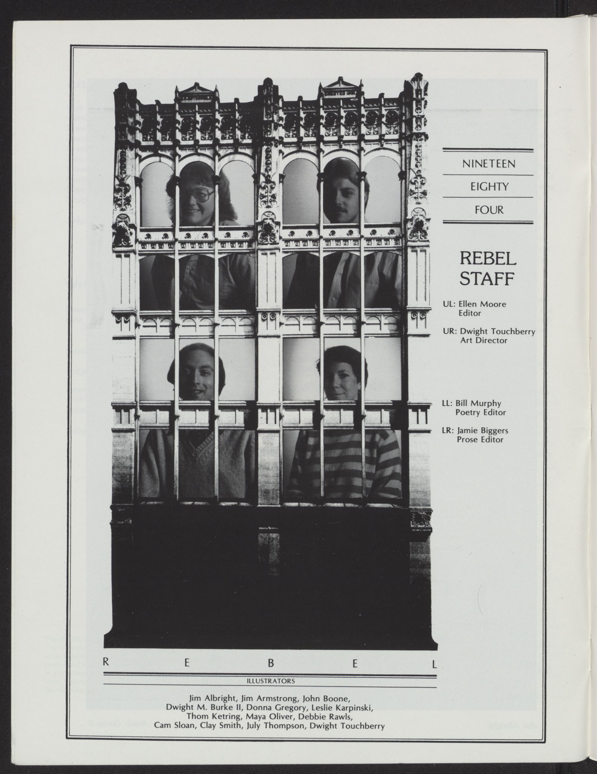 The Rebel was originally published in Fall 1958. The purpose of the magazine was to showcase the artwork and creative writing of the East Carolina University student body. The Rebel is printed with non-state funds. Beginning in the 1990s some volumes included a CD with featured music.