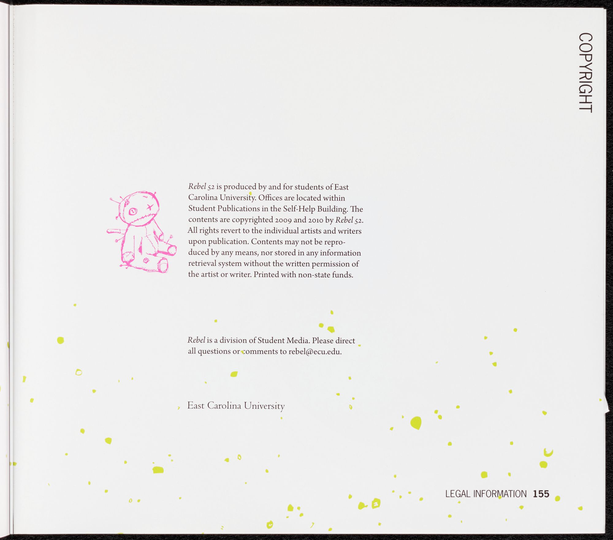 The Rebel was originally published in Fall 1958. The purpose of the magazine was to showcase the artwork and creative writing of the East Carolina University student body. The Rebel is printed with non-state funds. Beginning in the 1990s some volumes included a CD with featured music.