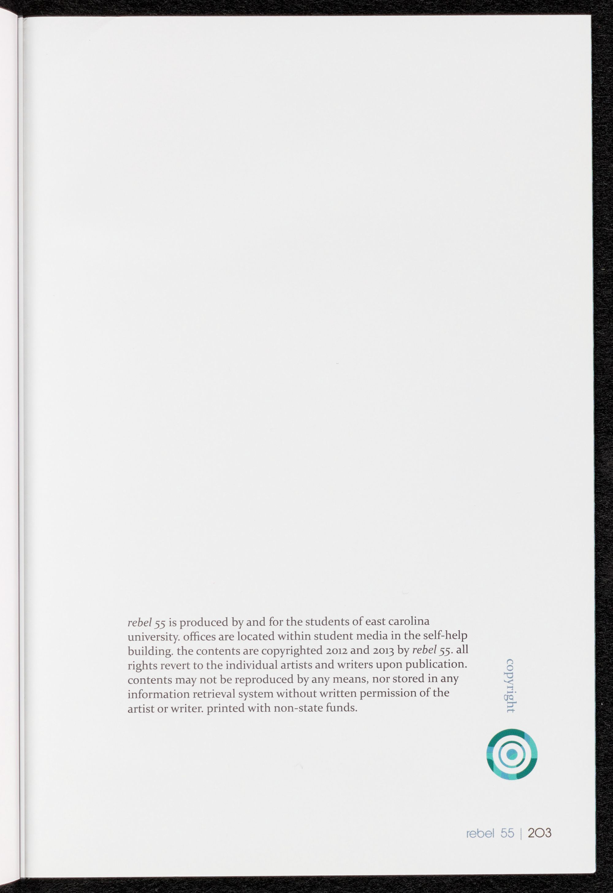 The Rebel was originally published in Fall 1958. The purpose of the magazine was to showcase the artwork and creative writing of the East Carolina University student body. The Rebel is printed with non-state funds. Beginning in the 1990s some volumes included a CD with featured music.