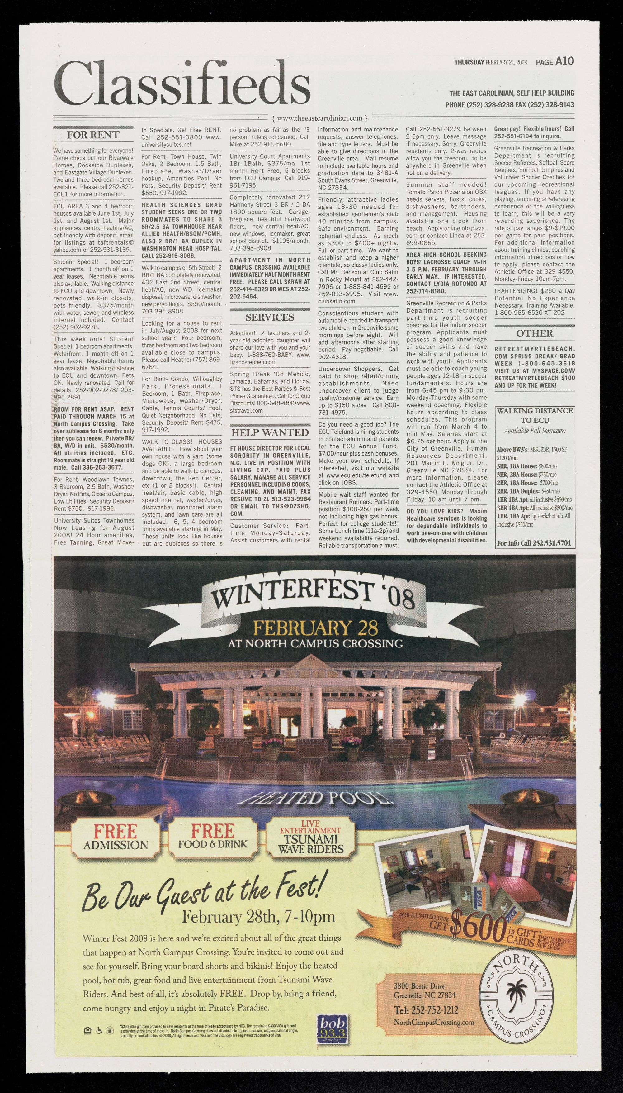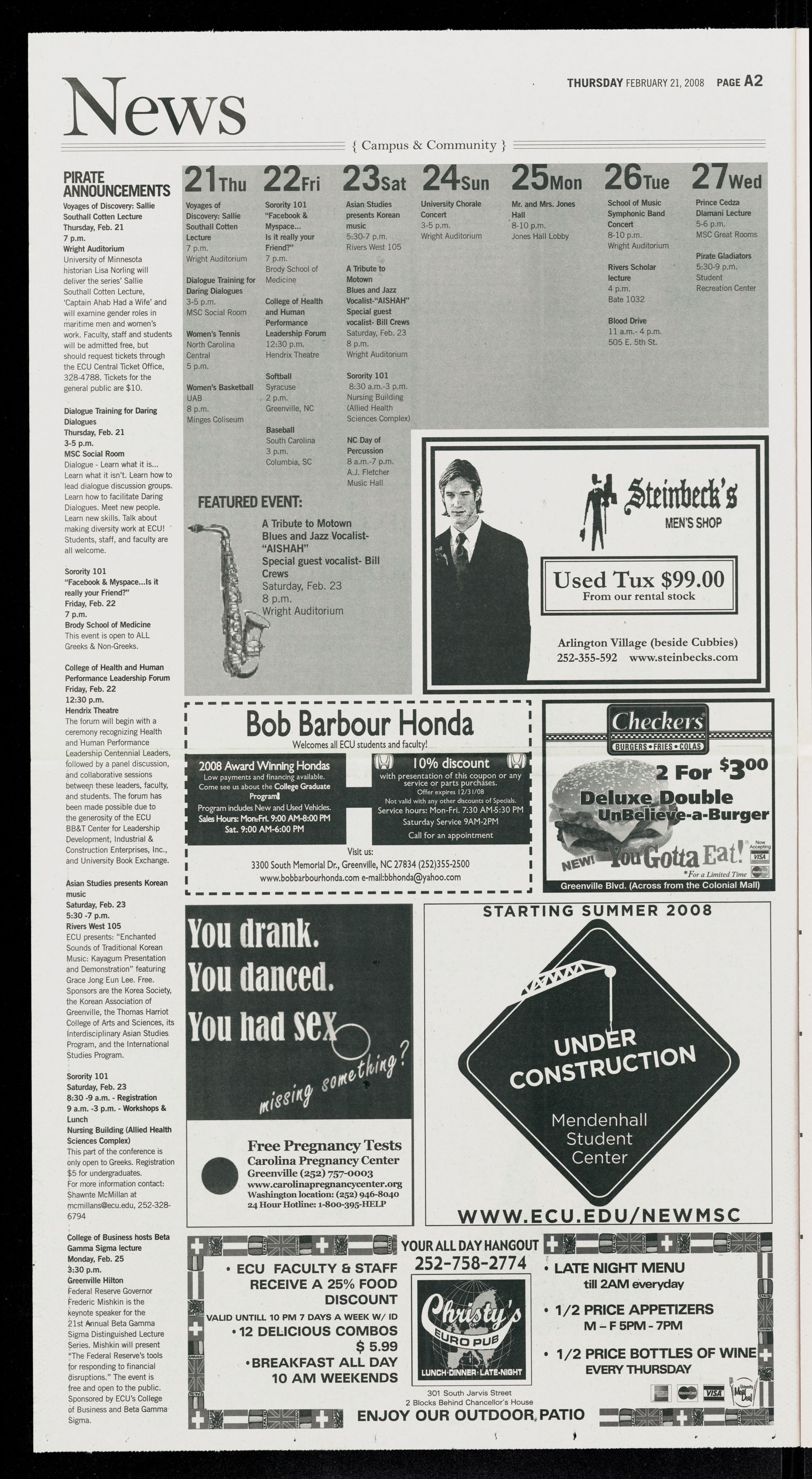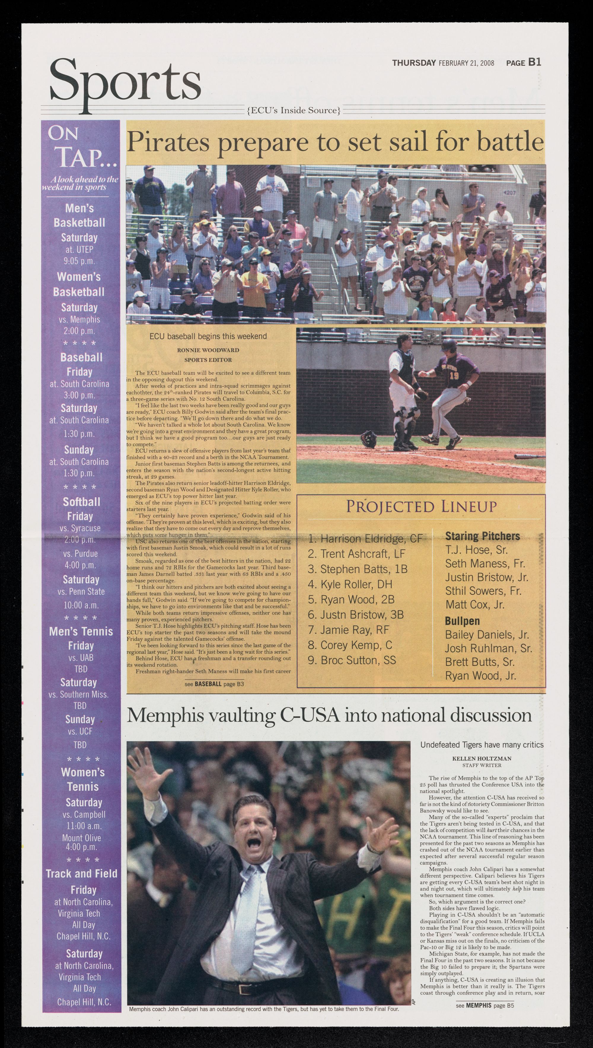 East Carolina's student-run campus newspaper was first published in 1923 as the East Carolina Teachers College News (1923-1925). It has been re-named as The Teco Echo (1925, 1926-1952), East Carolinian (1952-1969), Fountainhead (1969-1979), and The East Carolinian (1969, 1979-present). It includes local, state, national, and international stories with a focus on campus events.