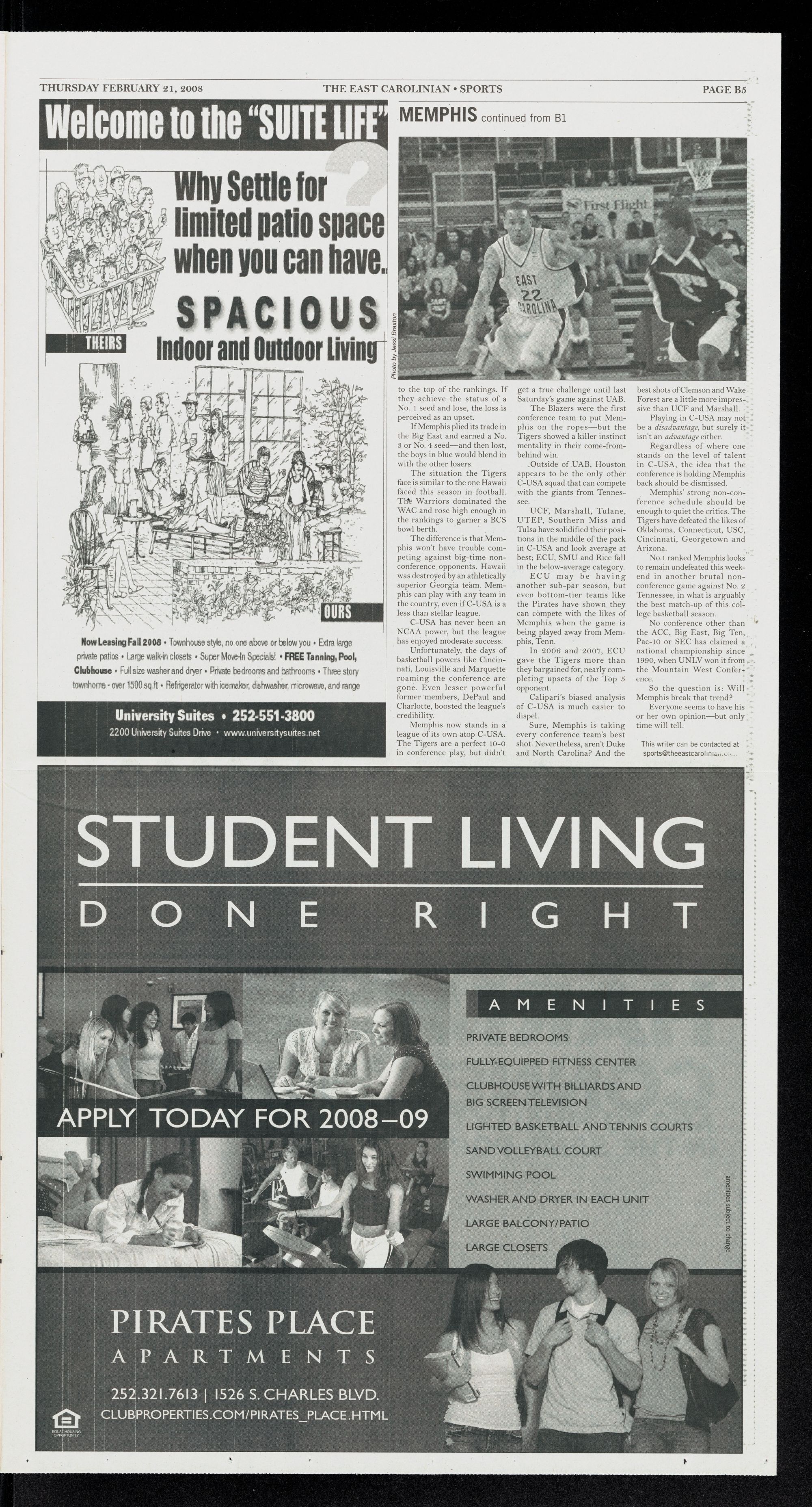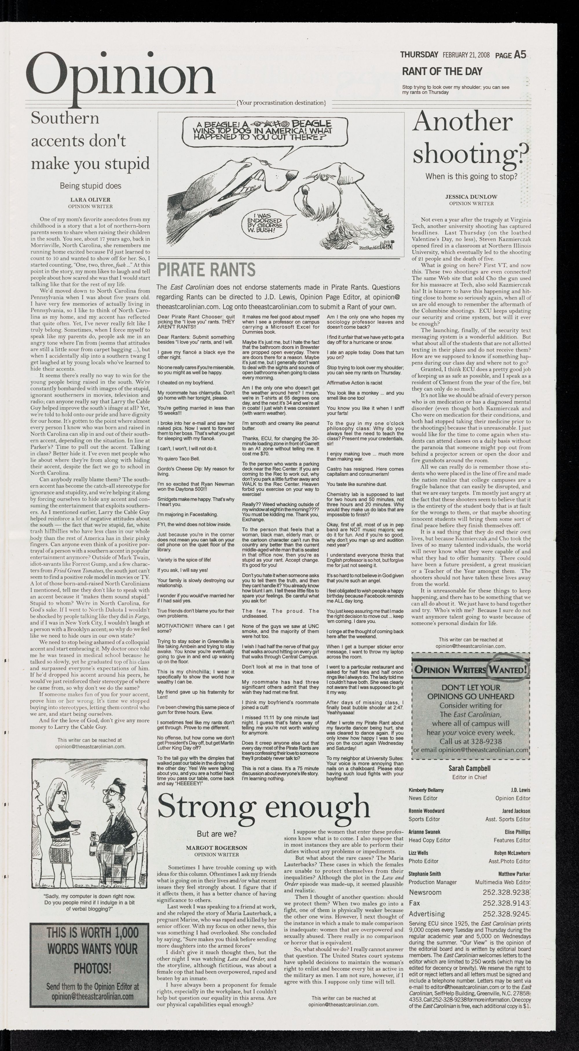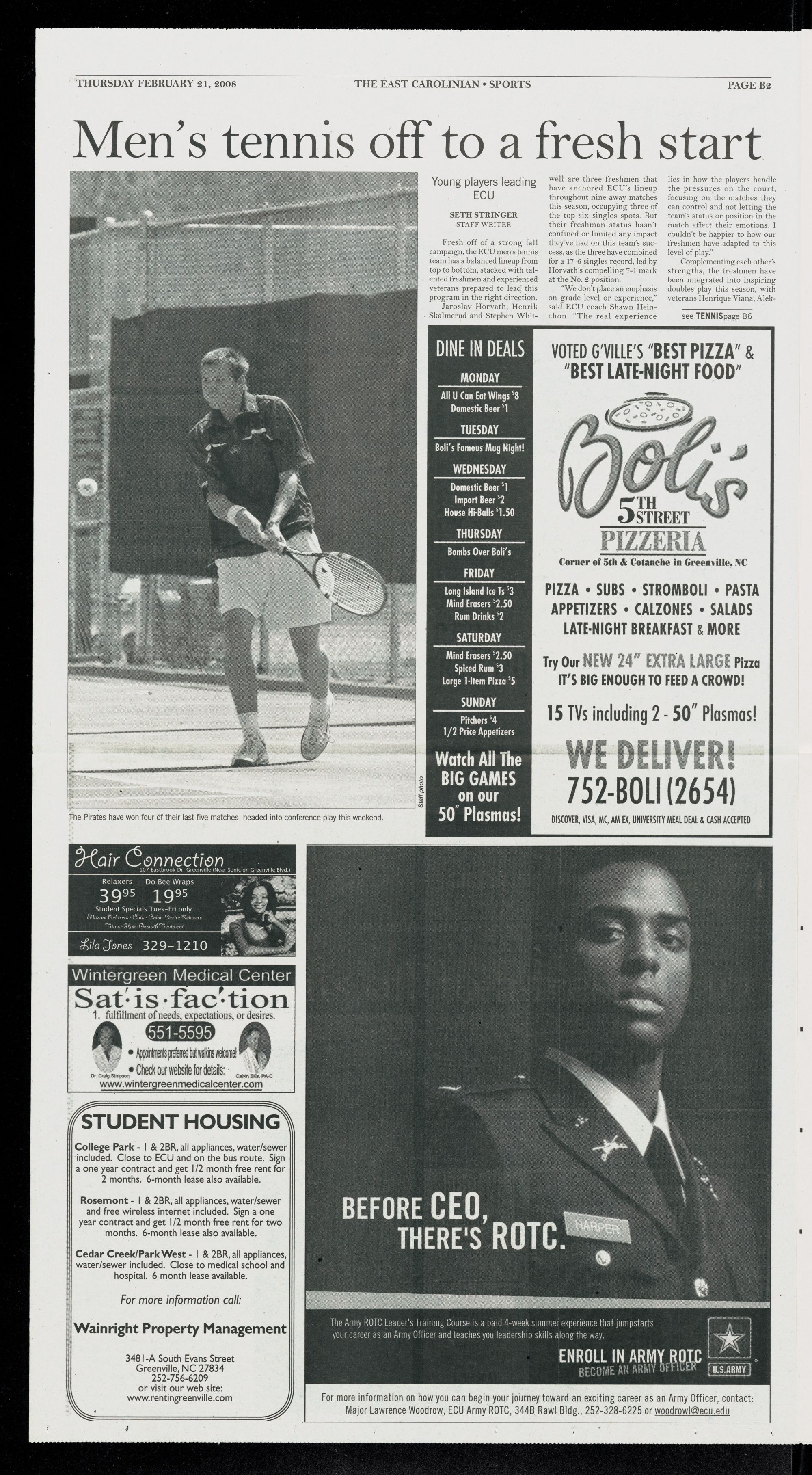East Carolina's student-run campus newspaper was first published in 1923 as the East Carolina Teachers College News (1923-1925). It has been re-named as The Teco Echo (1925, 1926-1952), East Carolinian (1952-1969), Fountainhead (1969-1979), and The East Carolinian (1969, 1979-present). It includes local, state, national, and international stories with a focus on campus events.